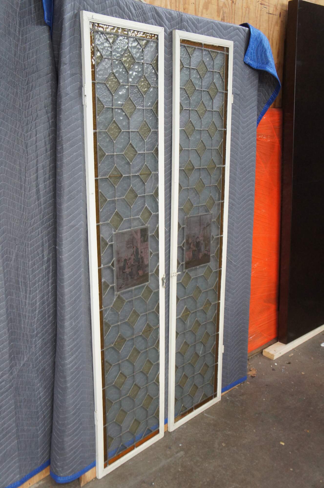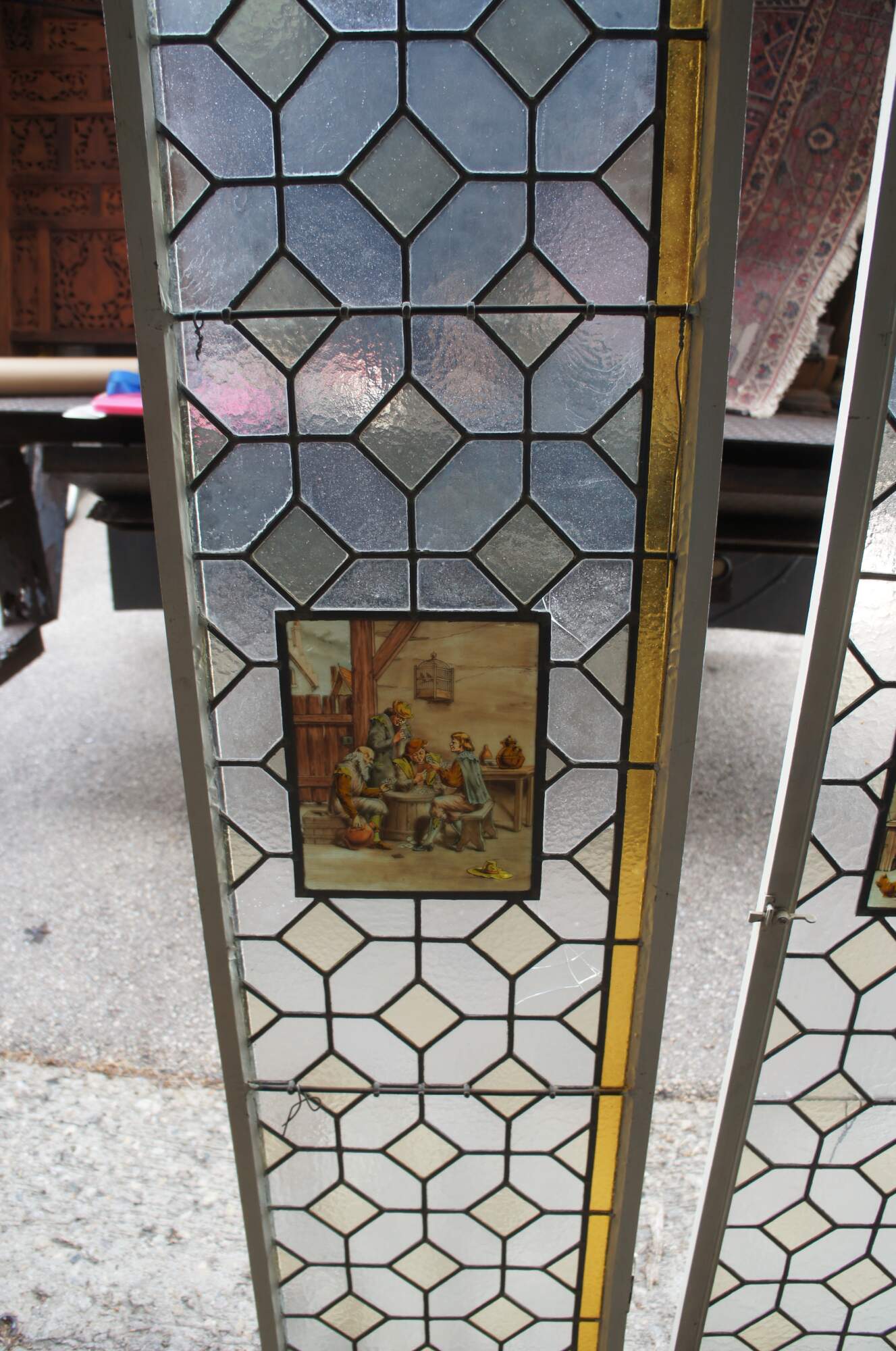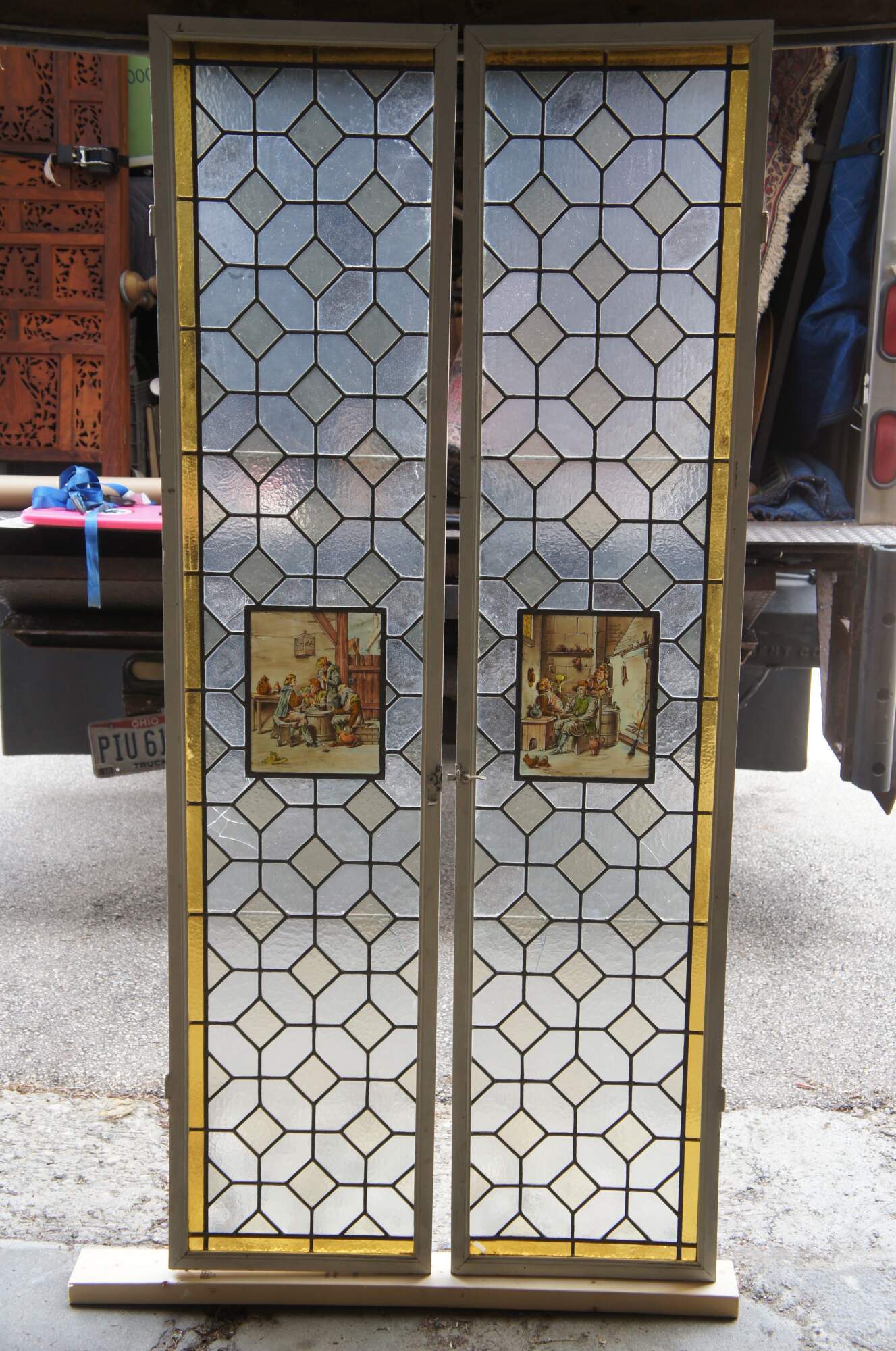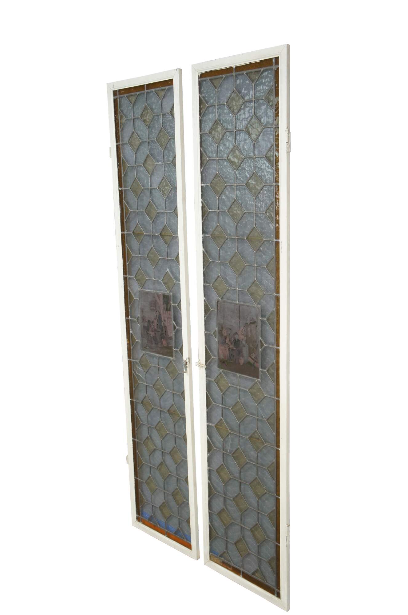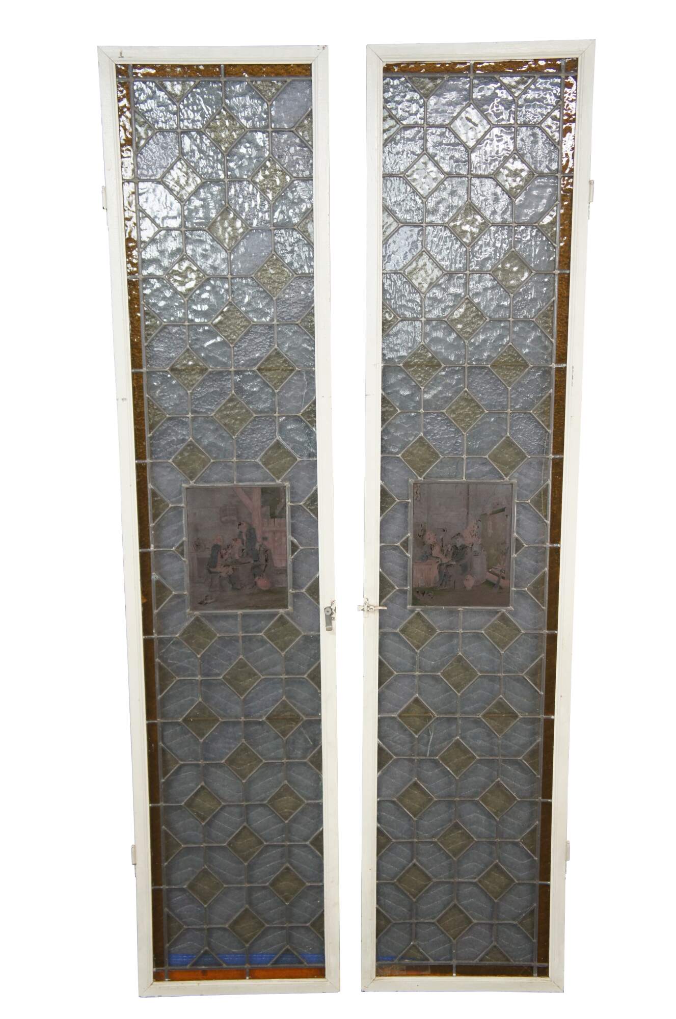 A set of antique European leaded stained glass windows. Features a geometric diamond pattern set within a wooden frame. Each window showcases a beautiful painted pub scene at the center. The windows have a latch at the center from where they were originally opened and closed.