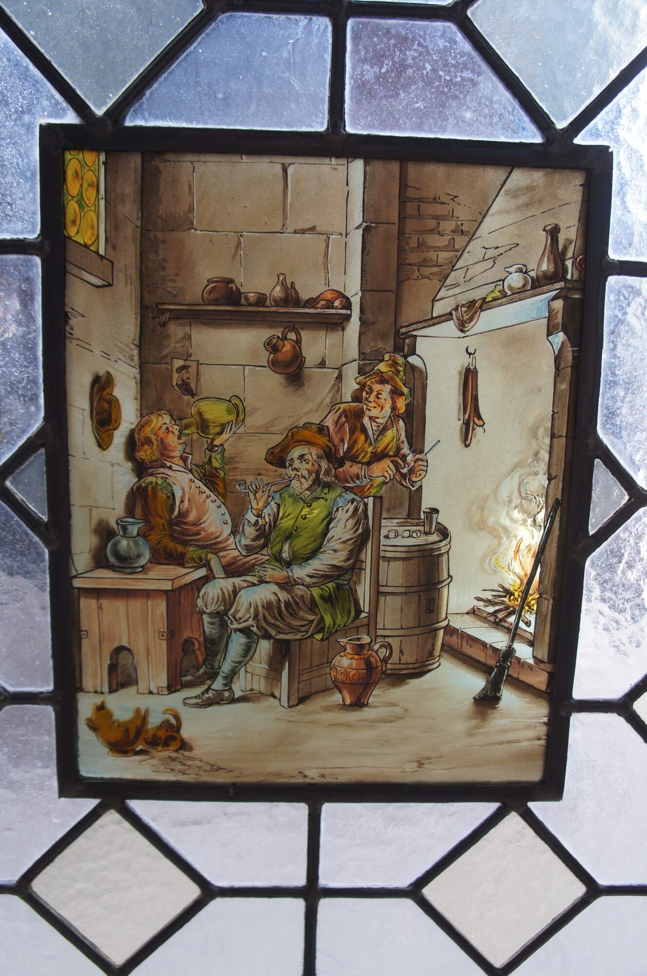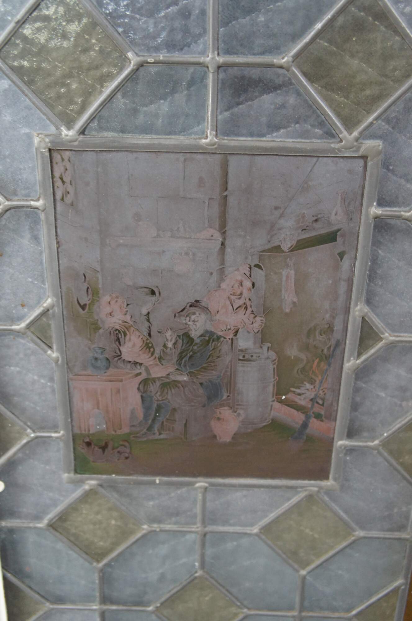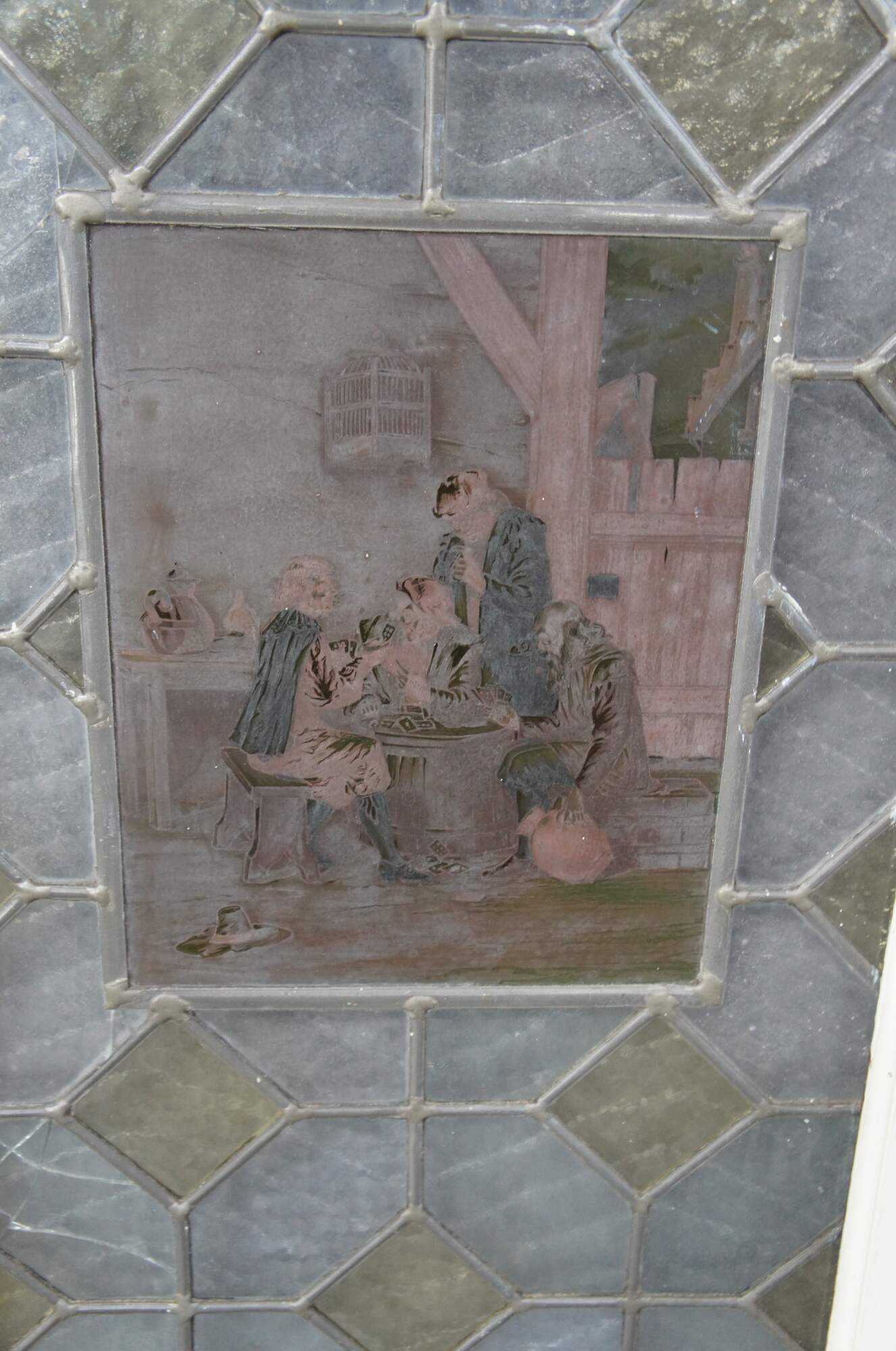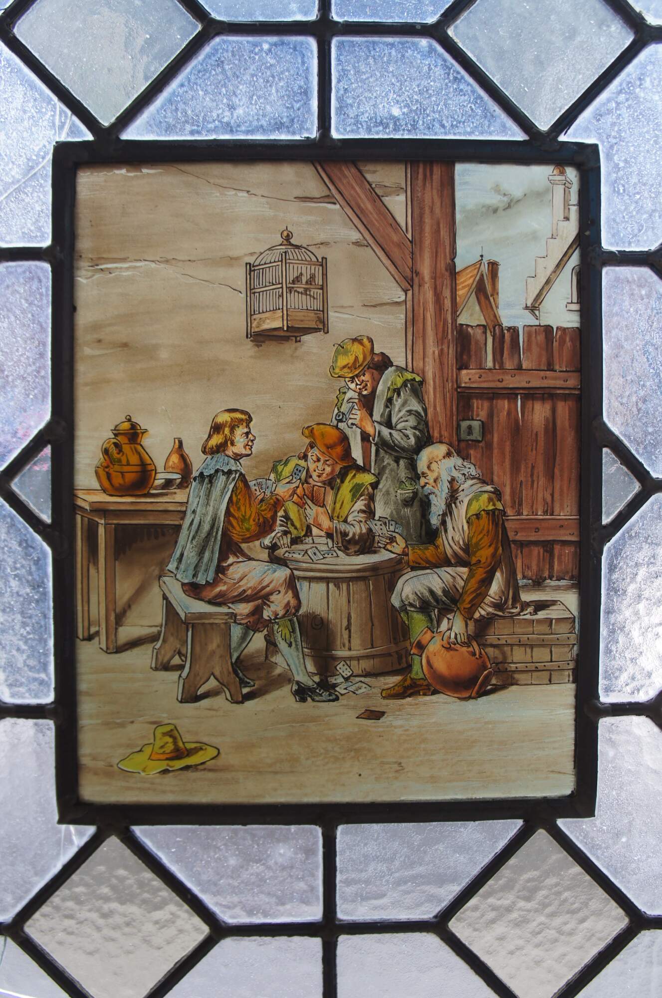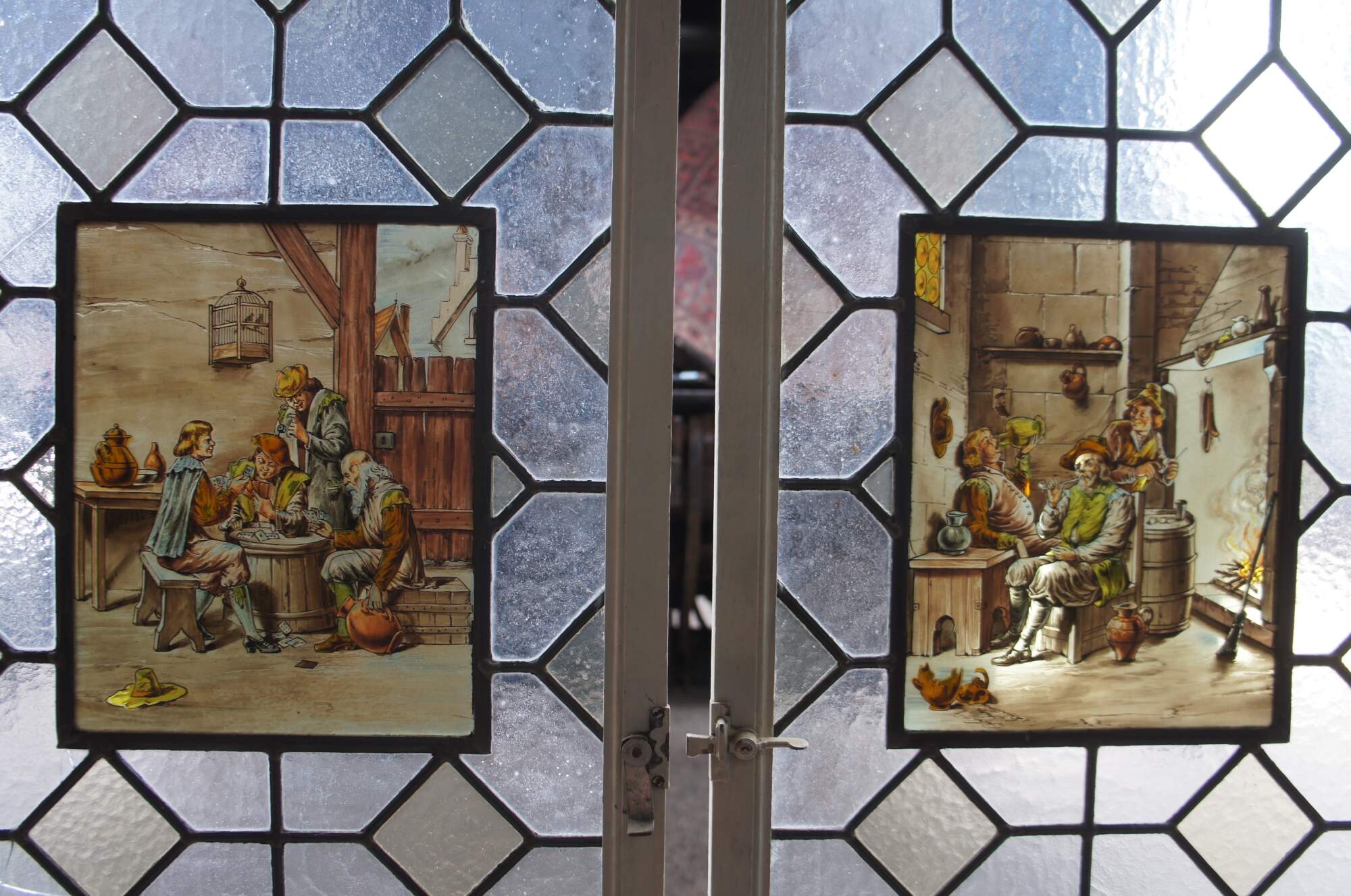 A set of antique European leaded stained glass windows. Features a geometric diamond pattern set within a wooden frame. Each window showcases a beautiful painted pub scene at the center. The windows have a latch at the center from where they were originally opened and closed.