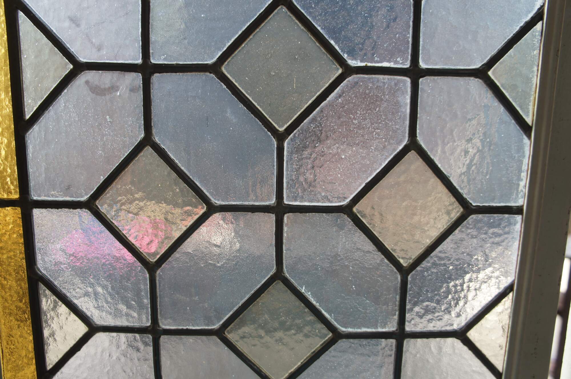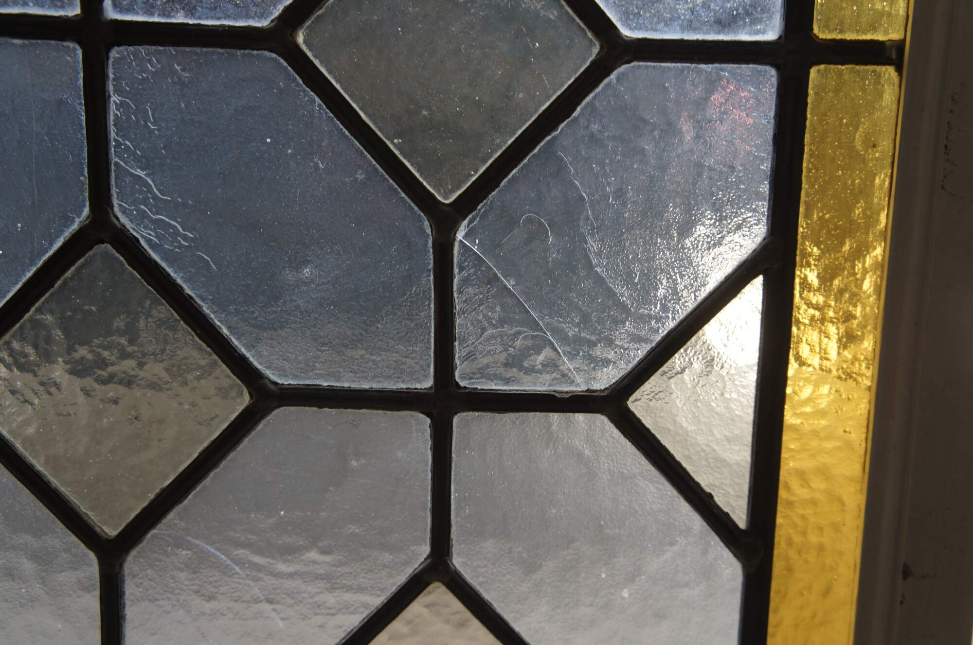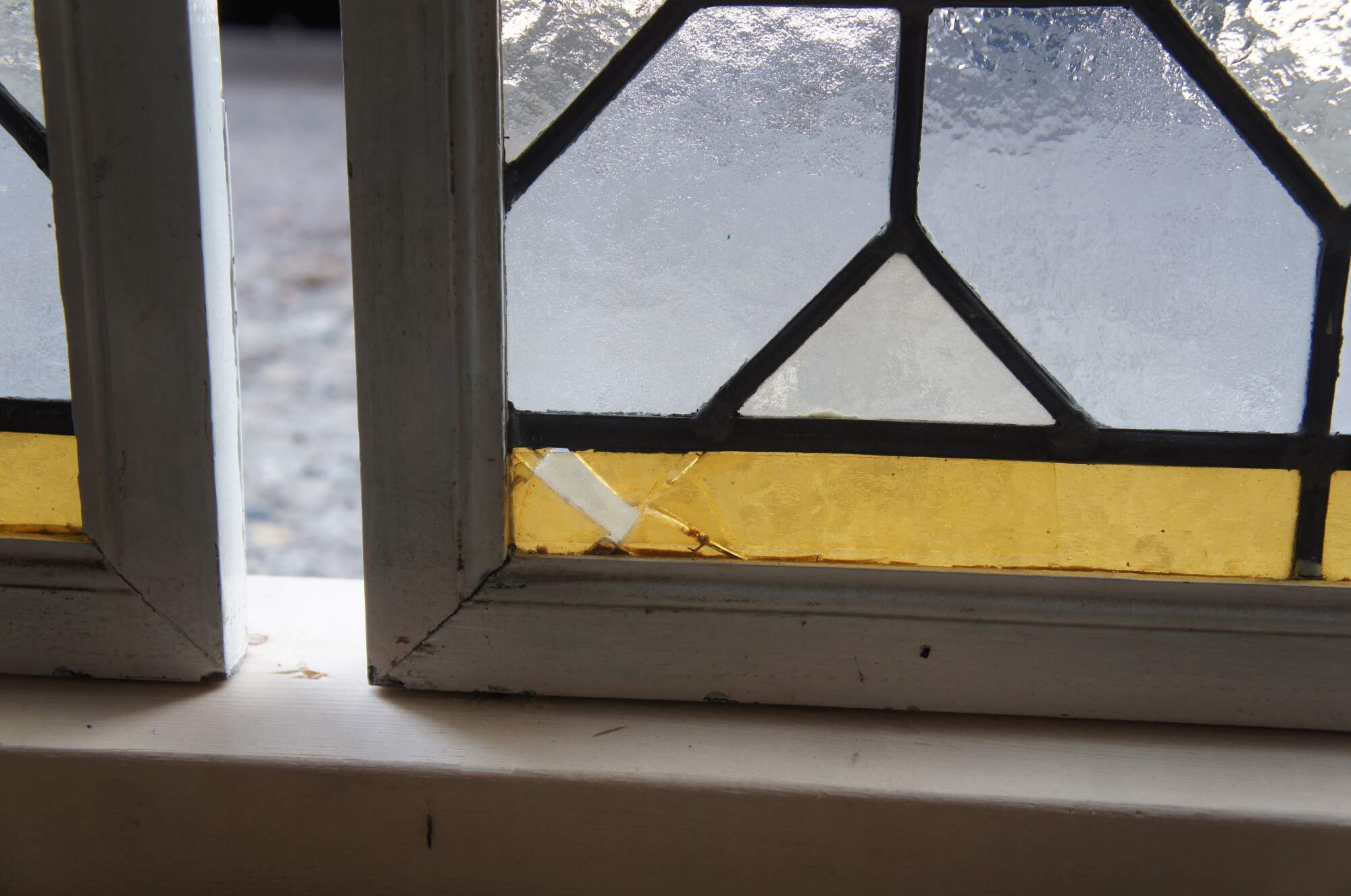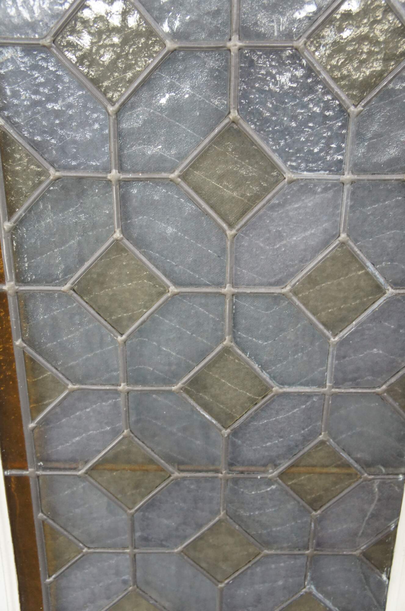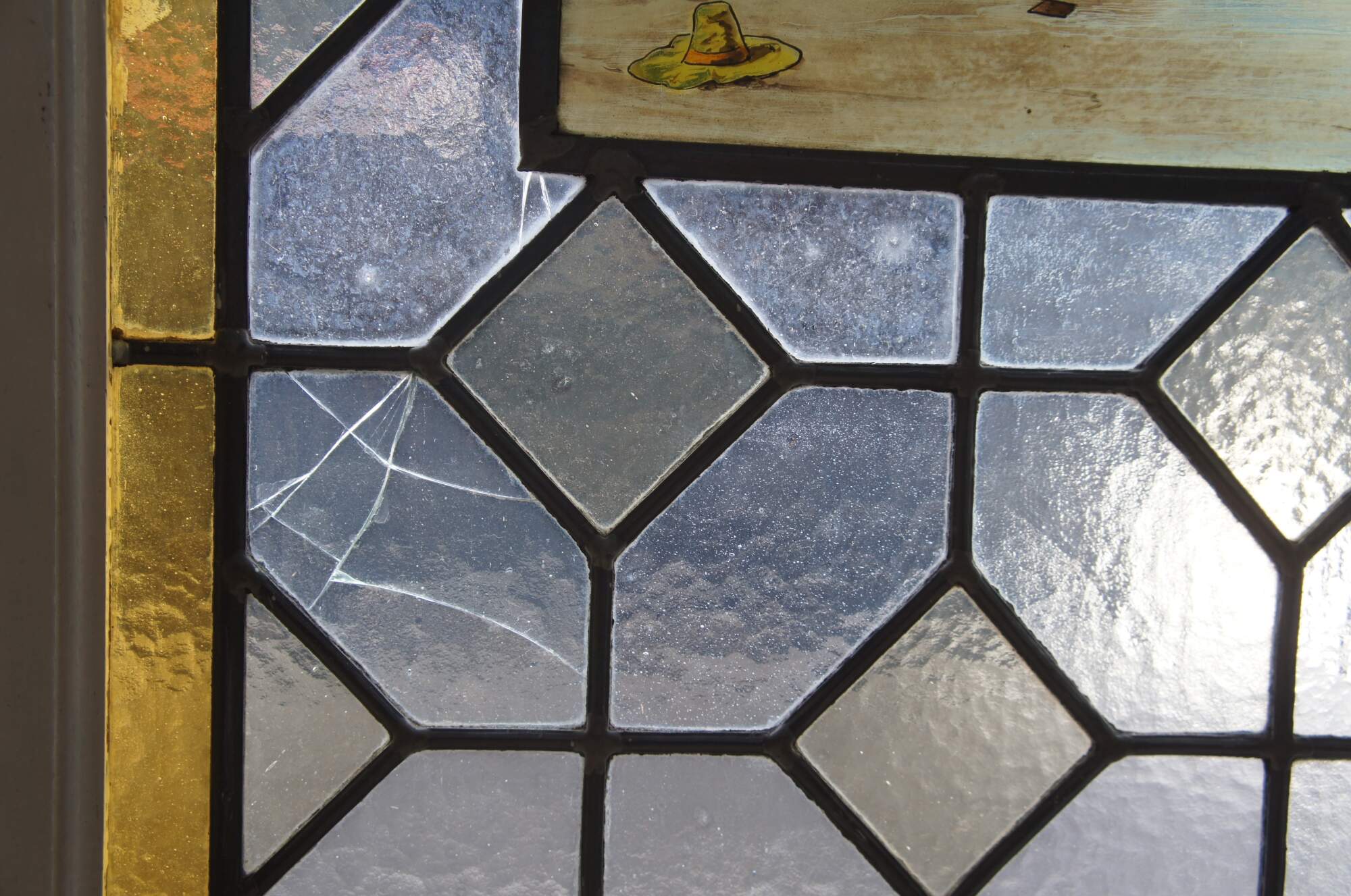 A set of antique European leaded stained glass windows. Features a geometric diamond pattern set within a wooden frame. Each window showcases a beautiful painted pub scene at the center. The windows have a latch at the center from where they were originally opened and closed.