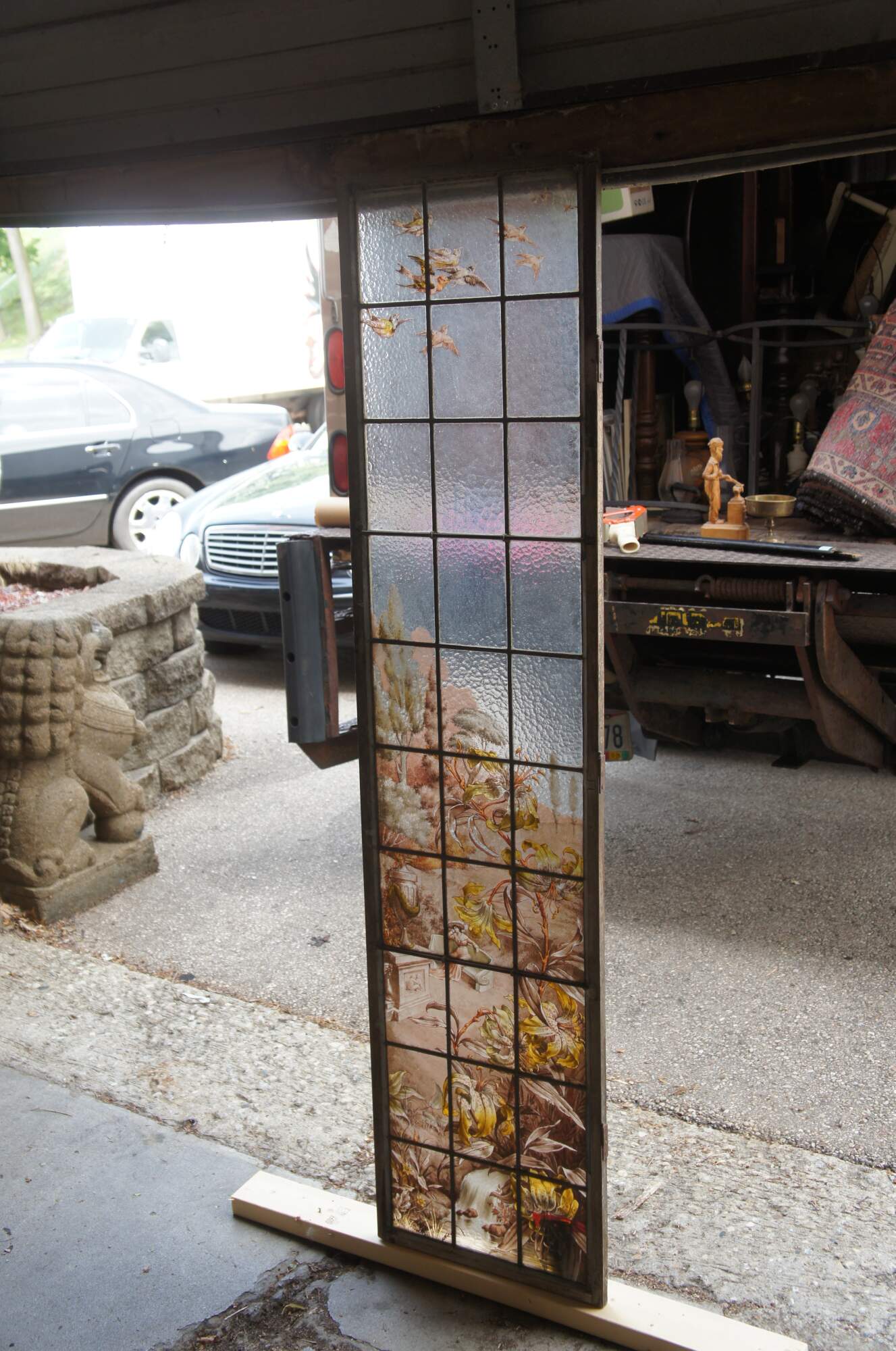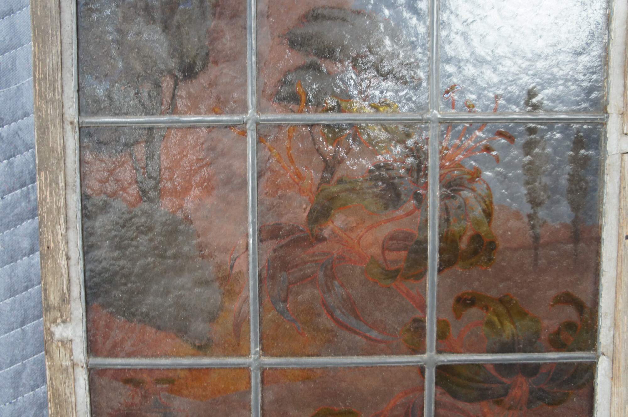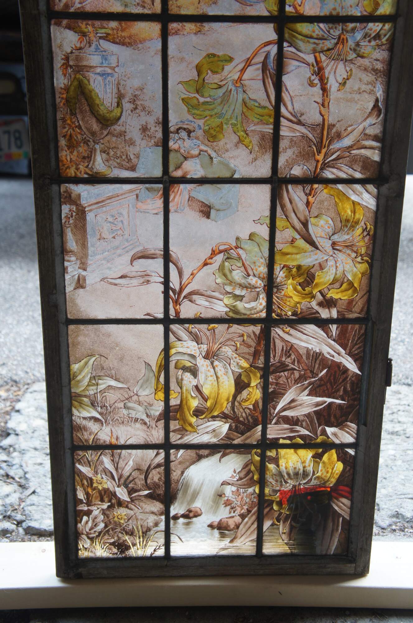 Vintage large French painted and fired stained glass window. Features a Victorian garden scene with a woman seated in the garden amidst beautiful flowing gardens.