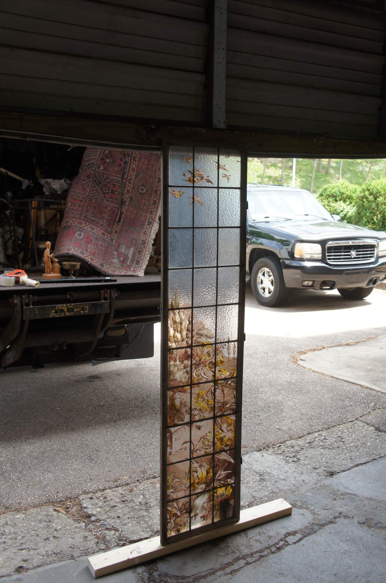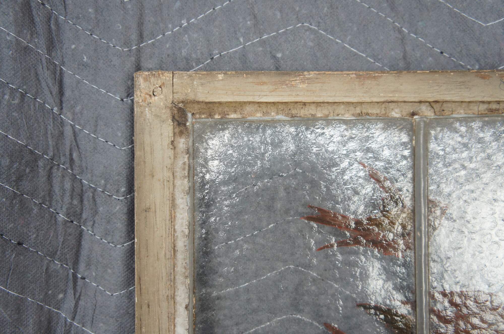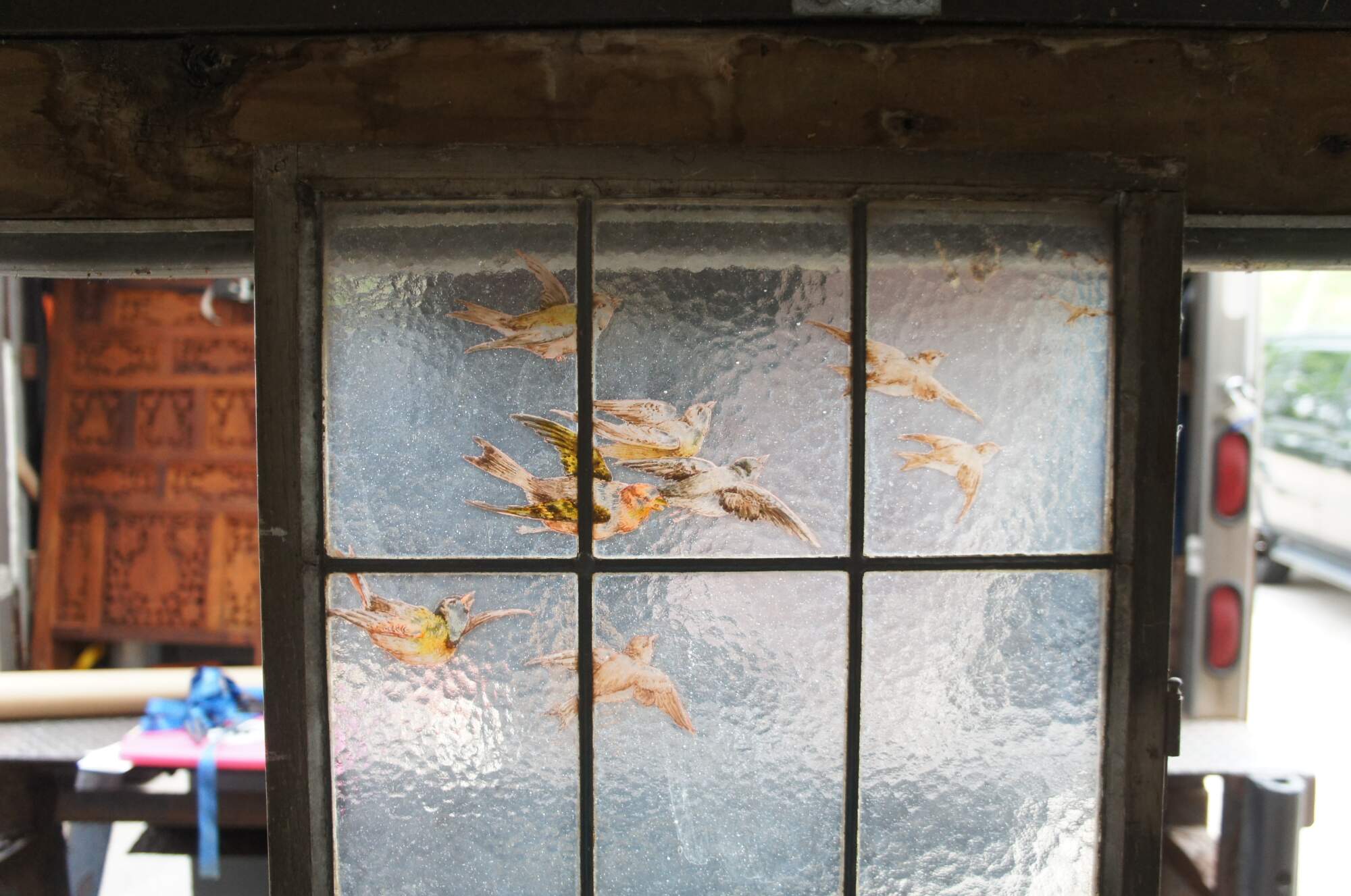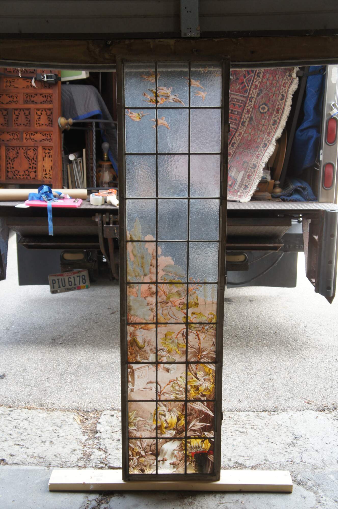 Vintage large French painted and fired stained glass window. Features a Victorian garden scene with a woman seated in the garden amidst beautiful flowing gardens.