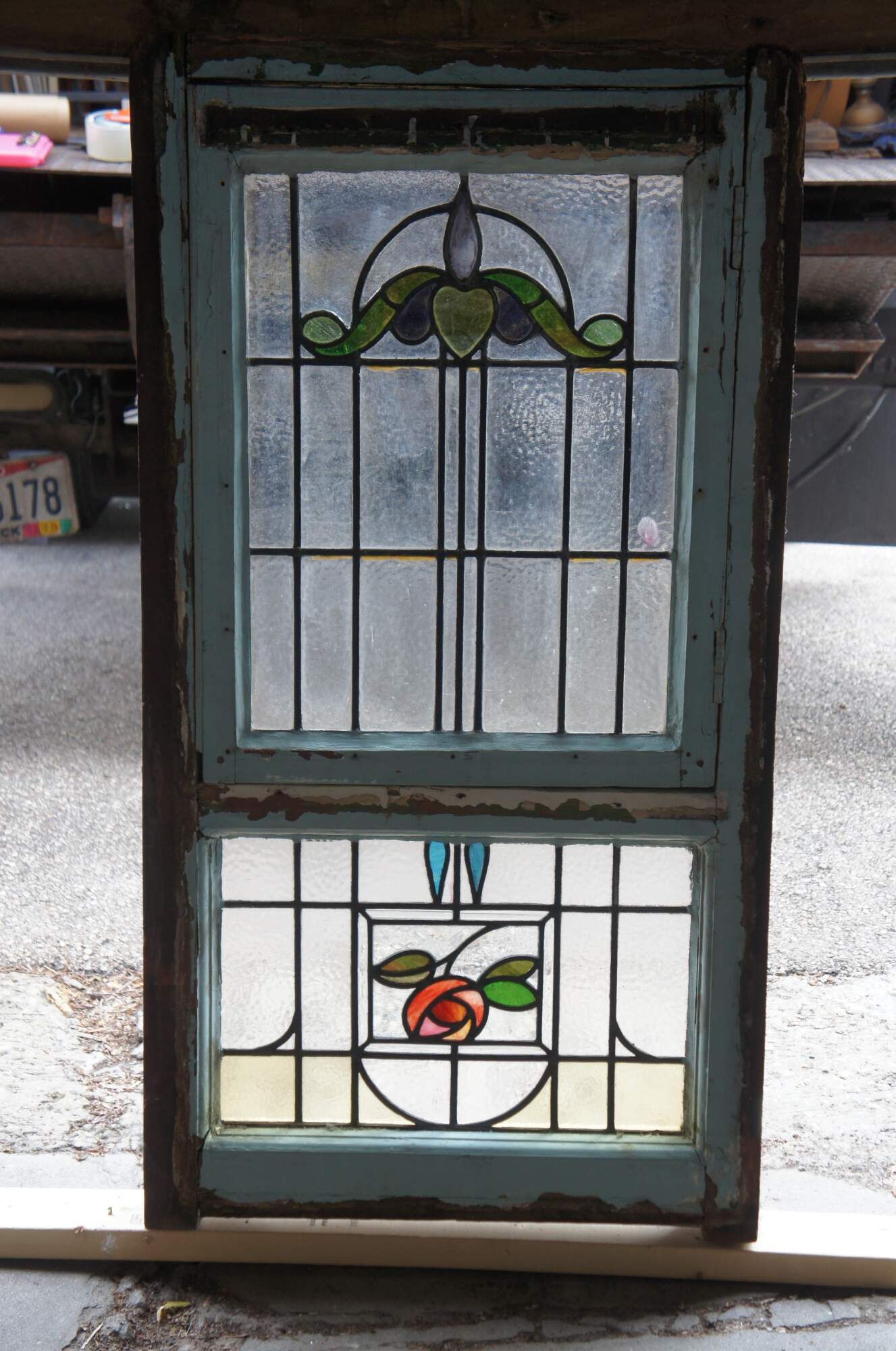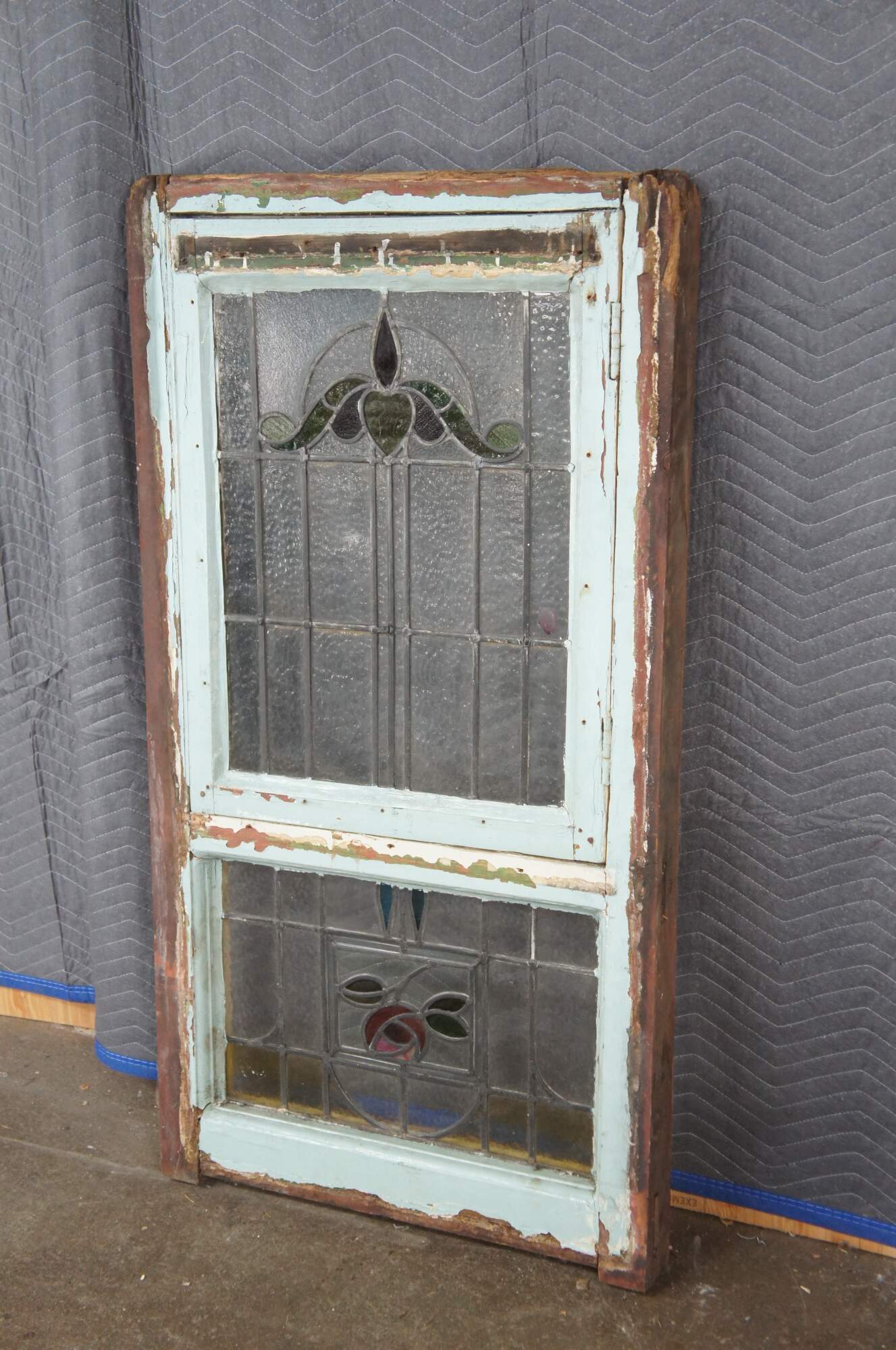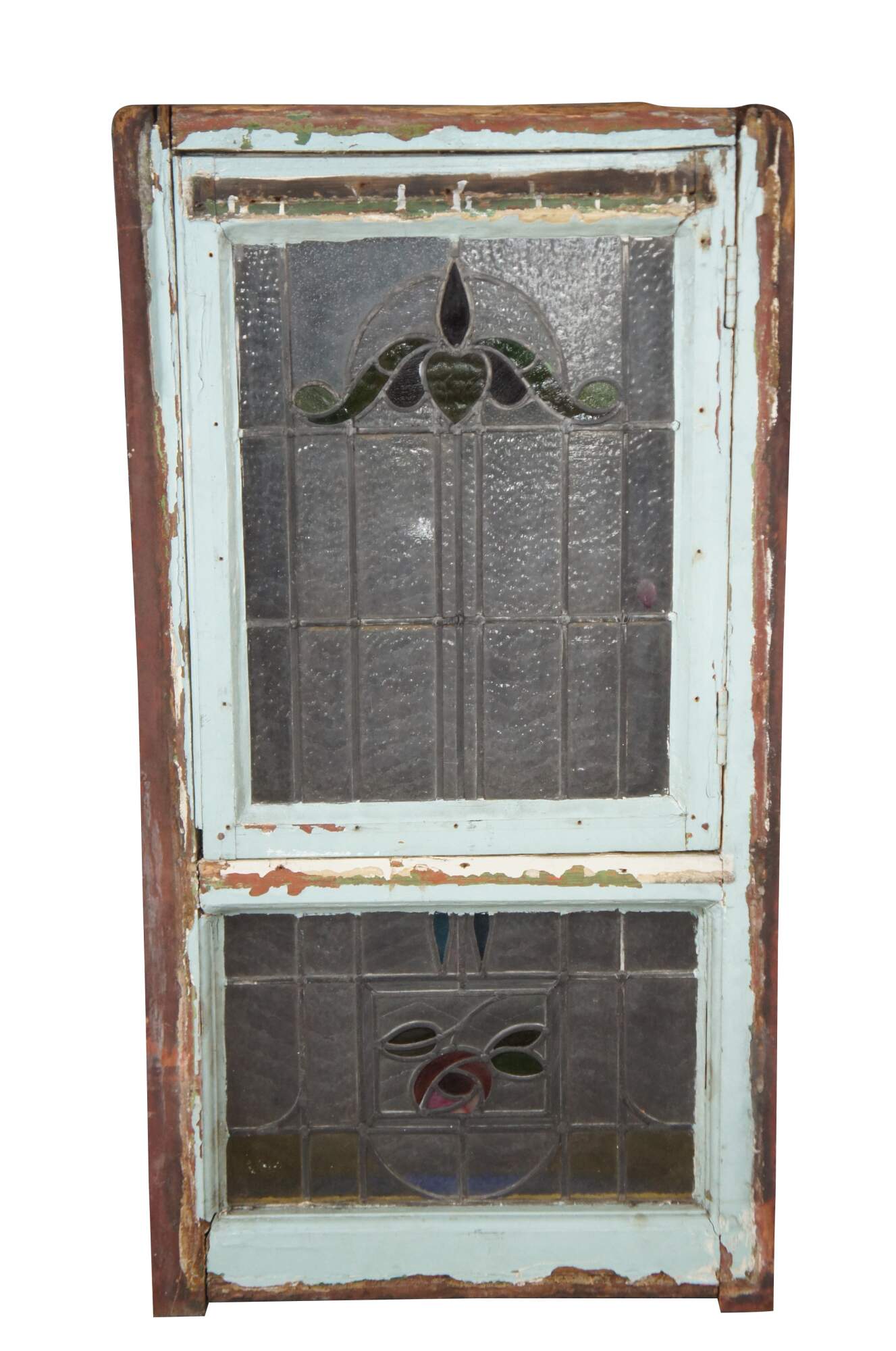 Exquisite reclaimed two part late 19th century leaded stained glass window. Features a large rectangular frame with a large hinged window / door over a transom. Each window is designed with clear, pebbled and textured glass set around ornate floral designs showcasing colors of blue, green, and red. The glass is set within large original pine frames. A large salvaged window that will make for the perfect addition to any space.