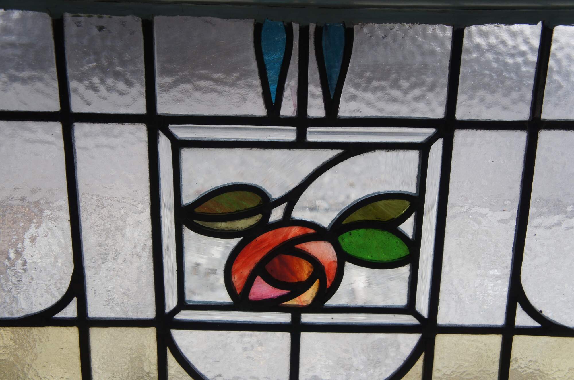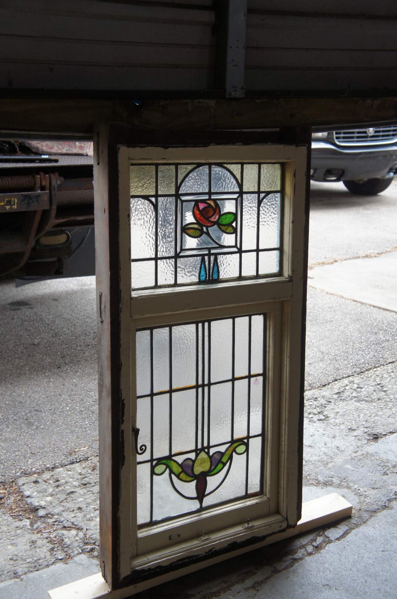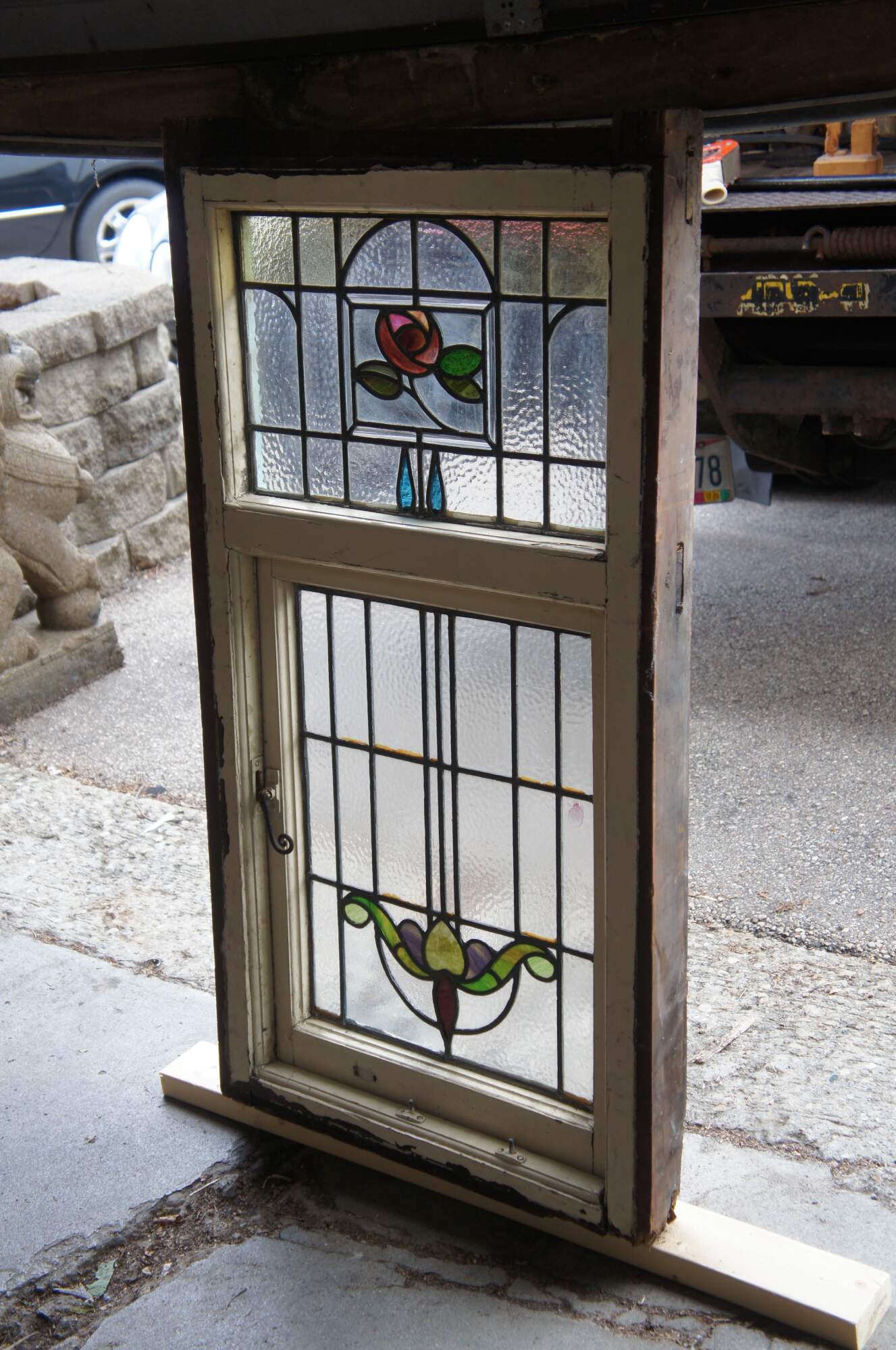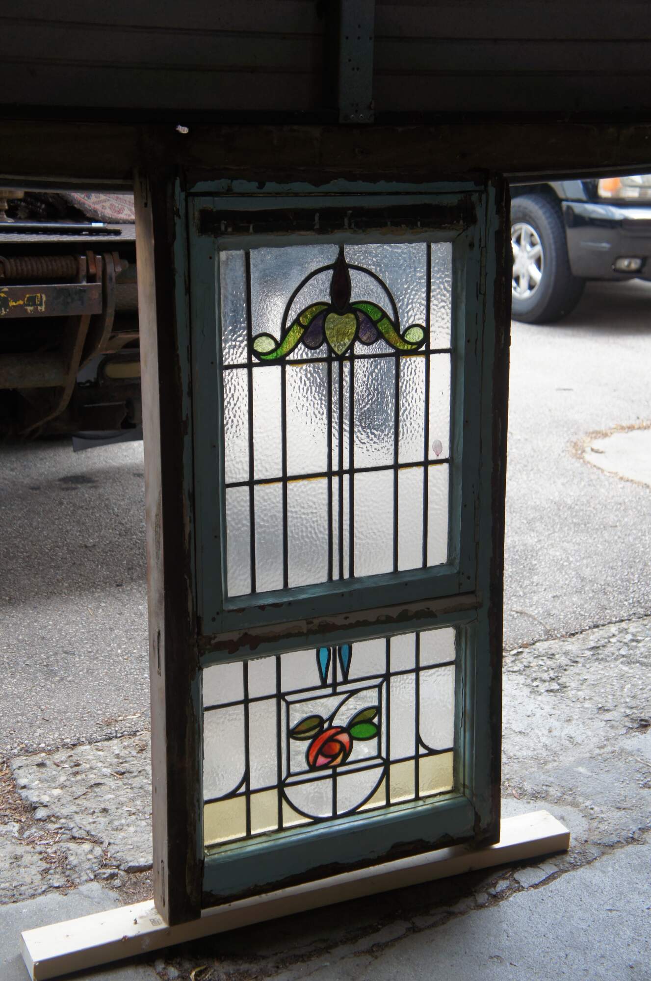 Exquisite reclaimed two part late 19th century leaded stained glass window. Features a large rectangular frame with a large hinged window / door over a transom. Each window is designed with clear, pebbled and textured glass set around ornate floral designs showcasing colors of blue, green, and red. The glass is set within large original pine frames. A large salvaged window that will make for the perfect addition to any space.