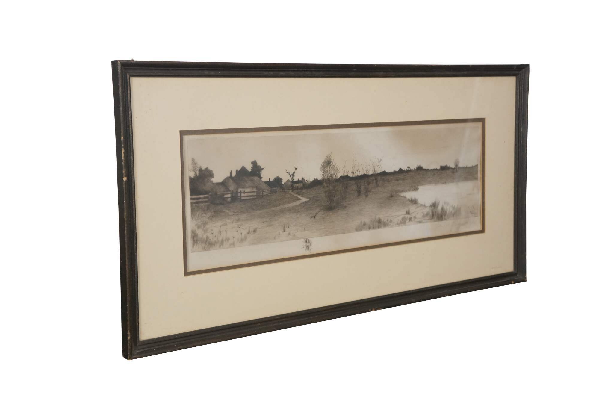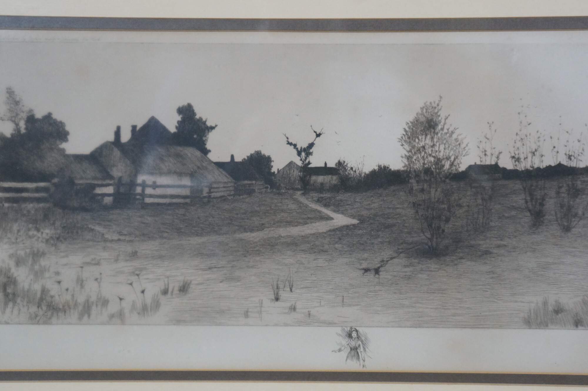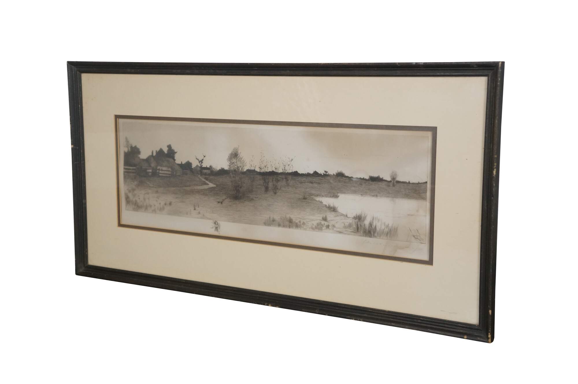 Antique circa 1890 black and white etching by Henry M. Rosenberg, showing panoramic country landscape with cottages and a pond - likely the Old Cottage at Margaretville. Signed in plate H.M. Rosenberg 90 Jan. Pencil signed below right corner. Remarke of a woman in Victorian dress along lower edge. Grooved / beveled wood frame; white and brown layered mat.