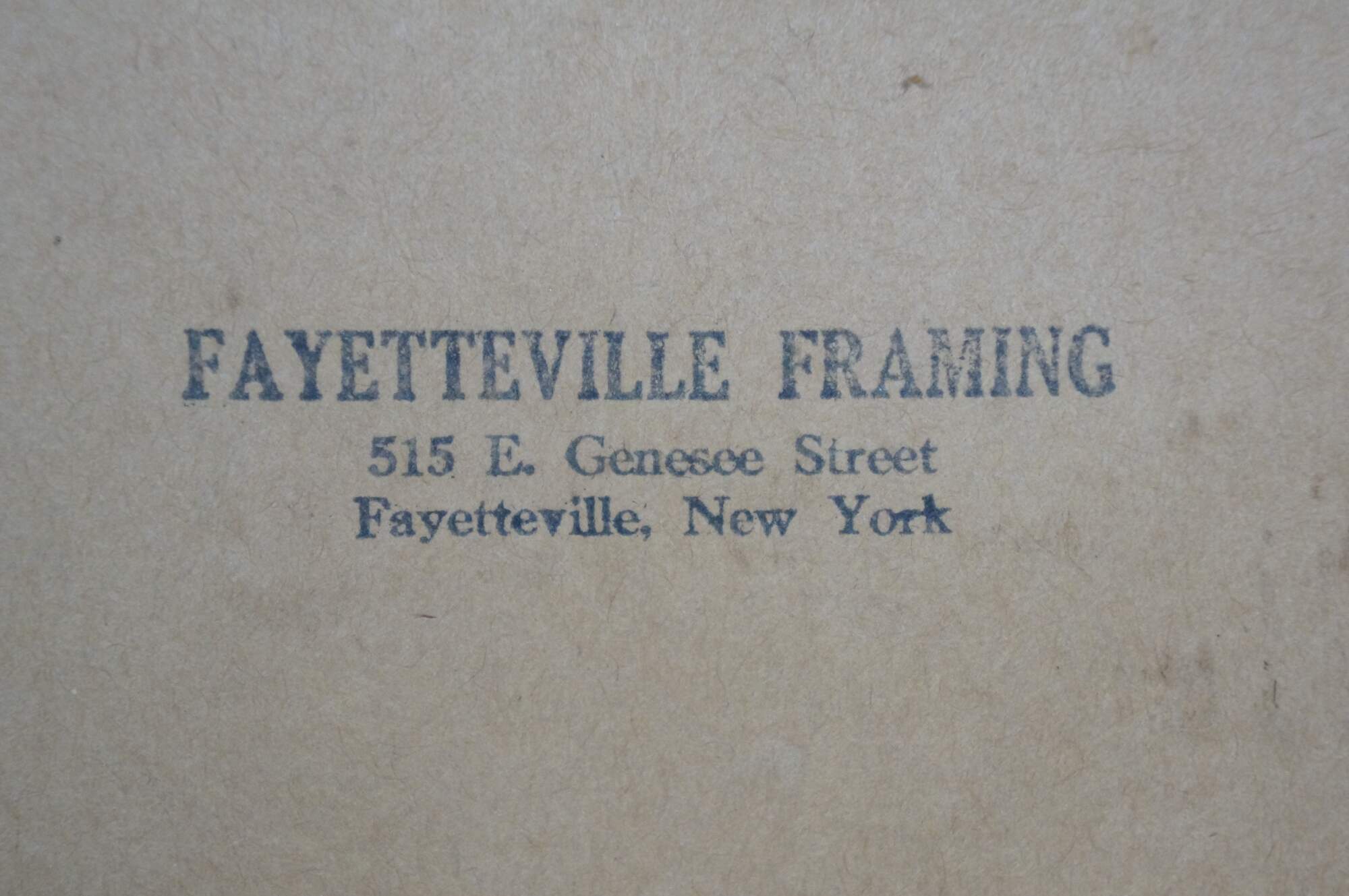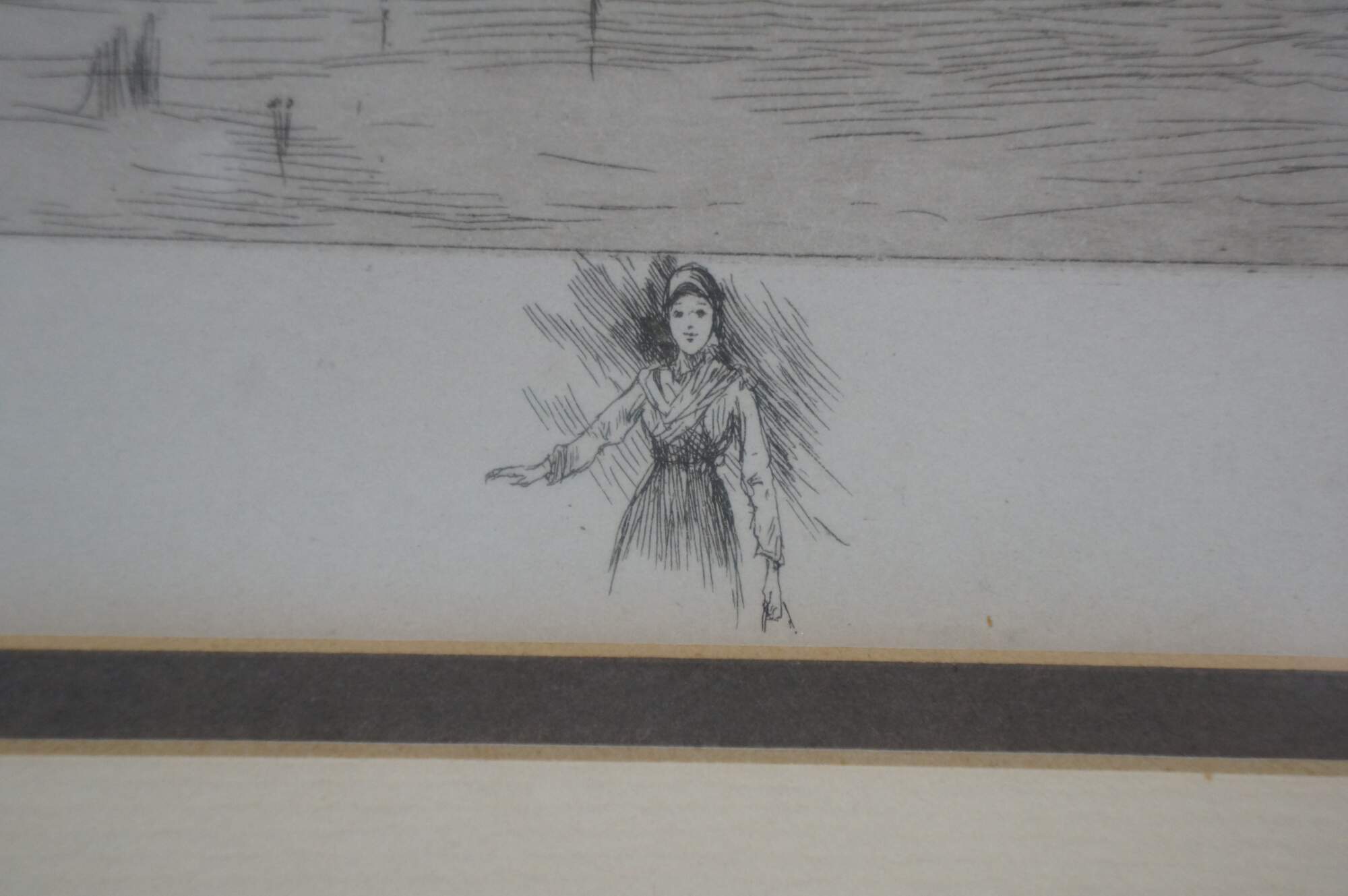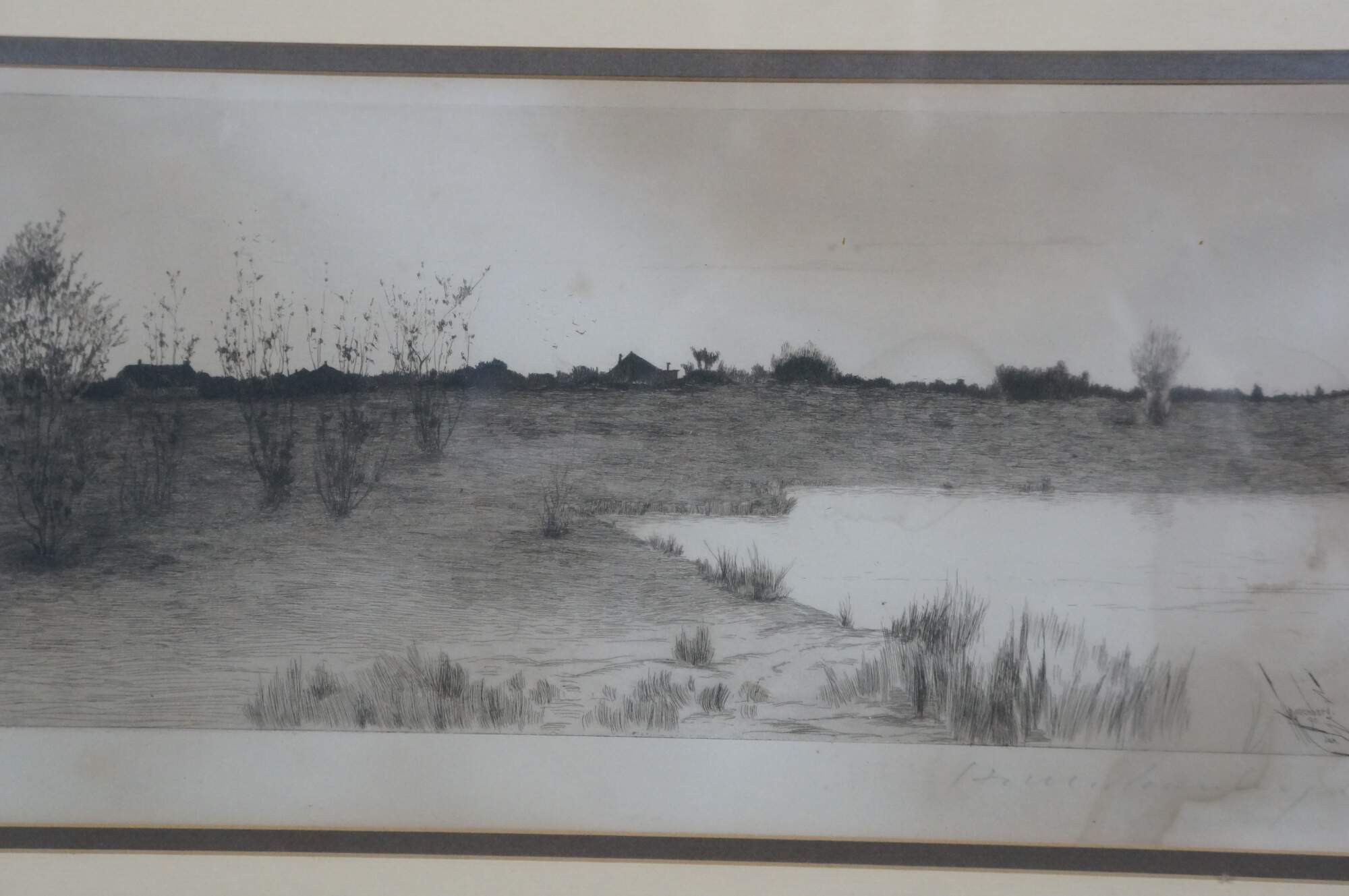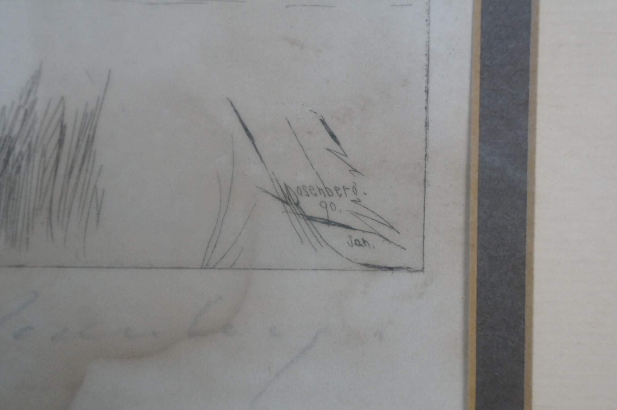 Antique circa 1890 black and white etching by Henry M. Rosenberg, showing panoramic country landscape with cottages and a pond - likely the Old Cottage at Margaretville. Signed in plate H.M. Rosenberg 90 Jan. Pencil signed below right corner. Remarke of a woman in Victorian dress along lower edge. Grooved / beveled wood frame; white and brown layered mat.