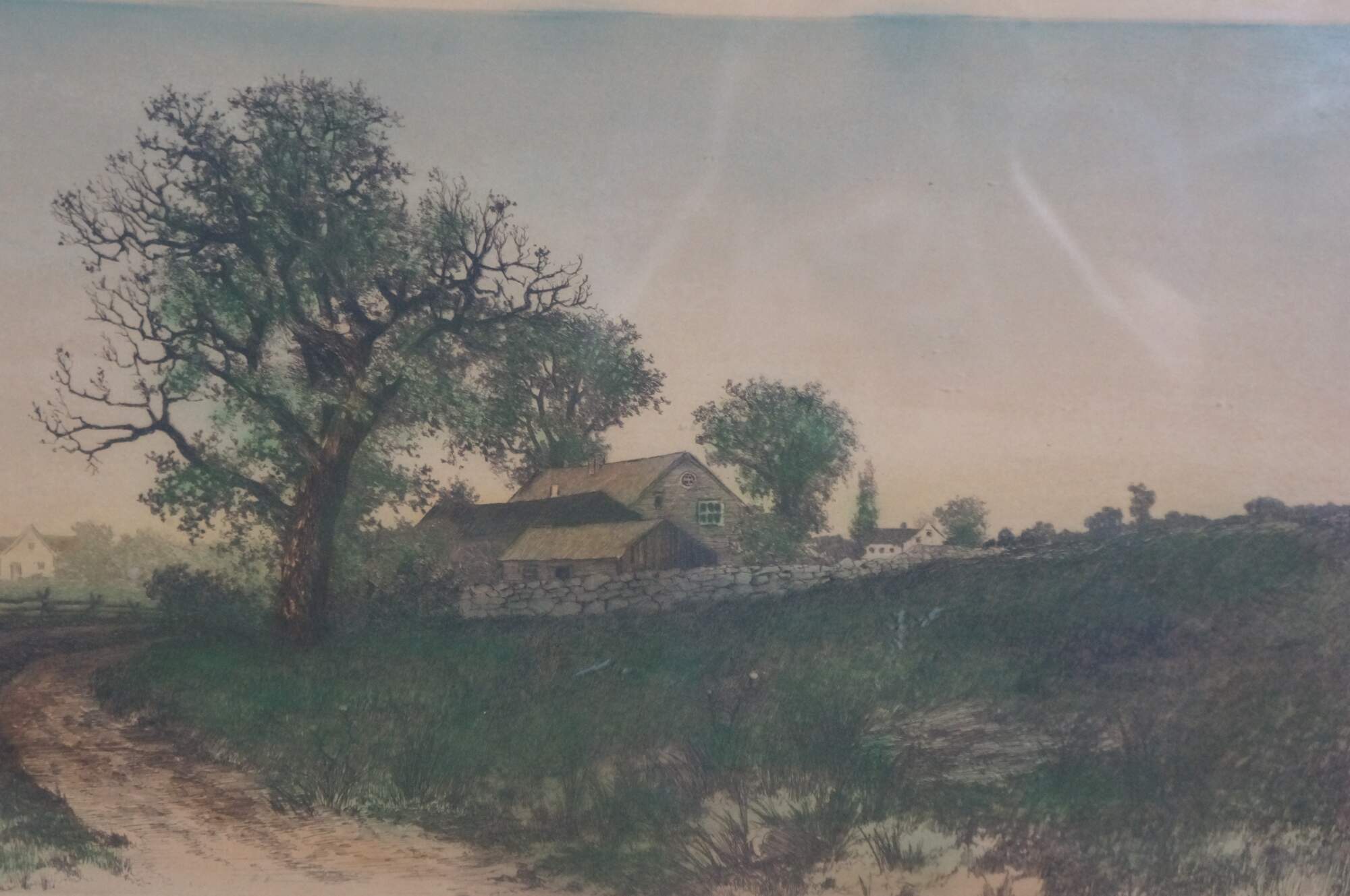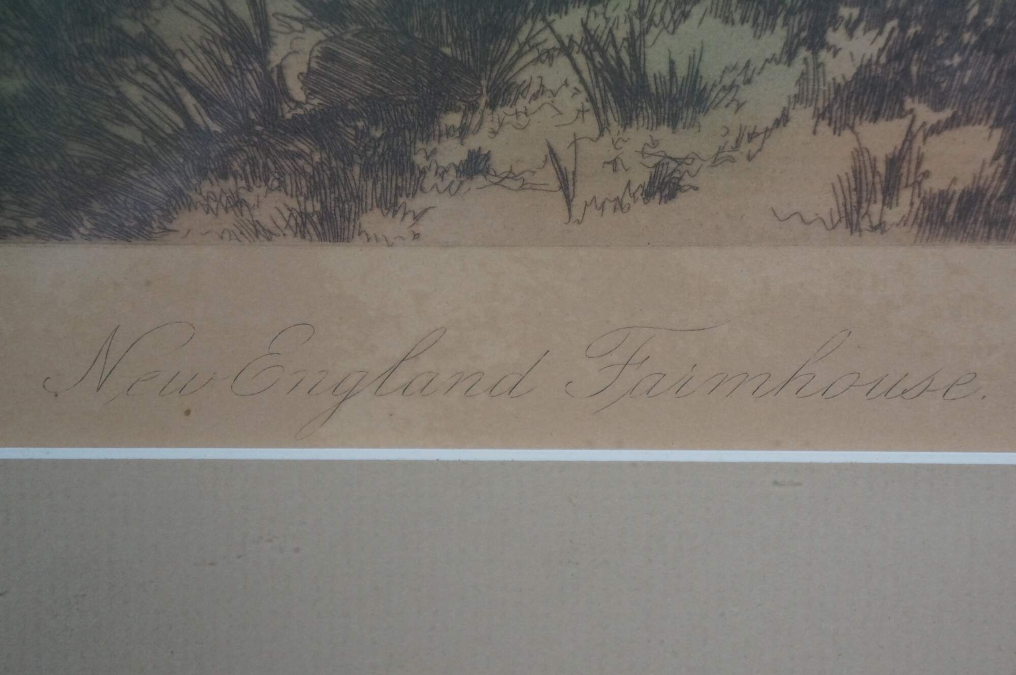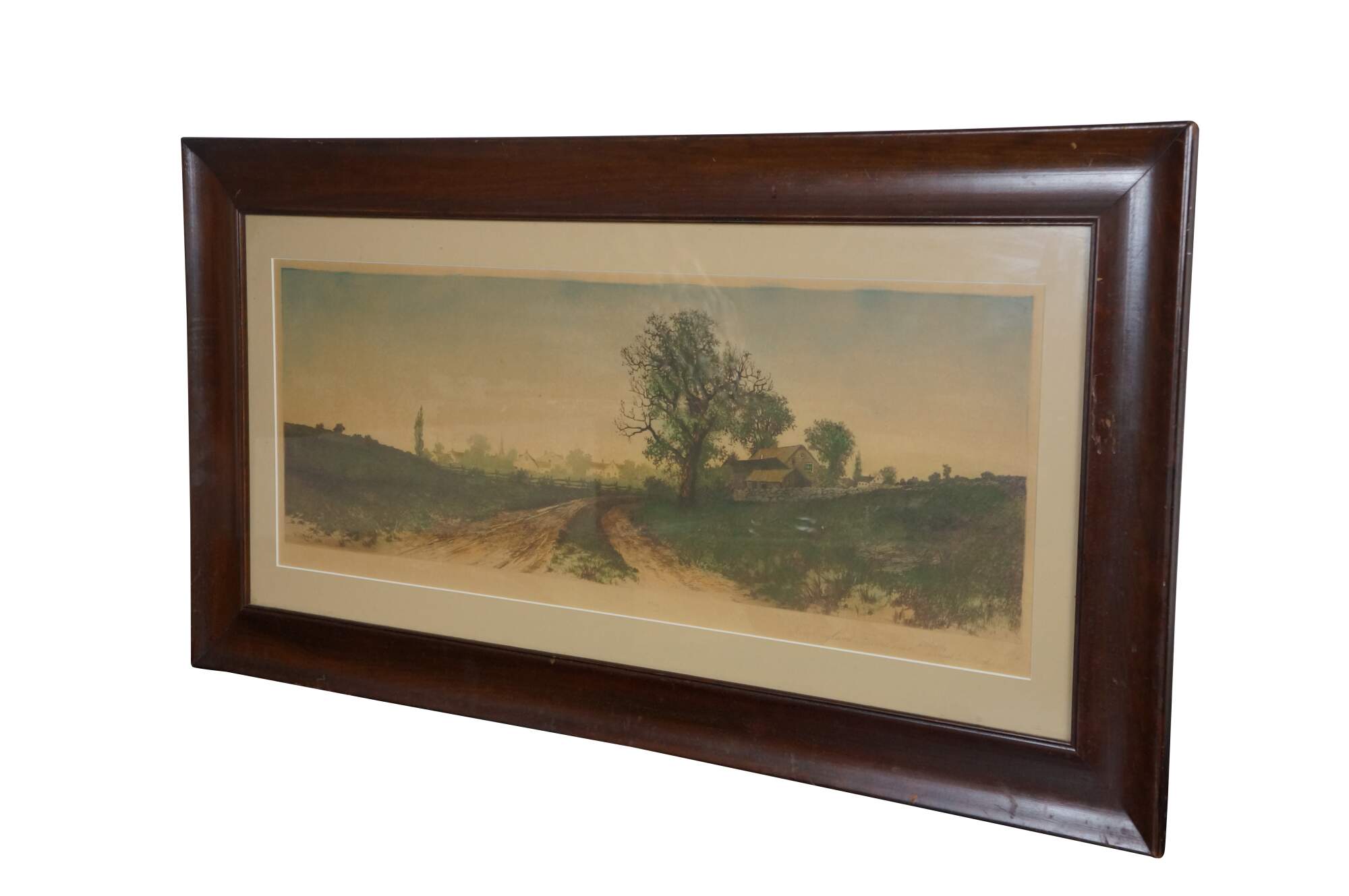 Late 19th century hand colored etching titled "New England Farmhouse" by Ernest C. Rost. Panoramic landscape of a country roas curving past a stone farmhouse, with a village in the distance. Signed in plate EC Rost 1890, lower left. Beveled mahogany frame; white mat.