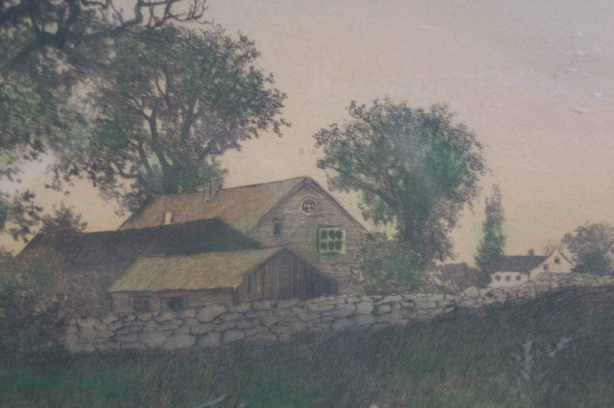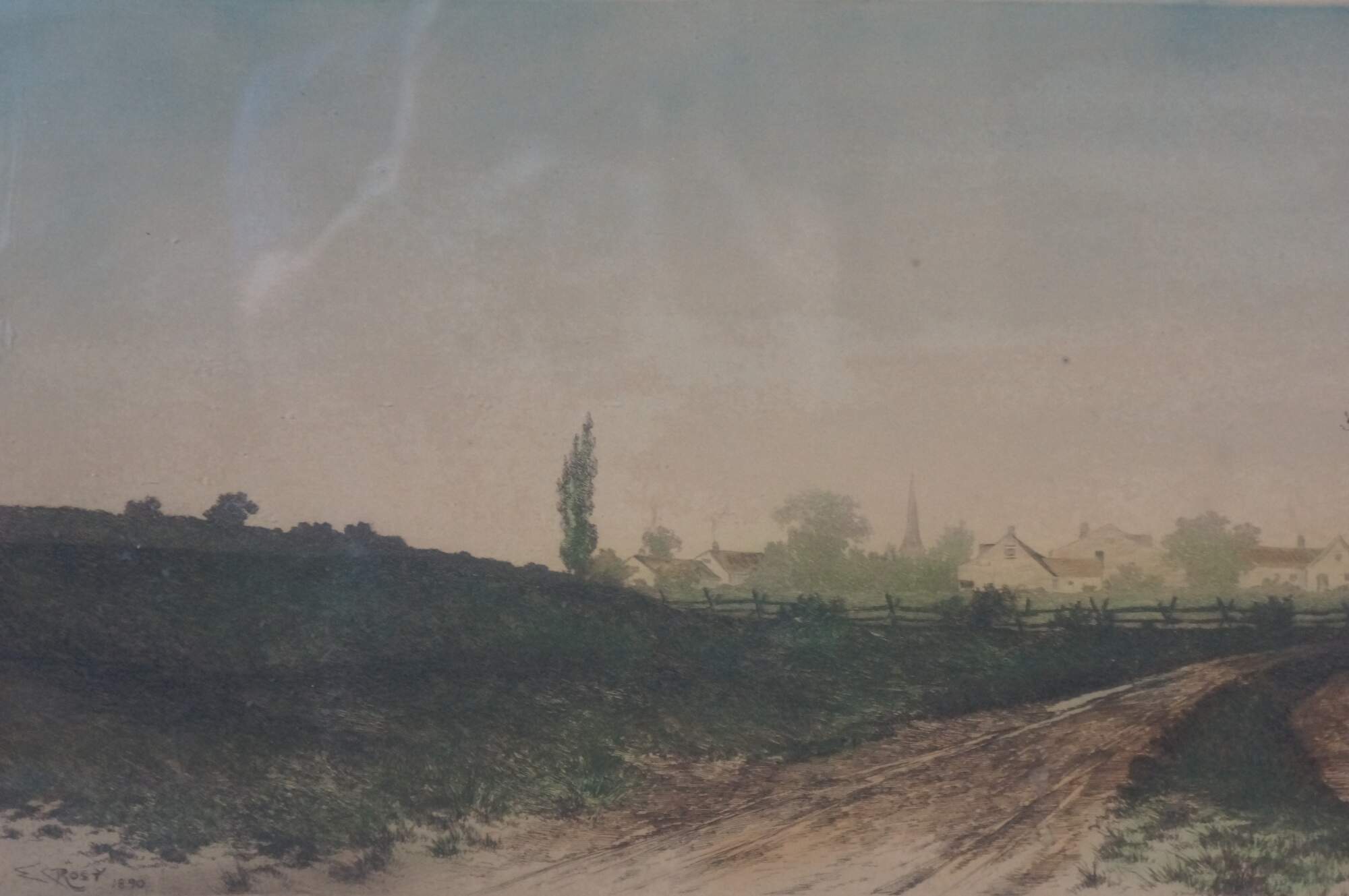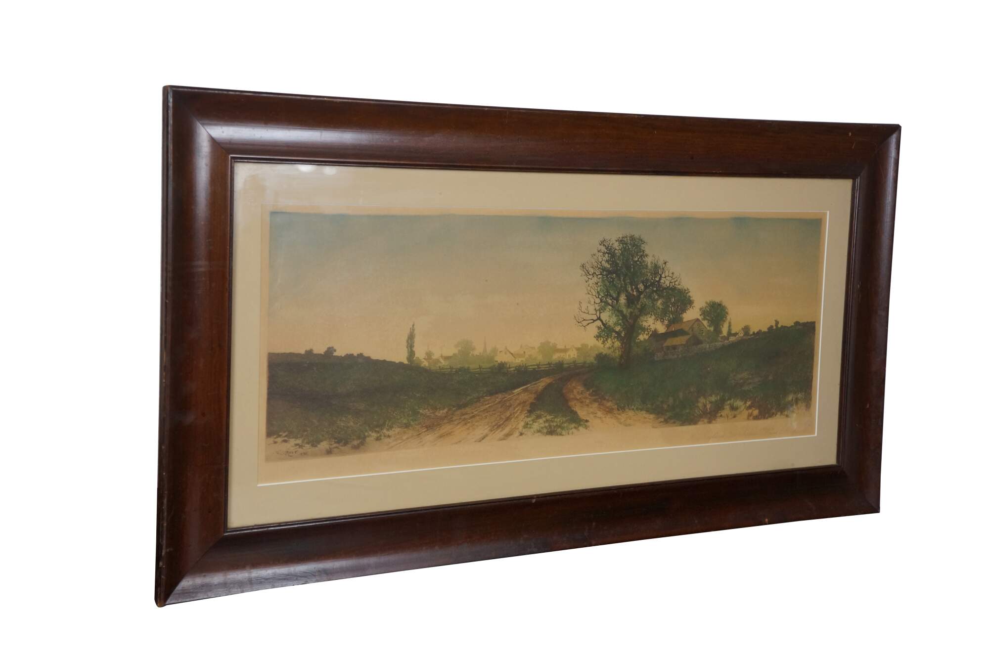 Late 19th century hand colored etching titled "New England Farmhouse" by Ernest C. Rost. Panoramic landscape of a country roas curving past a stone farmhouse, with a village in the distance. Signed in plate EC Rost 1890, lower left. Beveled mahogany frame; white mat.
