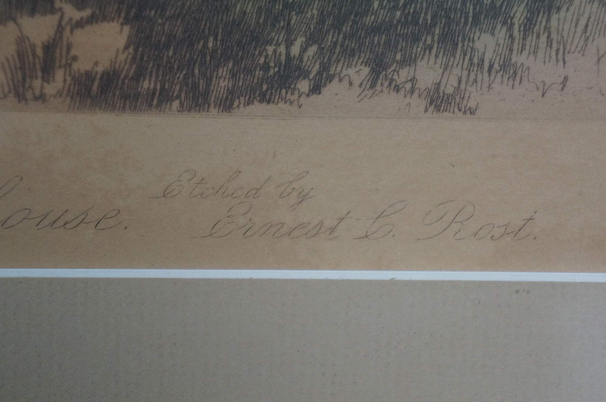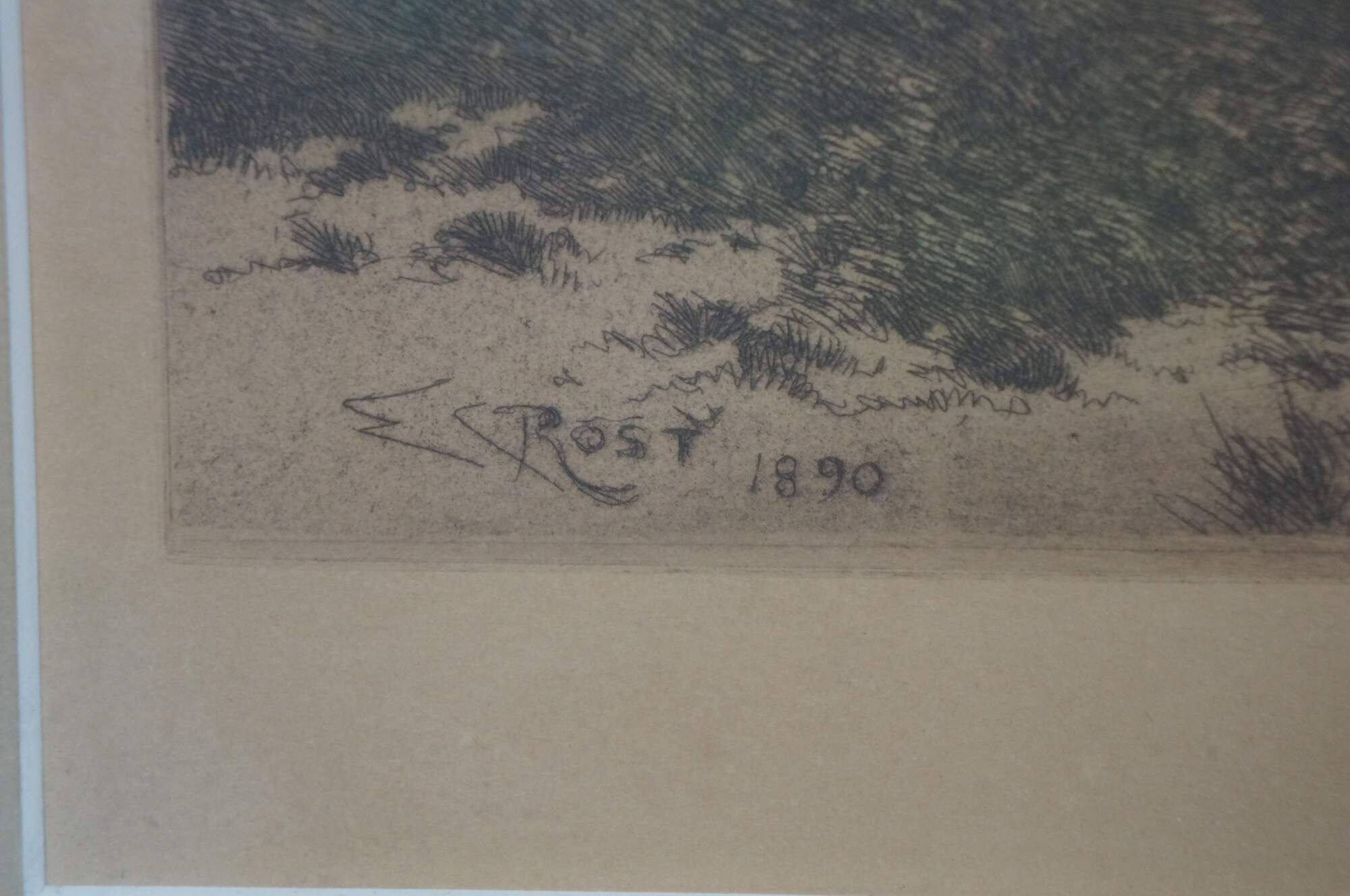 "Ernest Christian Rost - American, 1866 - 1940 - Ernest was born January 20, 1866, at Mt. Vernon, N.Y. and was probably the son of Christan Rost (a locally known engraver) and Minna M. Rost. Nothing is known of his childhood except he was the fourth of six children in the family. By the mid-1880's E.C. Rost was exhibiting landscapes in oil at the National Academy of Design, New York City. After 1887 his oil painting stopped and by 1891 etching became his primary occupation. Today, the Library of Congress (Prints and Photographs Division) maintains 63 etchings signed 'Ernest C. Rost' or 'E. C. Rost', with dates running from 1891 to 1896. These often portray country lanes, cottages, rural scenes, sea, river and bayside settings, mostly in New York State, but several depict homes of famous statesmen and writers. With the outbreak of the Spainish-American War, Rost was sent by the U.S. War Department to Cuba, Puerto Rico, the Phillippines, and Guam as a civilian photographer of military operations and installations. Today, 21 photographs taken by E. C. Rost of these islands are held by the National Archives (Audio-Visual Division), while still another 26 photographs, all of Cuba, are held by the Library of Congress. In 1894 he sued his agents, Fishel, Adler and Schwartz Co. for the sale of his etchings as artist's proofs to which his signature had been forged. He went to the shop and bought 2 of these fo $.90 each, whereas Ernest testified that they were worth $5 each. He was so angered by the lawsuit experience that he never again etched. By 1898 Rost had apparrently given up etching and entered photography full-time. Still, photography was not his only occupation during this time period, for he began writing, too. Between 1899 and 1900, at least 7 articles by Rost appeared in the popular 'Leaslie's Illustrated Weekly Newspaper'." (Source: Iowa State University Museum)
