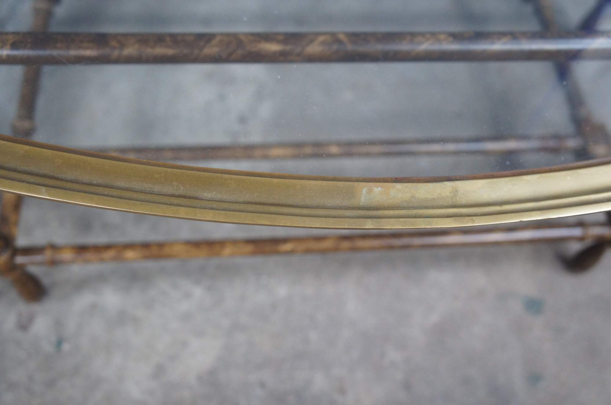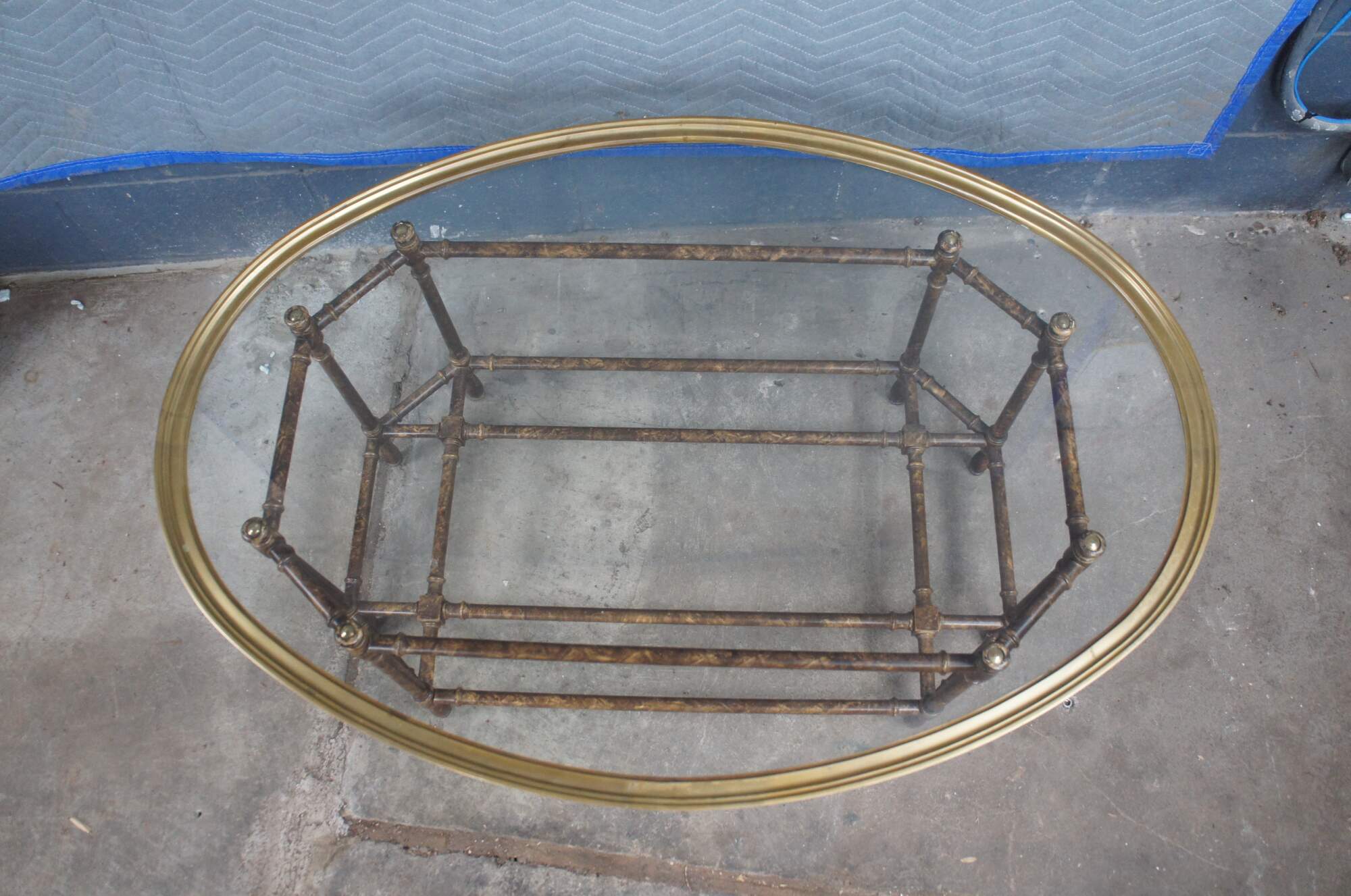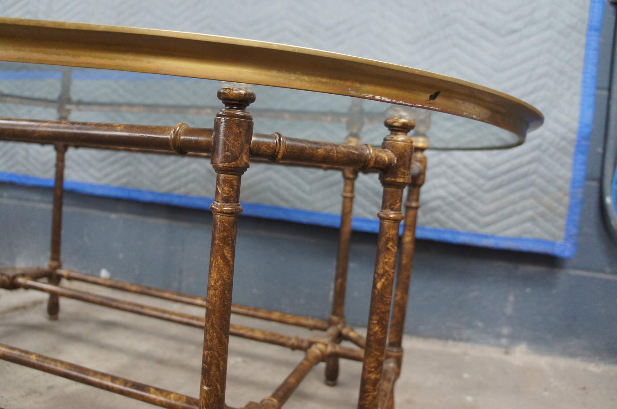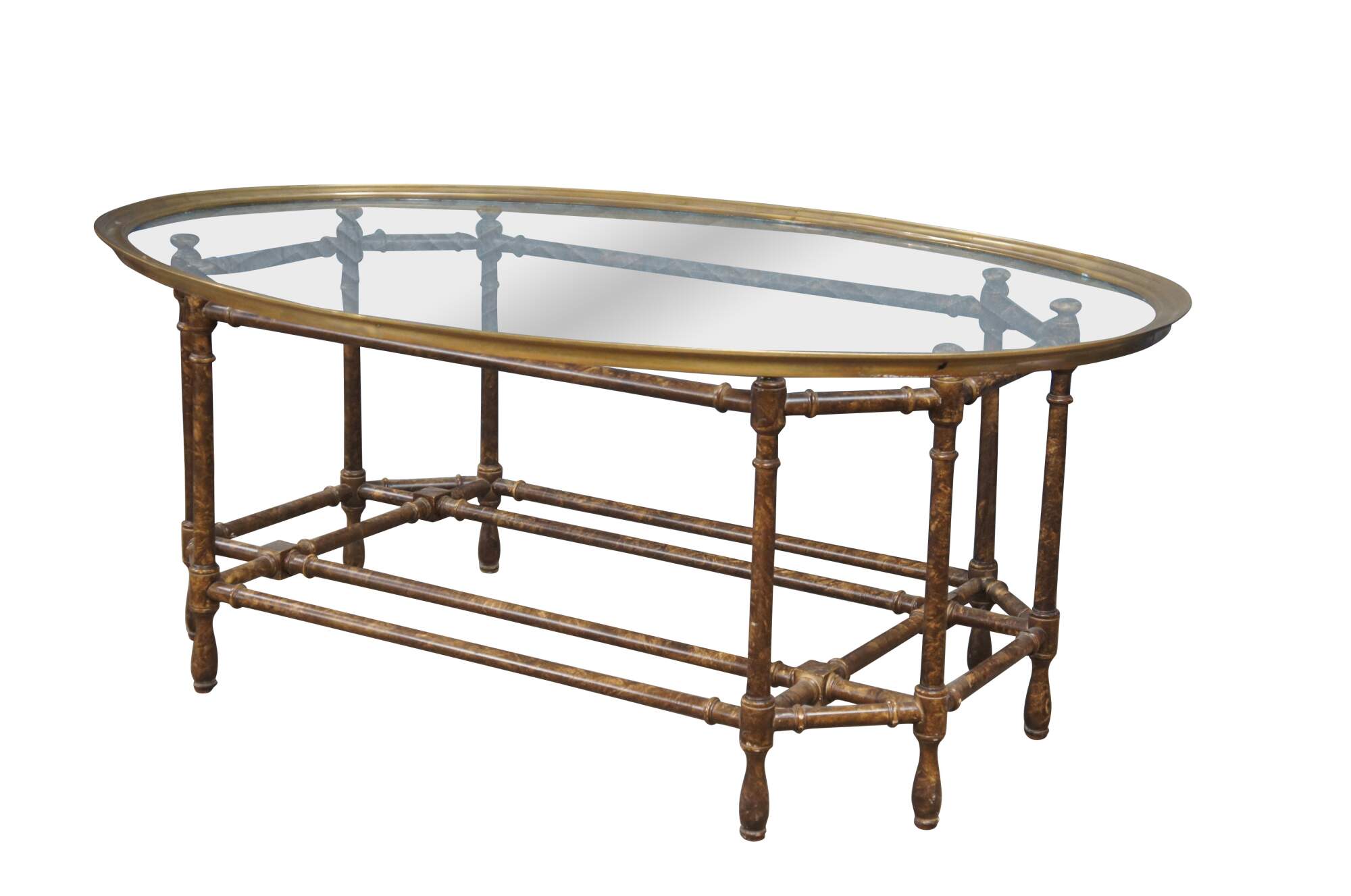 Vintage Baker Furniture faux bamboo tortoise shell finish coffee or cocktail table featuring an oval top with brass gallery edge. Unmarked.