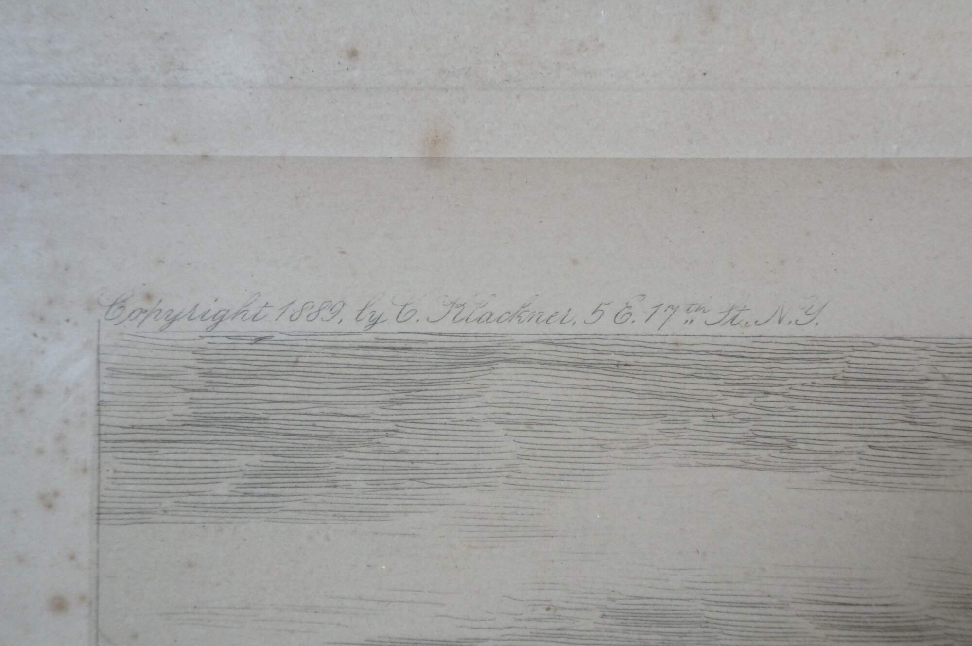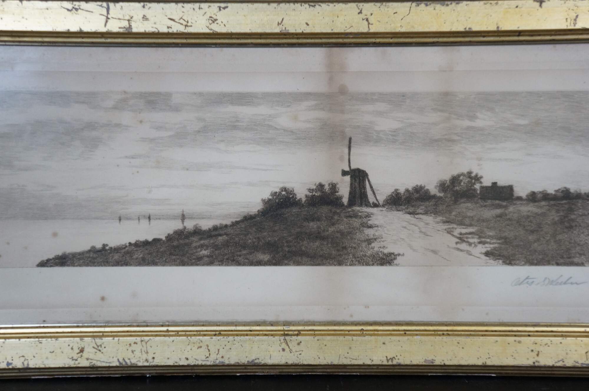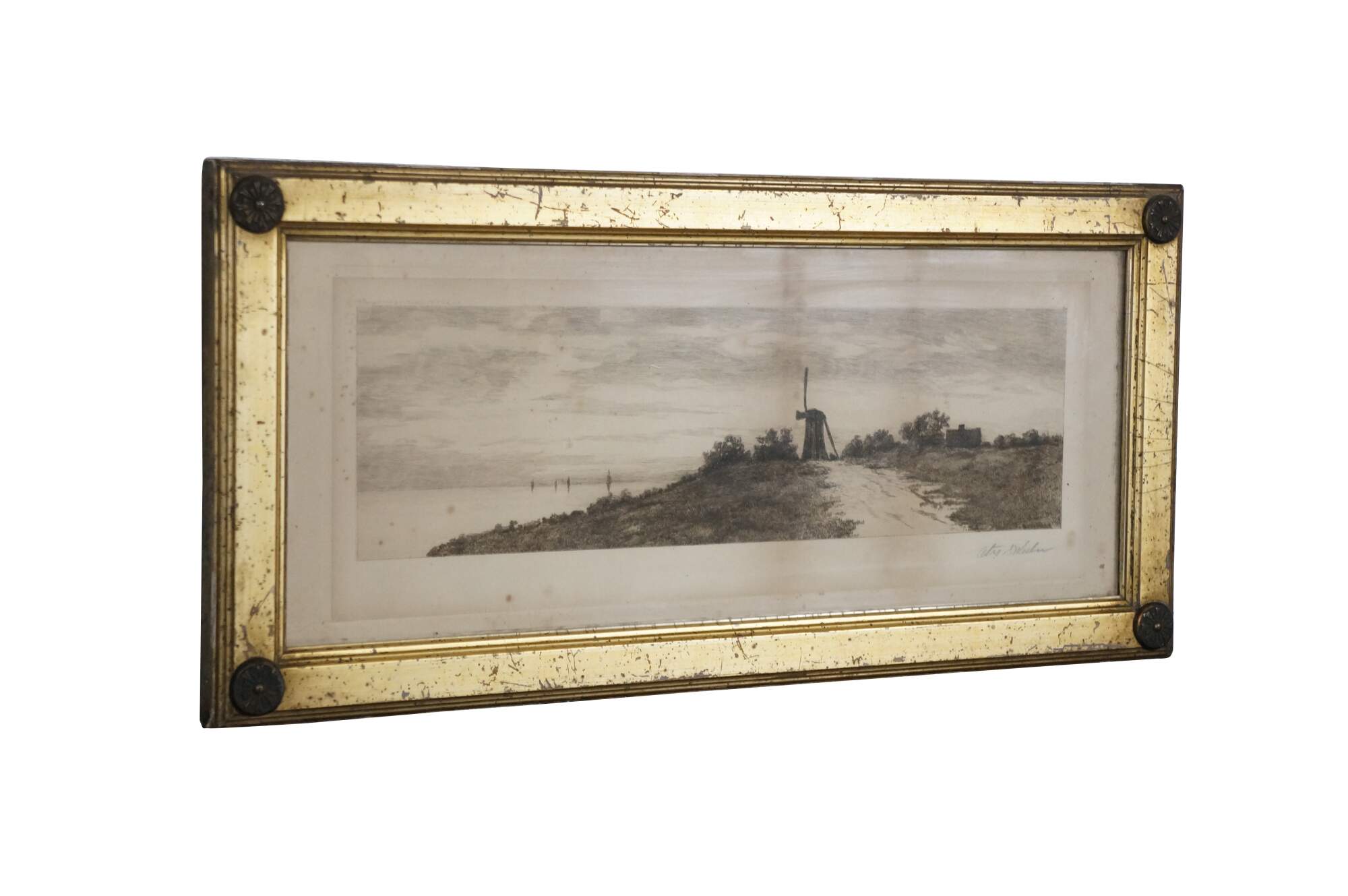 Late 19th century black-and-white nautical etching by Otis S. Weber. Panoramic coastal landscape / seascape with a silhouetted windmill and sailboats in the horizon. Signed in plate O.S. Weber, lower right. Pencil signed, lower right. Copyright 1889 by C. Blackner, 56 17th St N.Y. Giltwood frame with carved medallion corners; no mat.