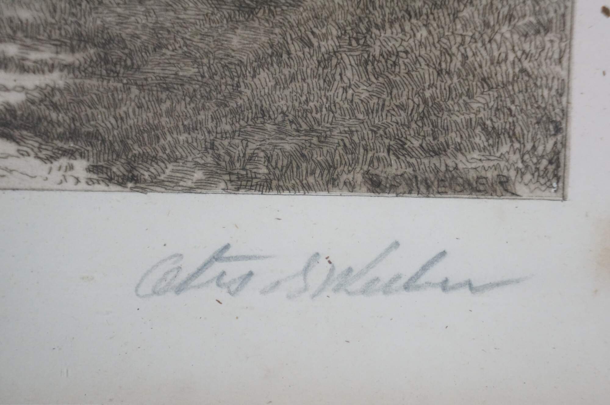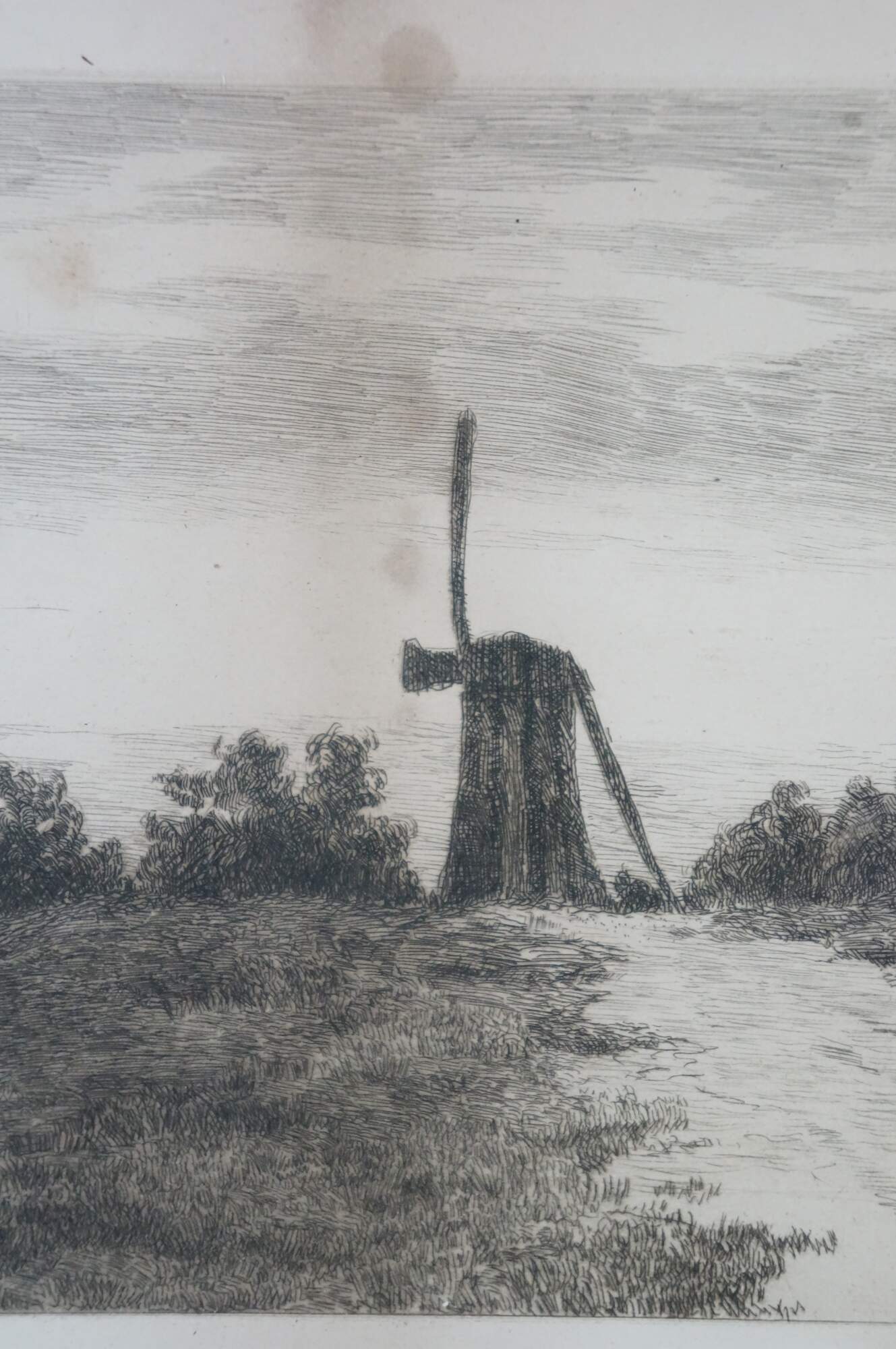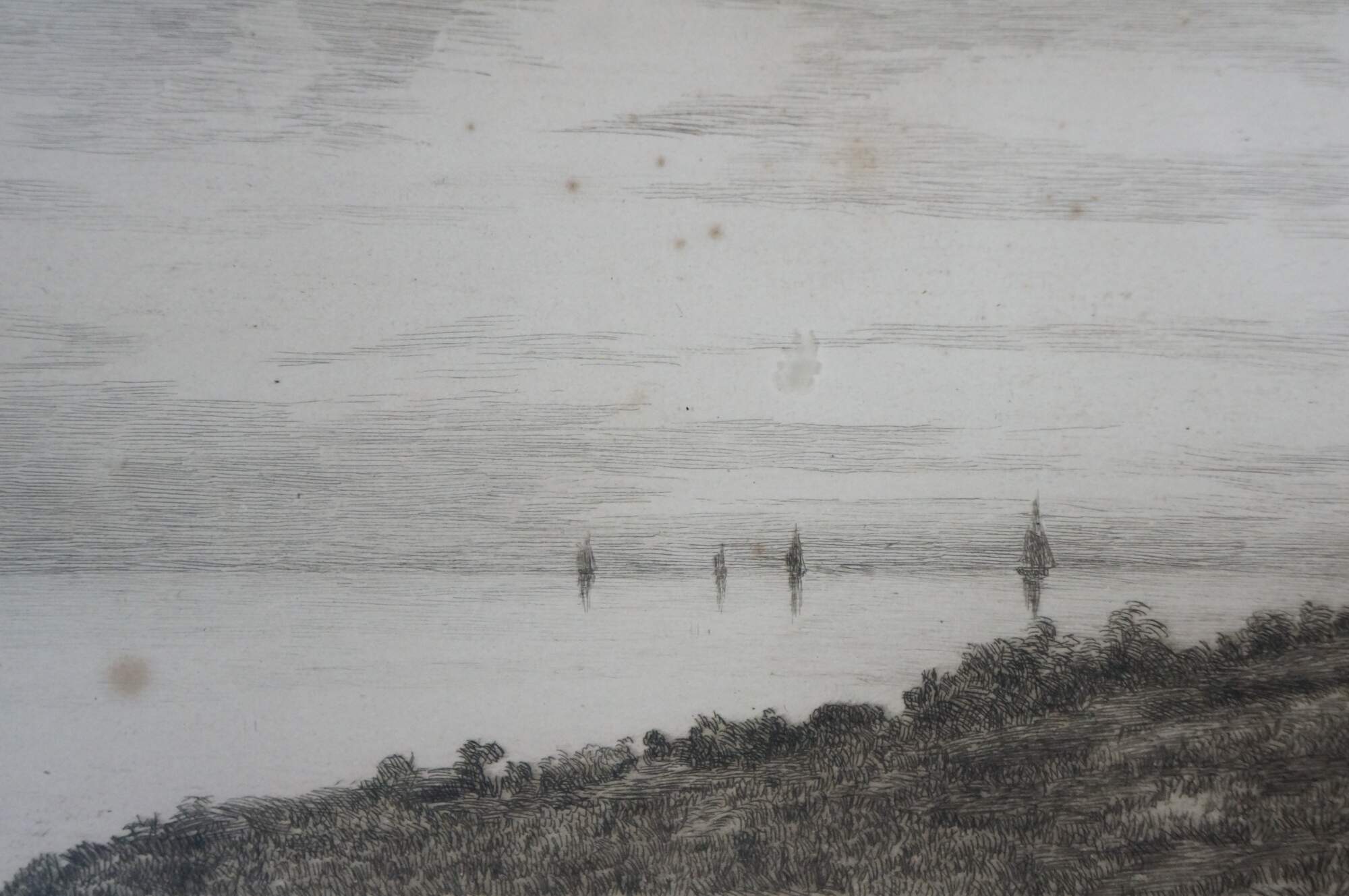 Late 19th century black-and-white nautical etching by Otis S. Weber. Panoramic coastal landscape / seascape with a silhouetted windmill and sailboats in the horizon. Signed in plate O.S. Weber, lower right. Pencil signed, lower right. Copyright 1889 by C. Blackner, 56 17th St N.Y. Giltwood frame with carved medallion corners; no mat.