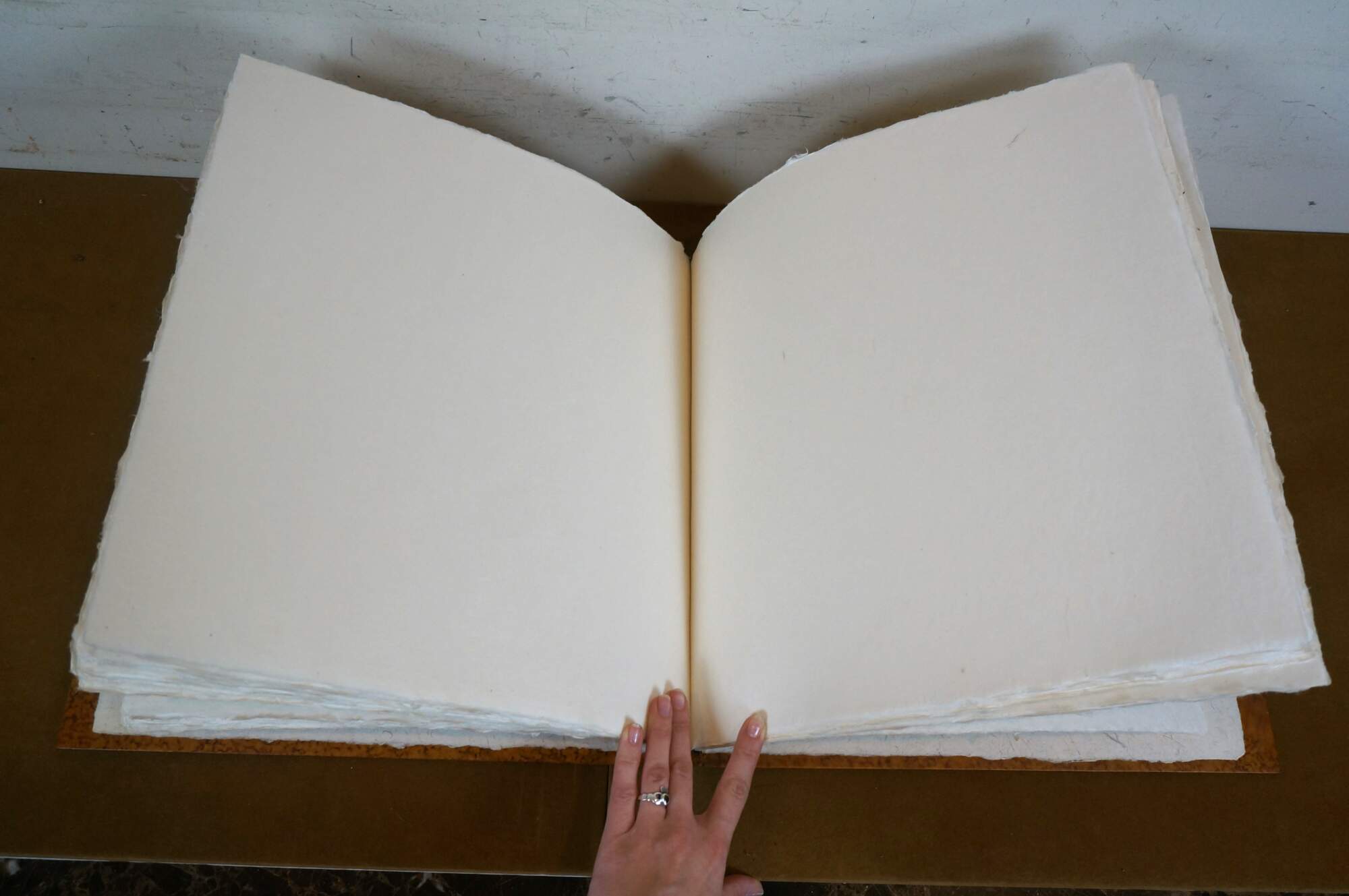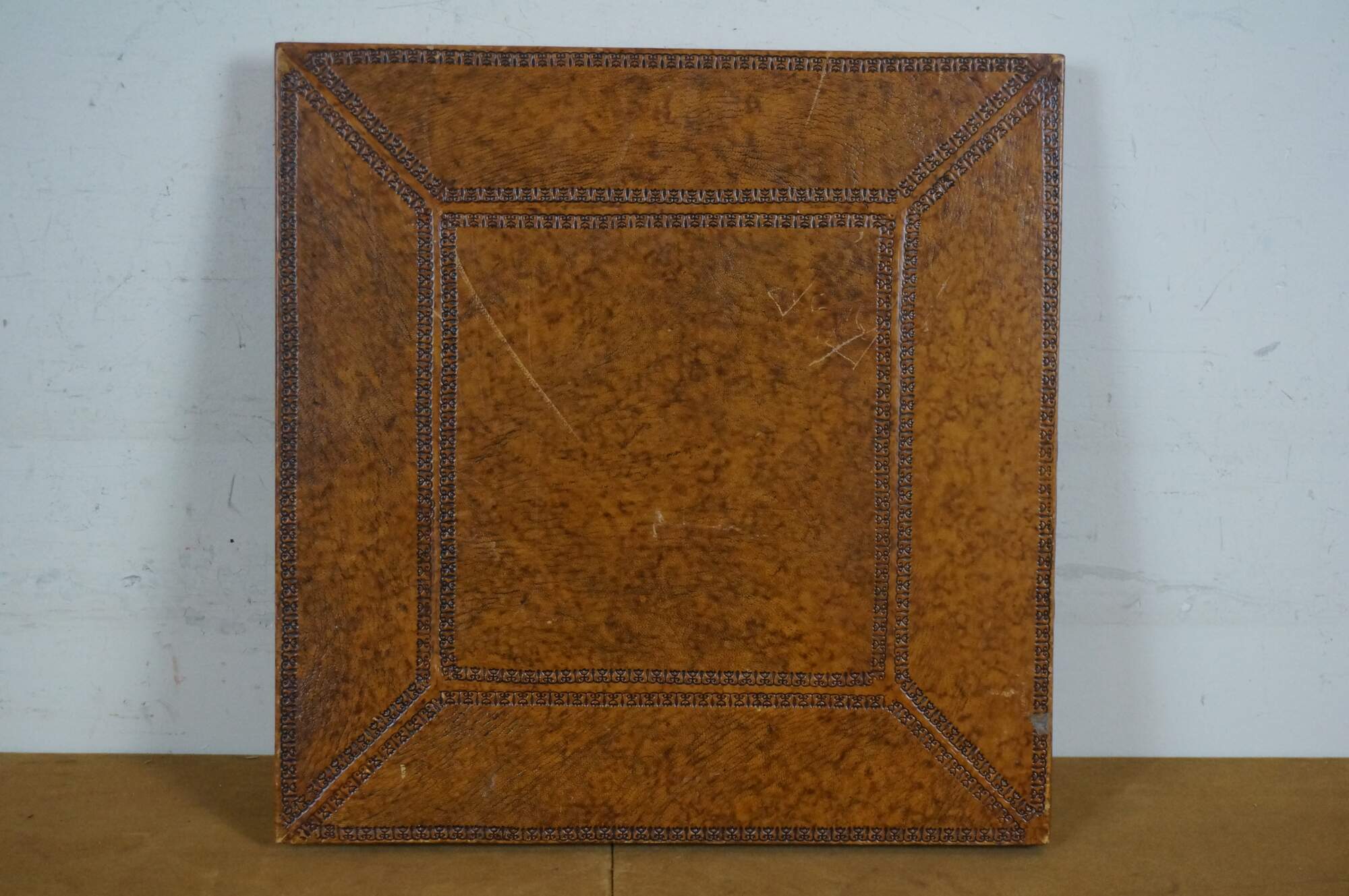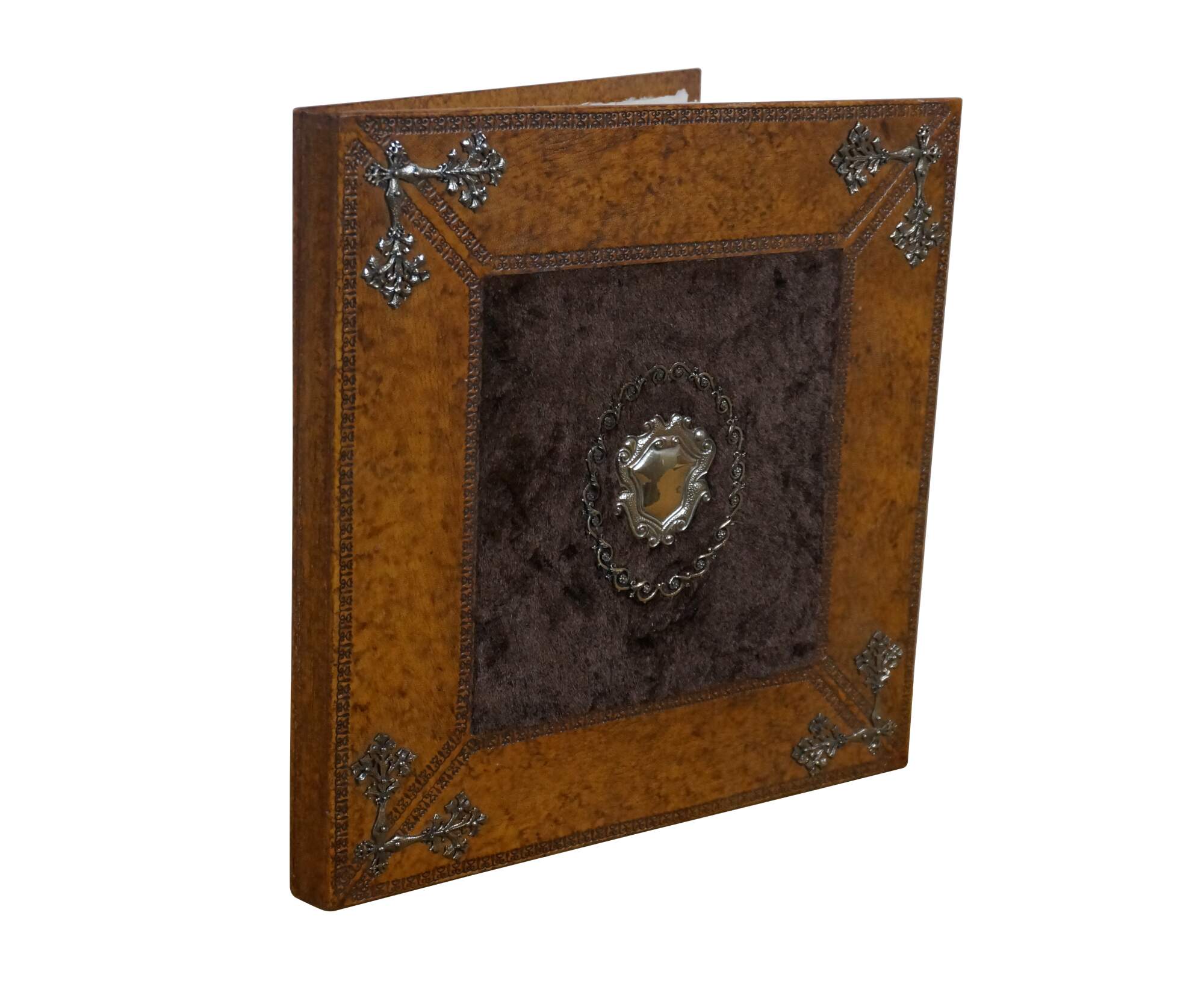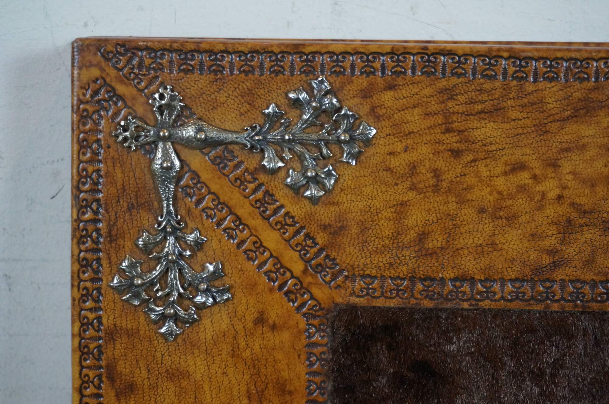 Late 20th century Maitland Smith Italian Baroque style photo album /scrapbook. Bound in mottled tooled leather with a panel of faux fur at the center, and accented with a shield and floral silver plate appliqués. Raw-edged blank pages. 50 pages interior.