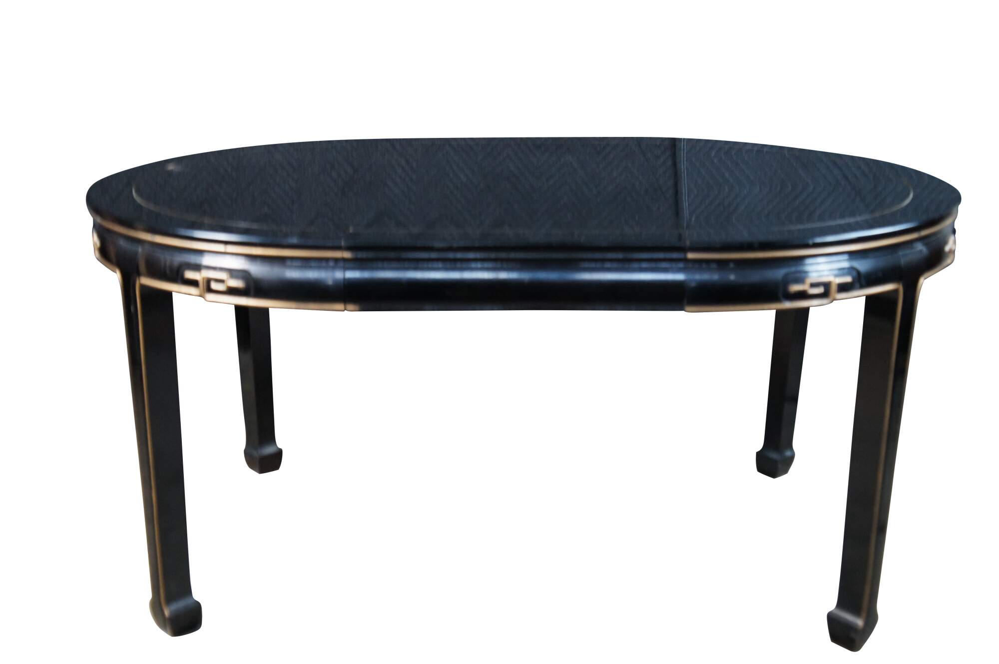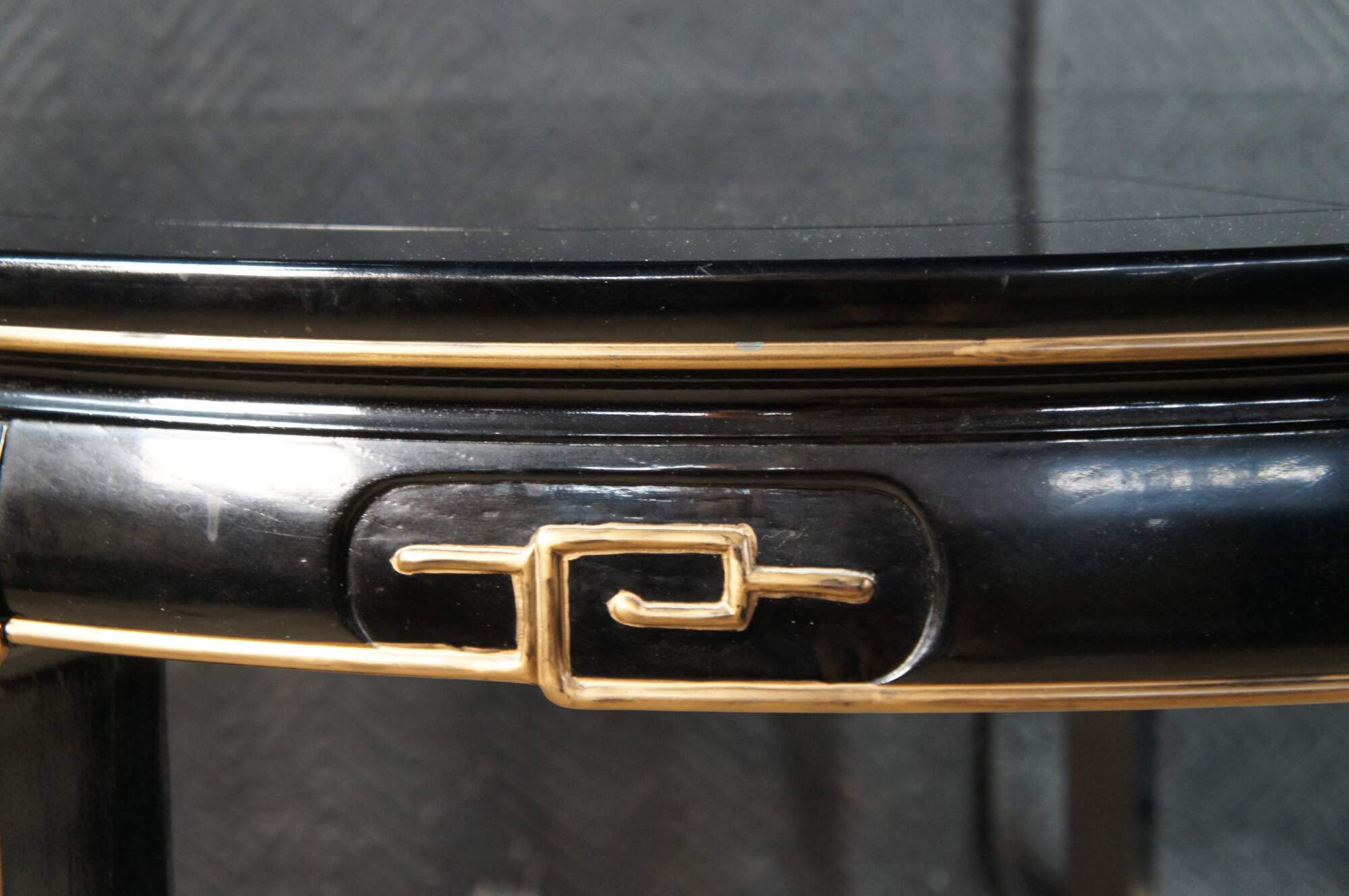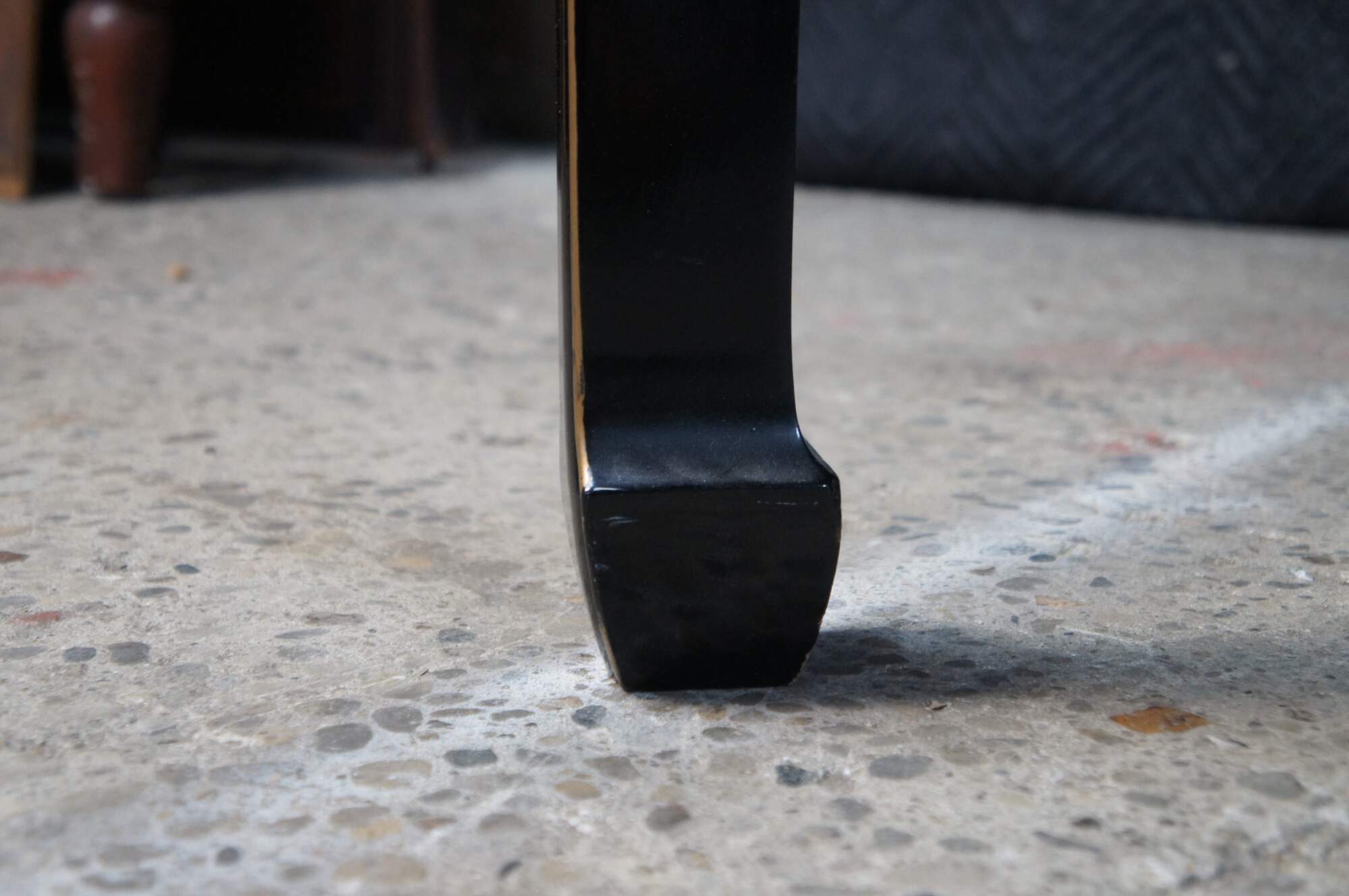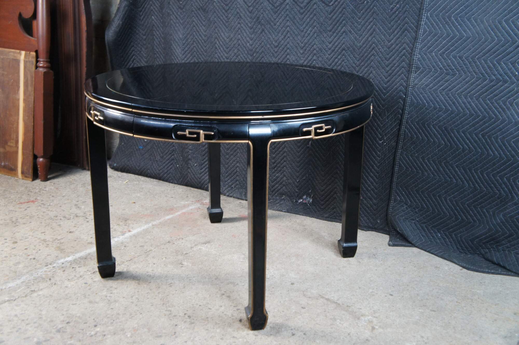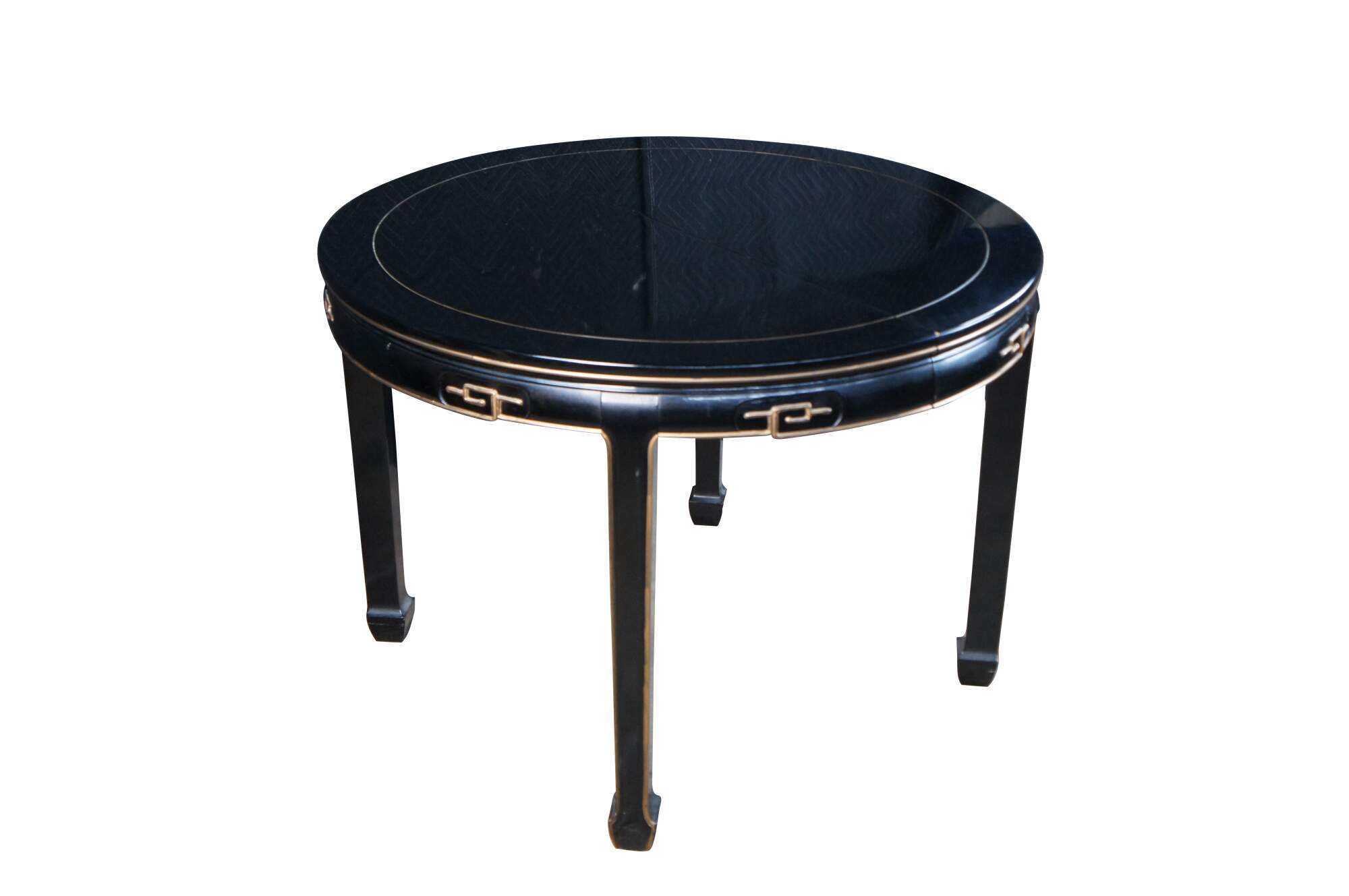 Mid century black lacquered breakfast / dining table featuring round form with gold accents and ming style legs.. Made in Taiwan, ROC Republic of China.