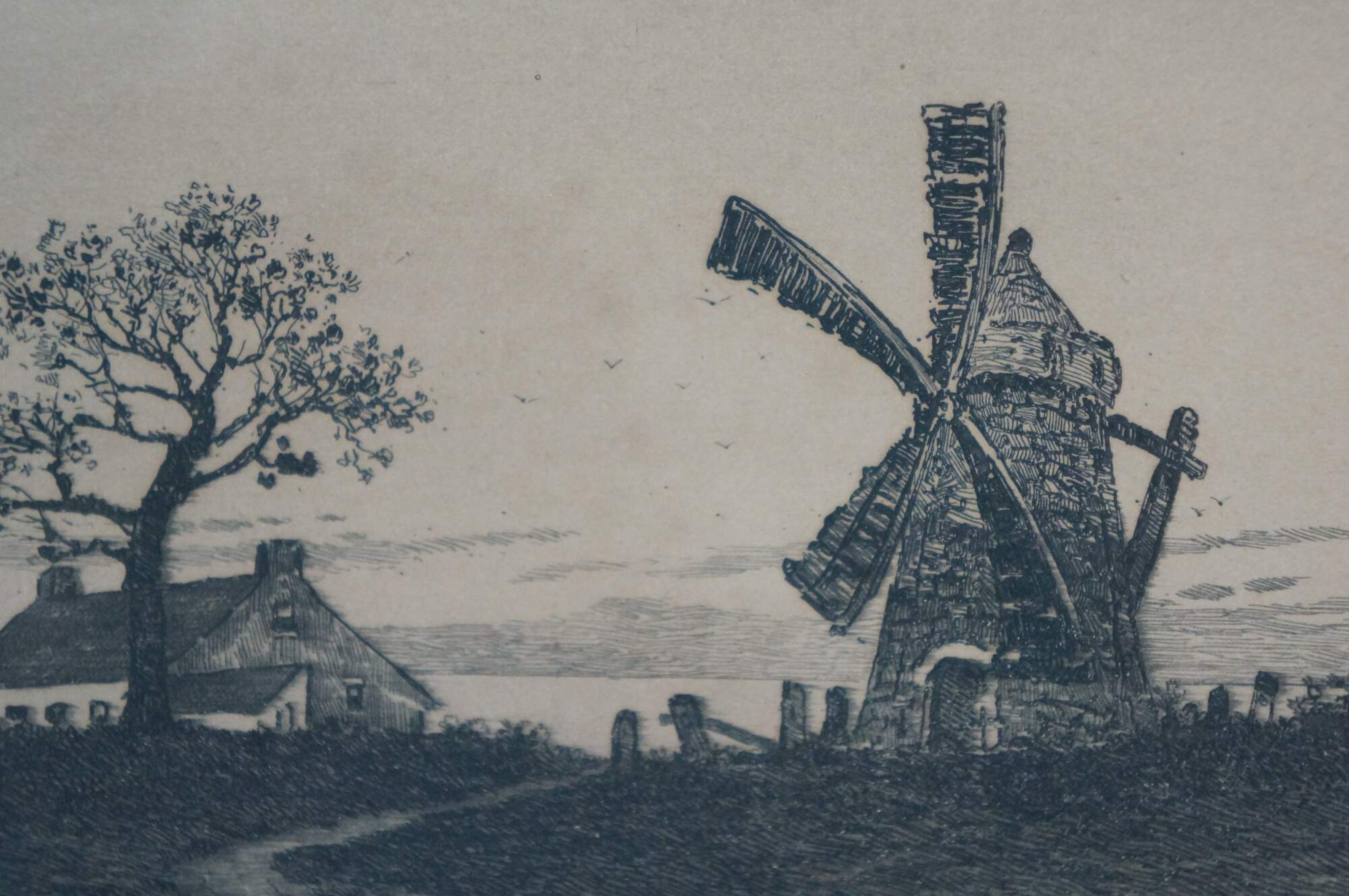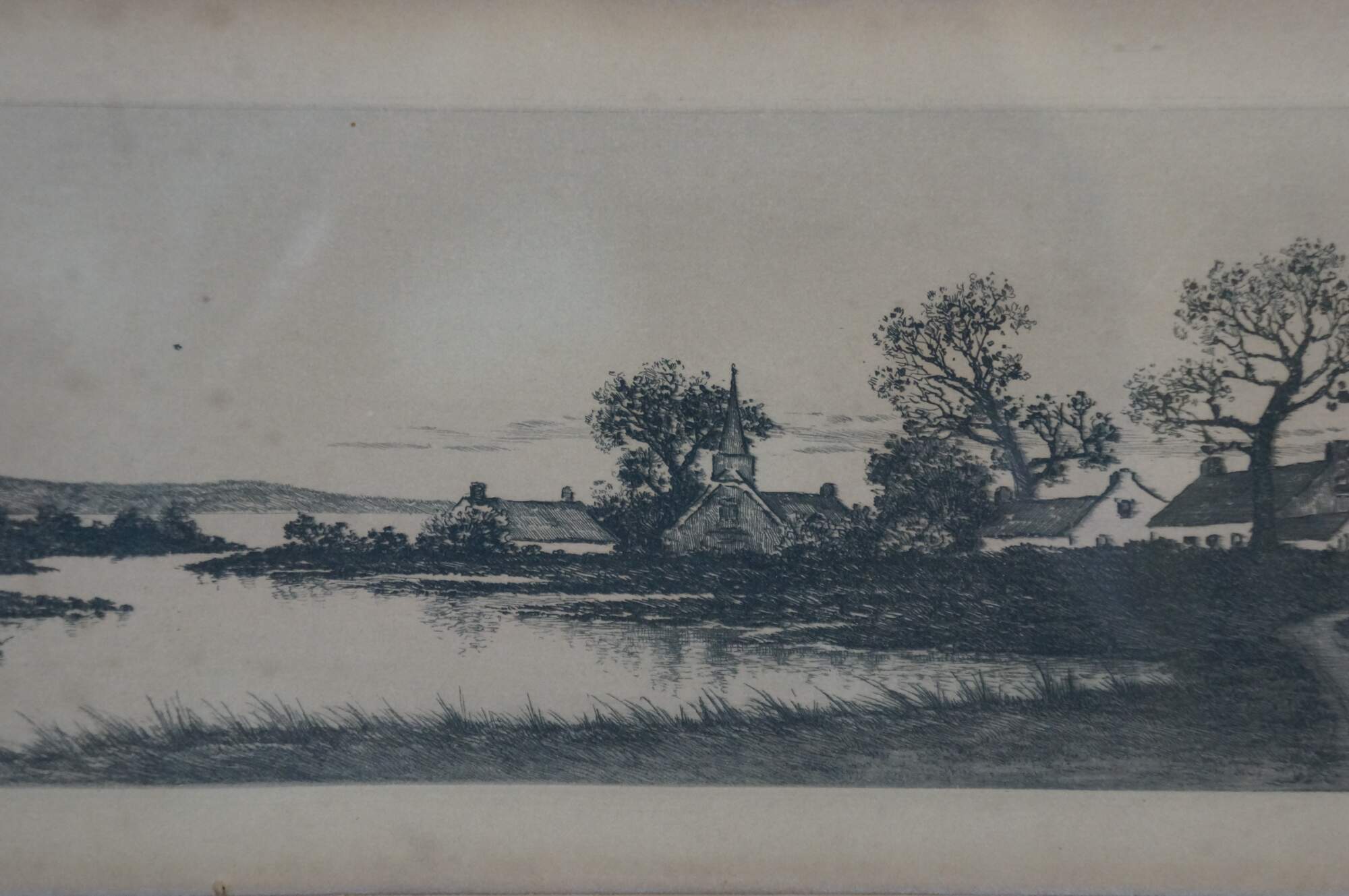 Late 19th-early 20th century black and white etching by Henri Le Riche. Panoramic riverscape / landscape showing a country village and windmill by a river. Pencil signed, lower right. Painted tigerwood frame; white mat.