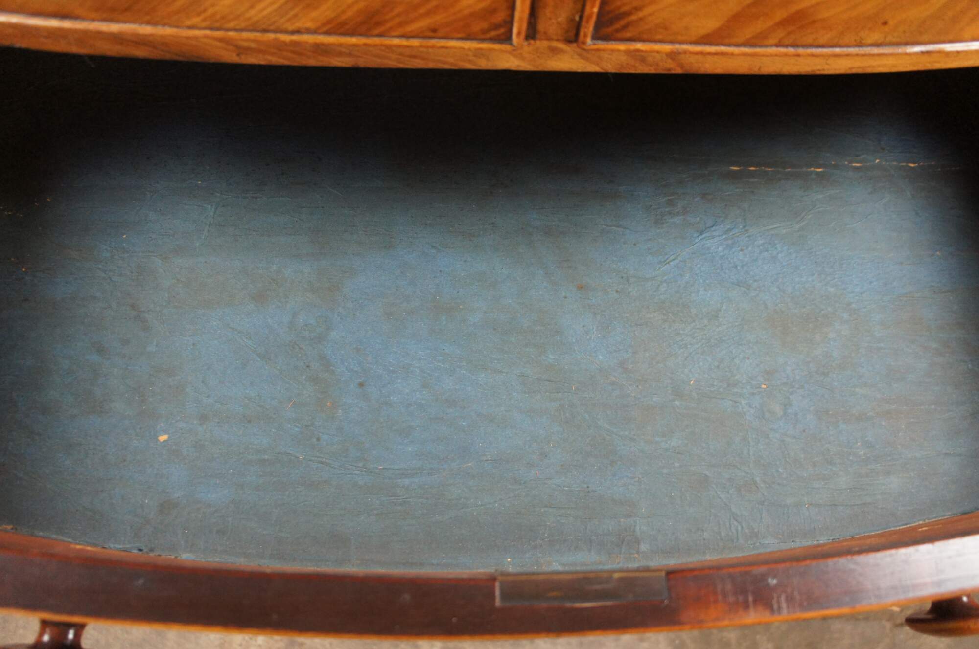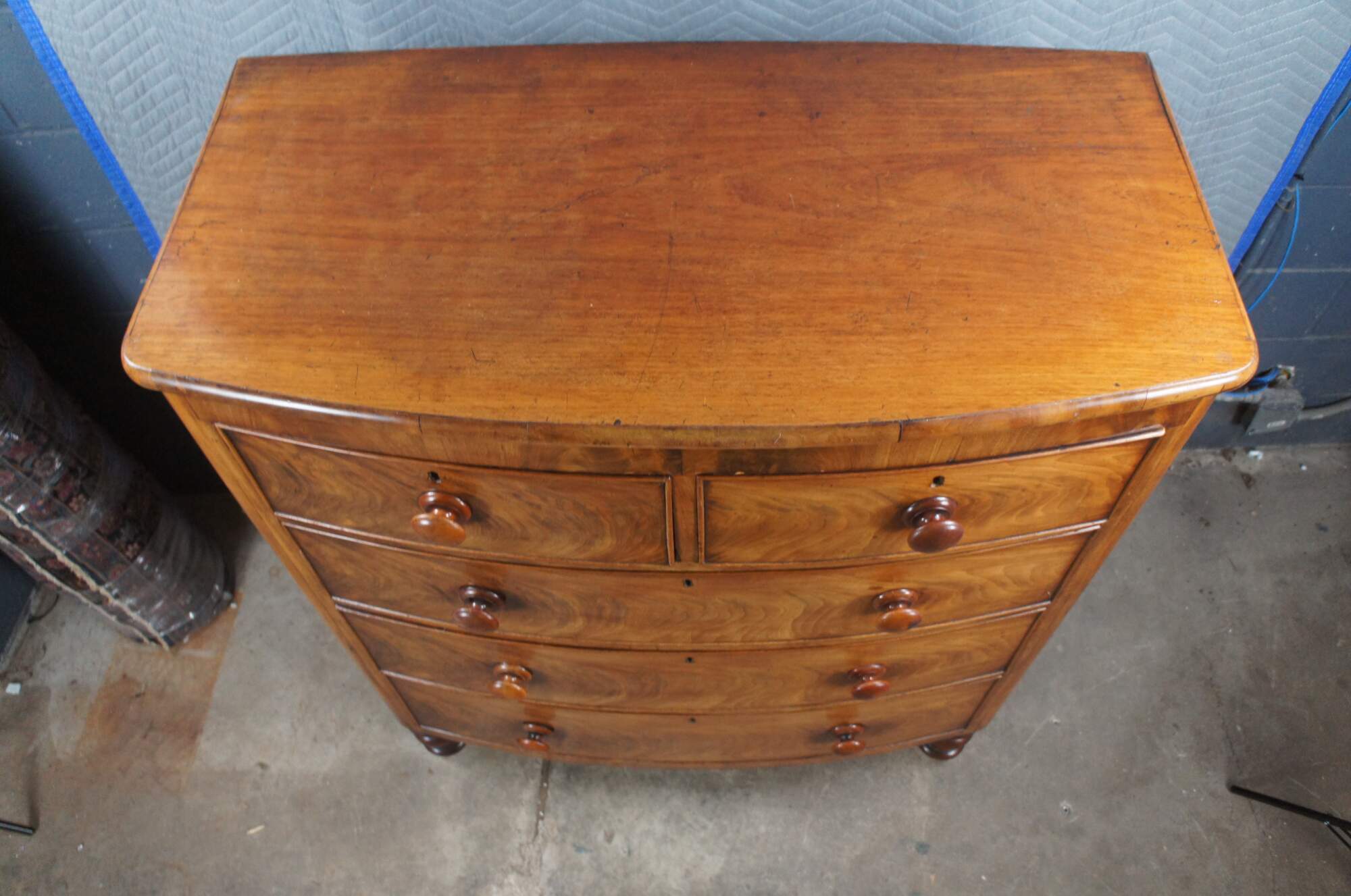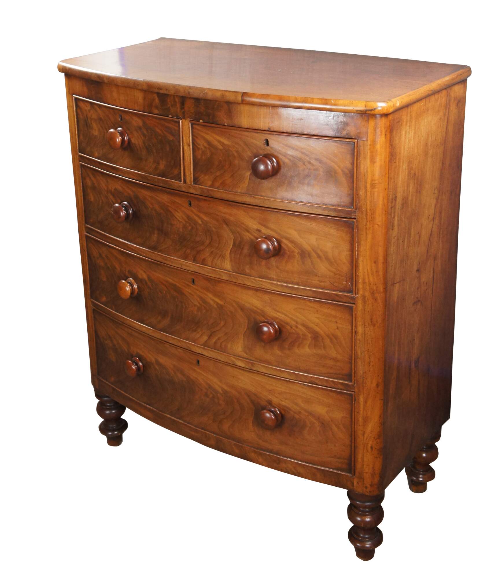 An exceptional antique 19th Century Victorian Tallbot Dresser. Features a mahogany frame with bowfront and two over three drawer configuration. The beautiful drawers showcase flame mahogany veneer and robust turned pulls. Each drawer is hand dovetailed. The case is supported by turned legs.