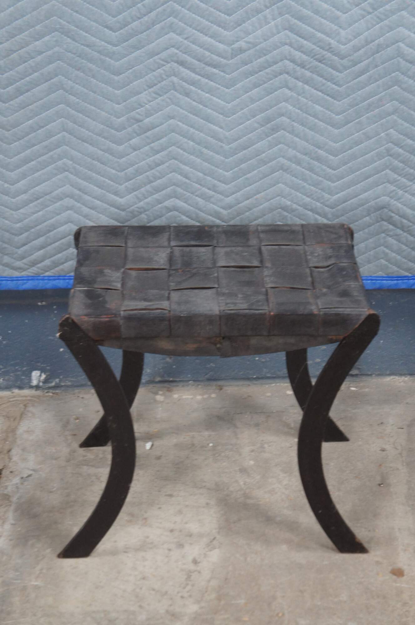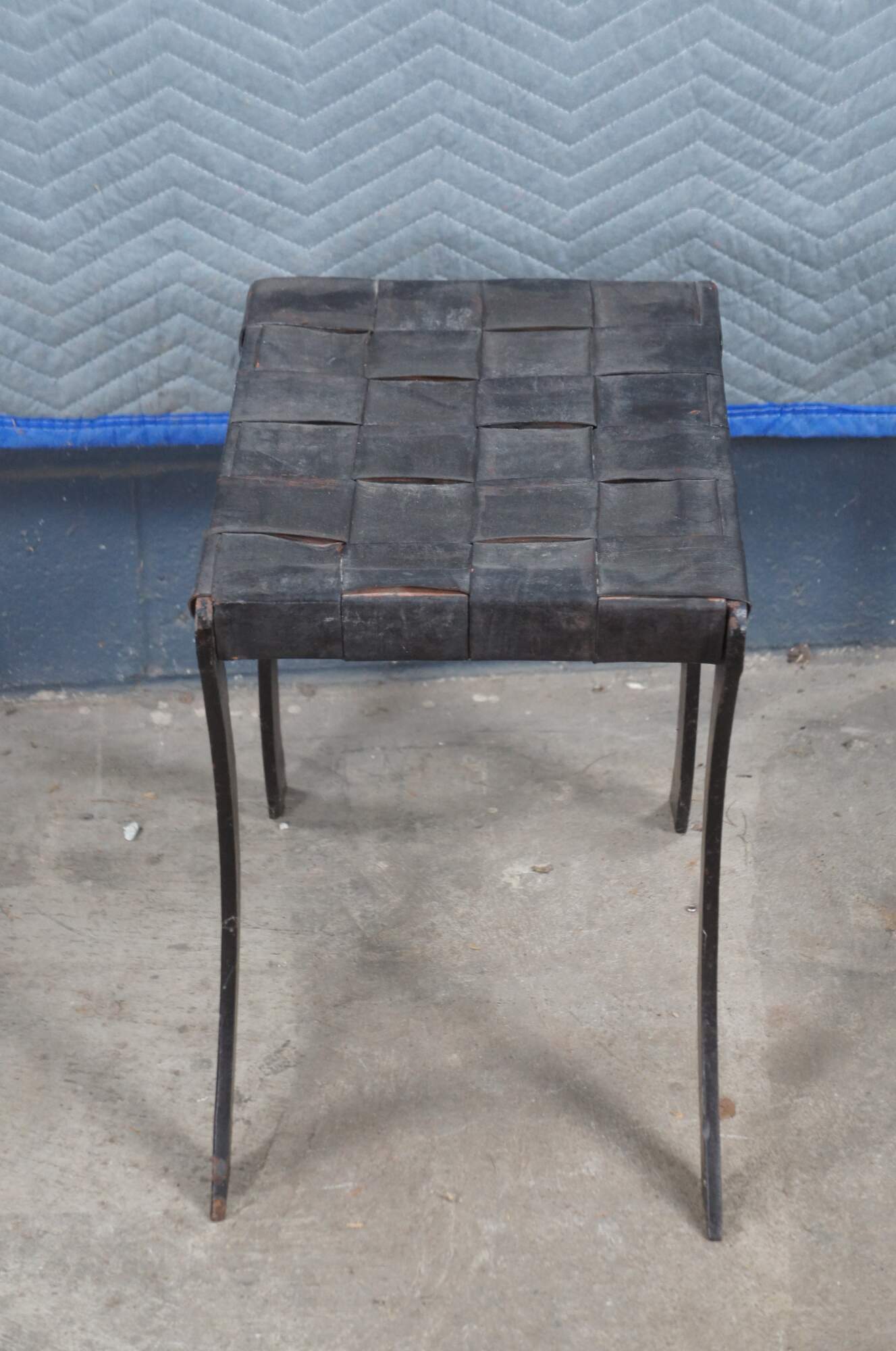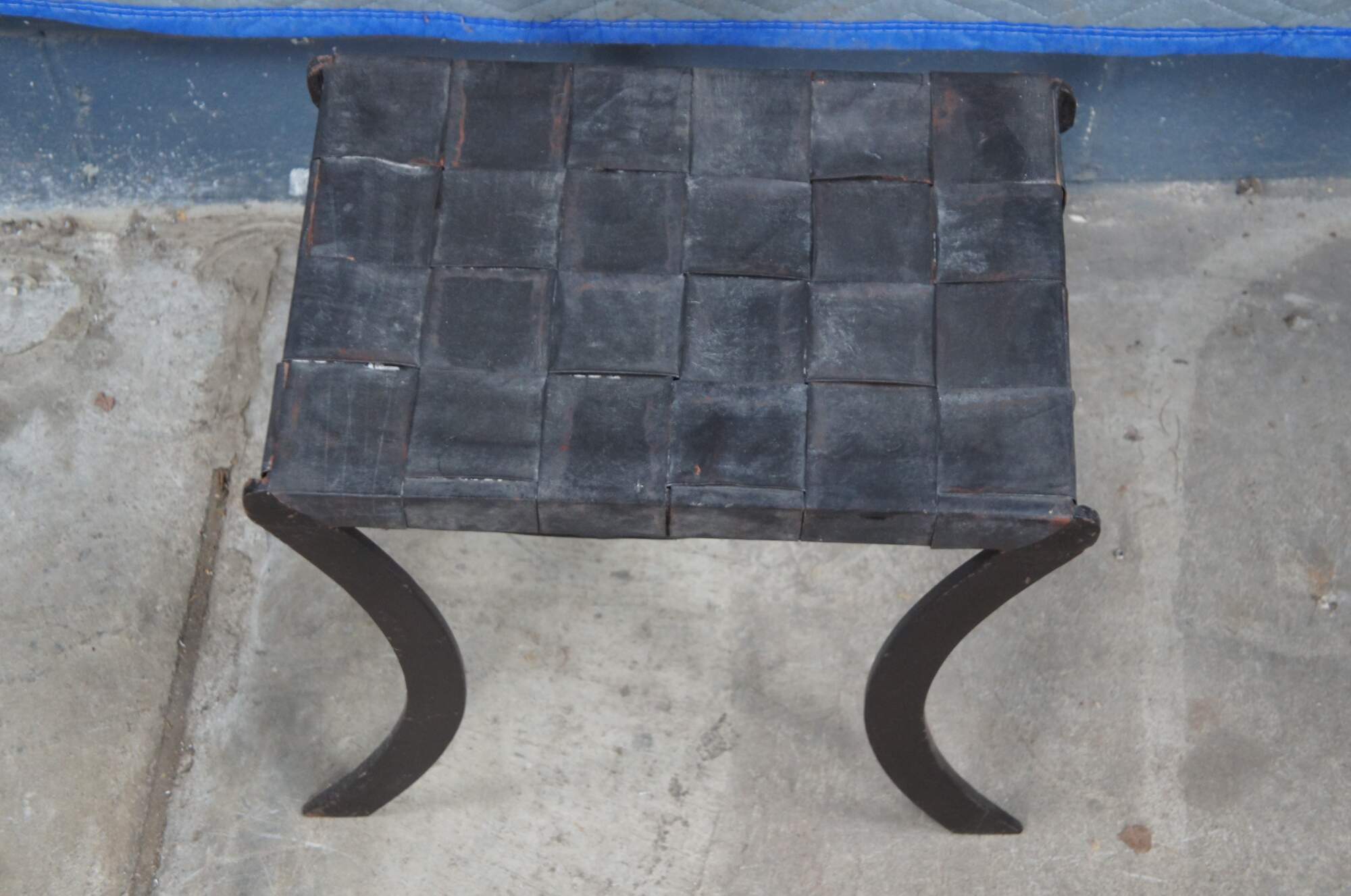 An intriguing French Iron stool, circa mid 20th century. Features an iron frame with saber legs and a woven leather seat.