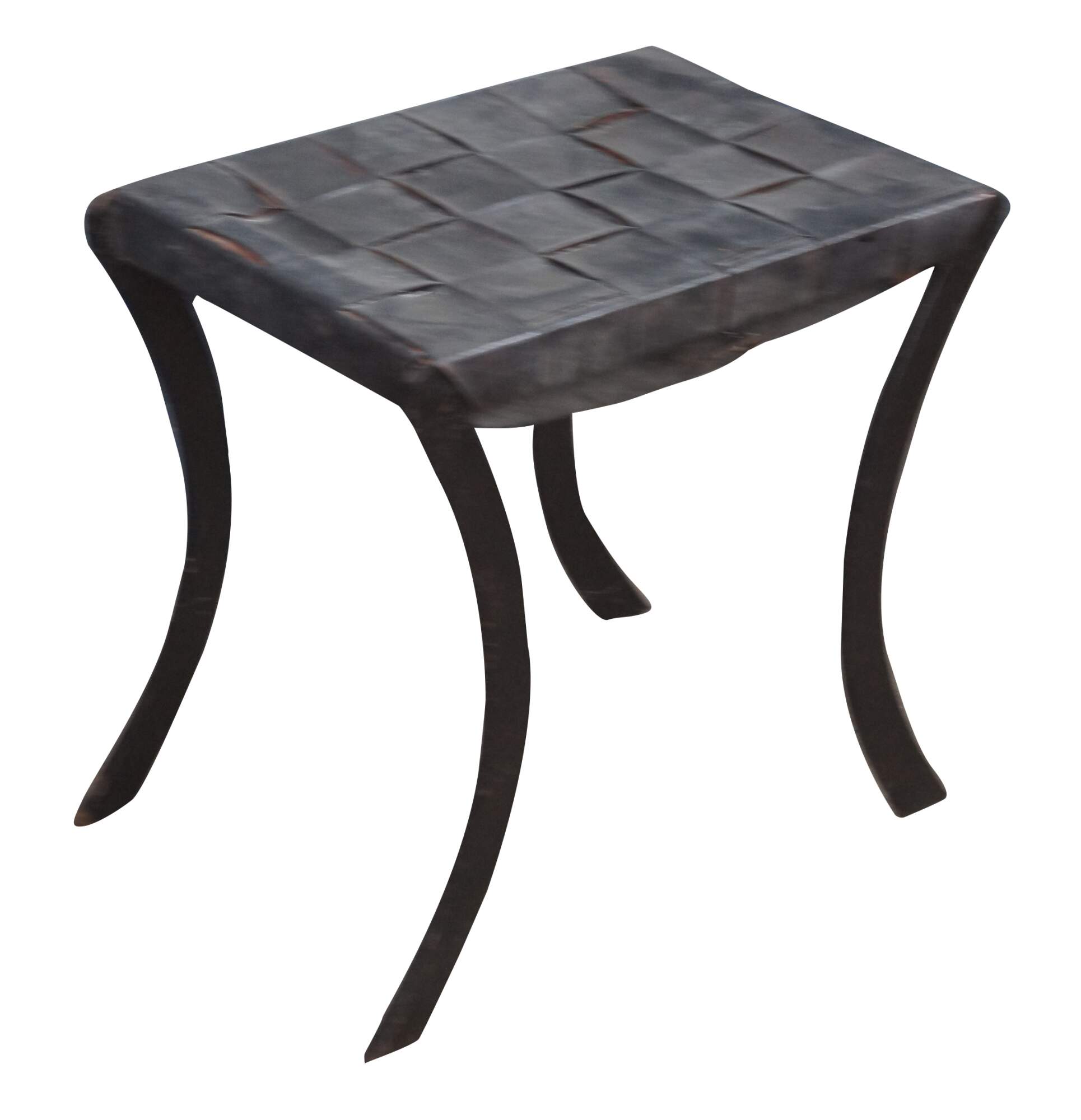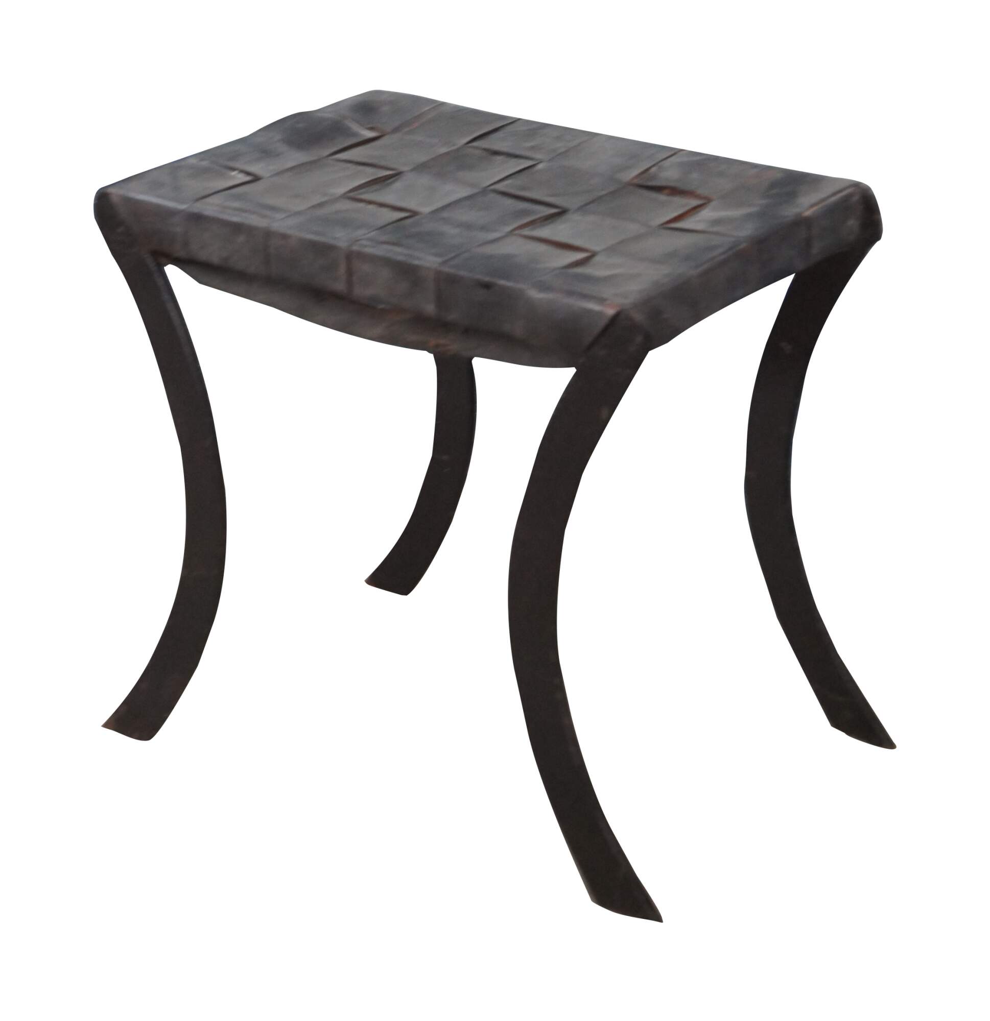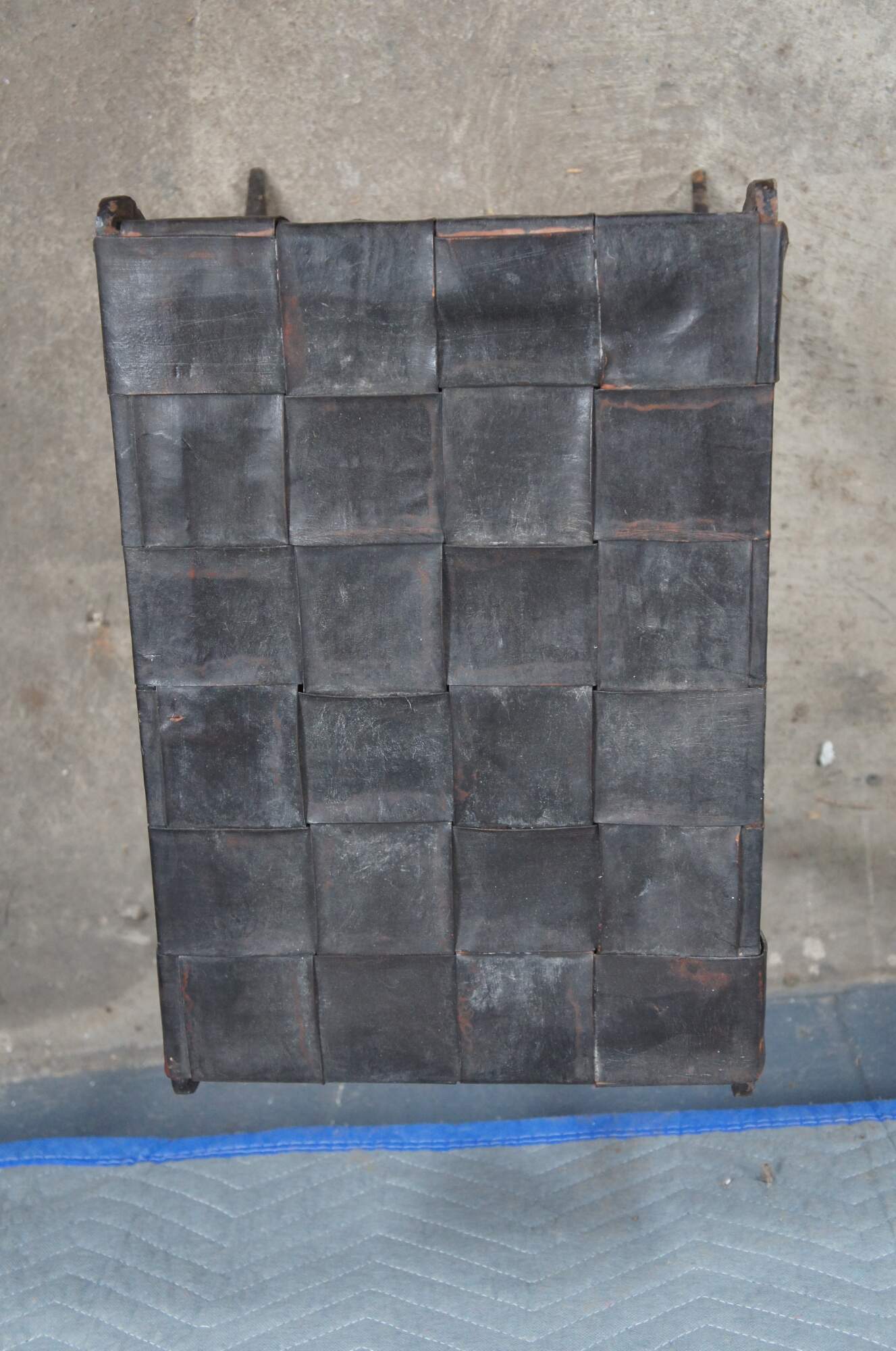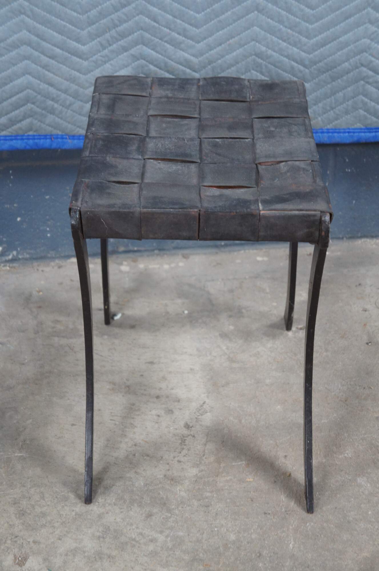 An intriguing French Iron stool, circa mid 20th century. Features an iron frame with saber legs and a woven leather seat.