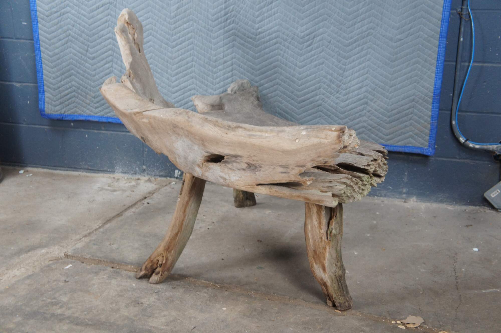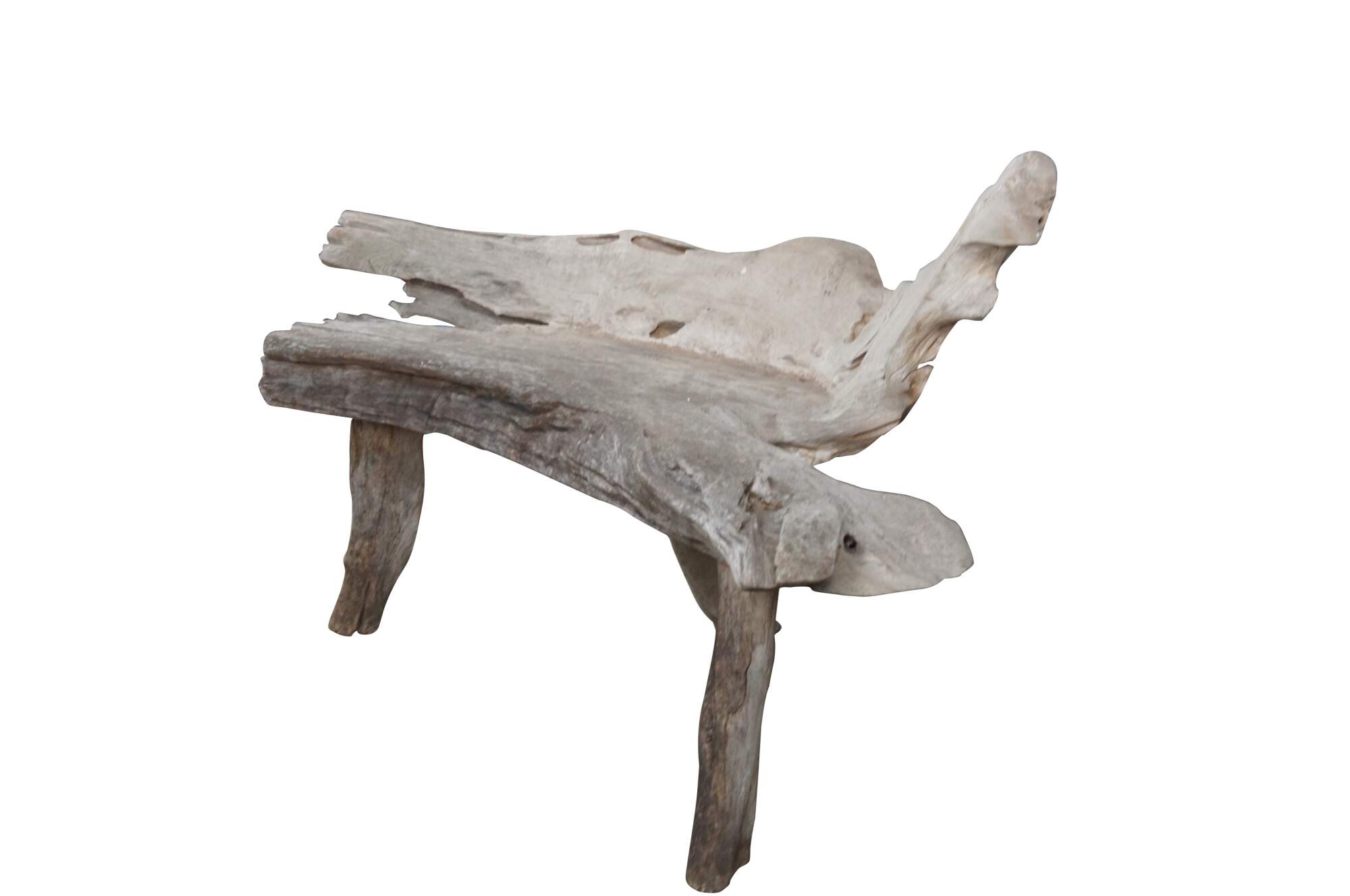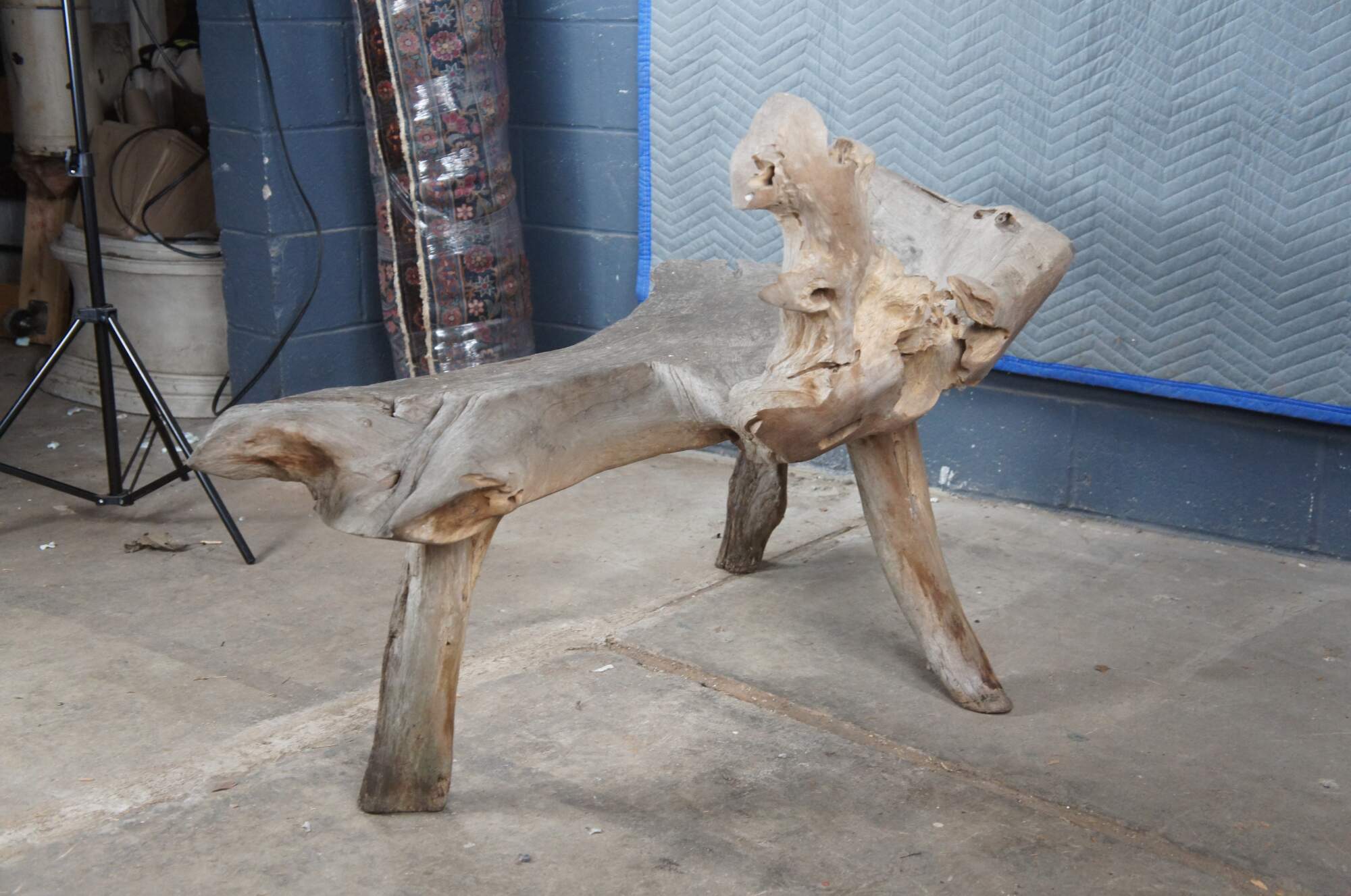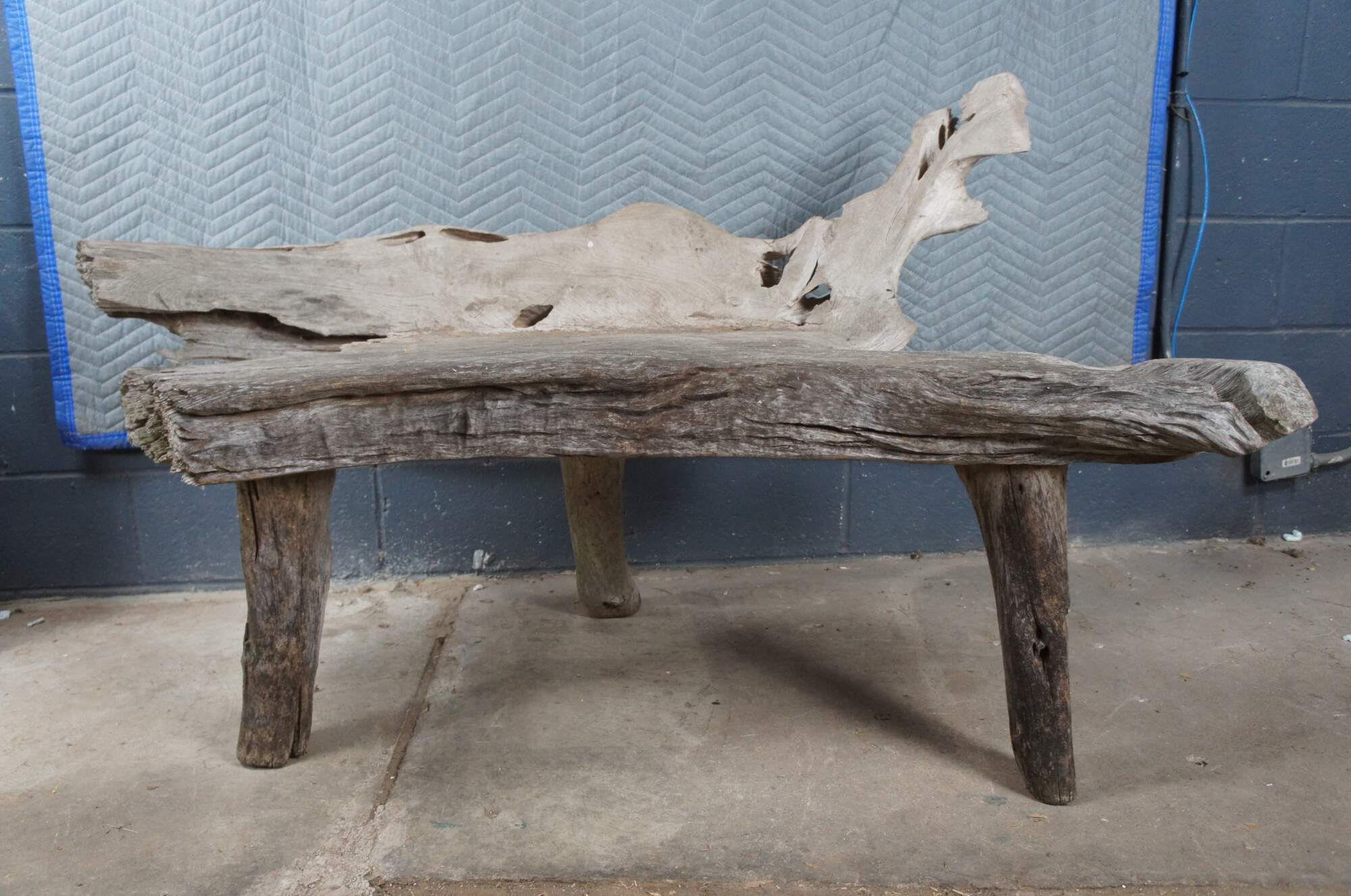 Vintage weathered teak otudoor bench. Features a beautiful organic form with three legs.