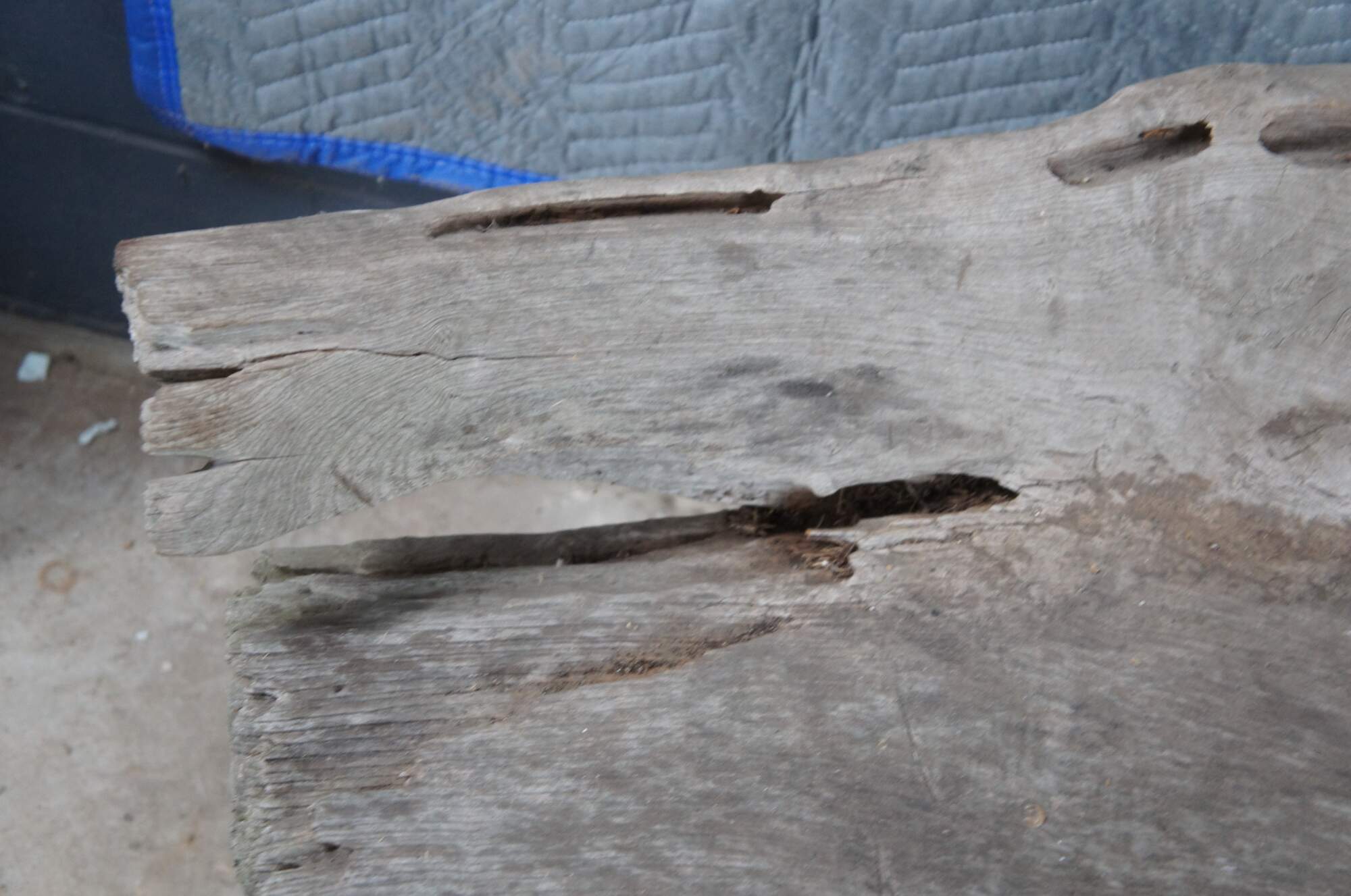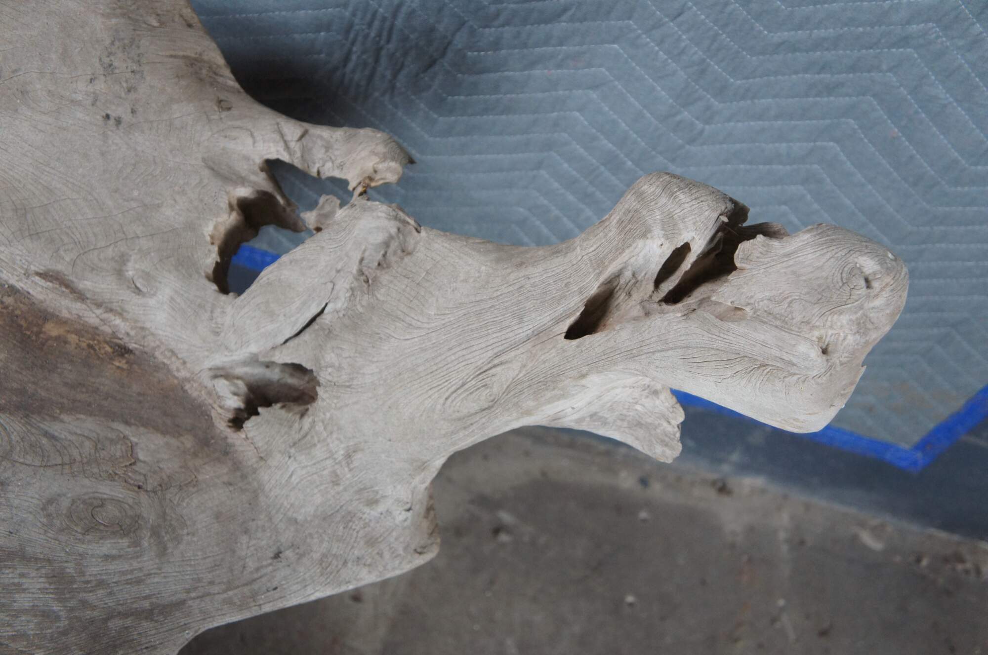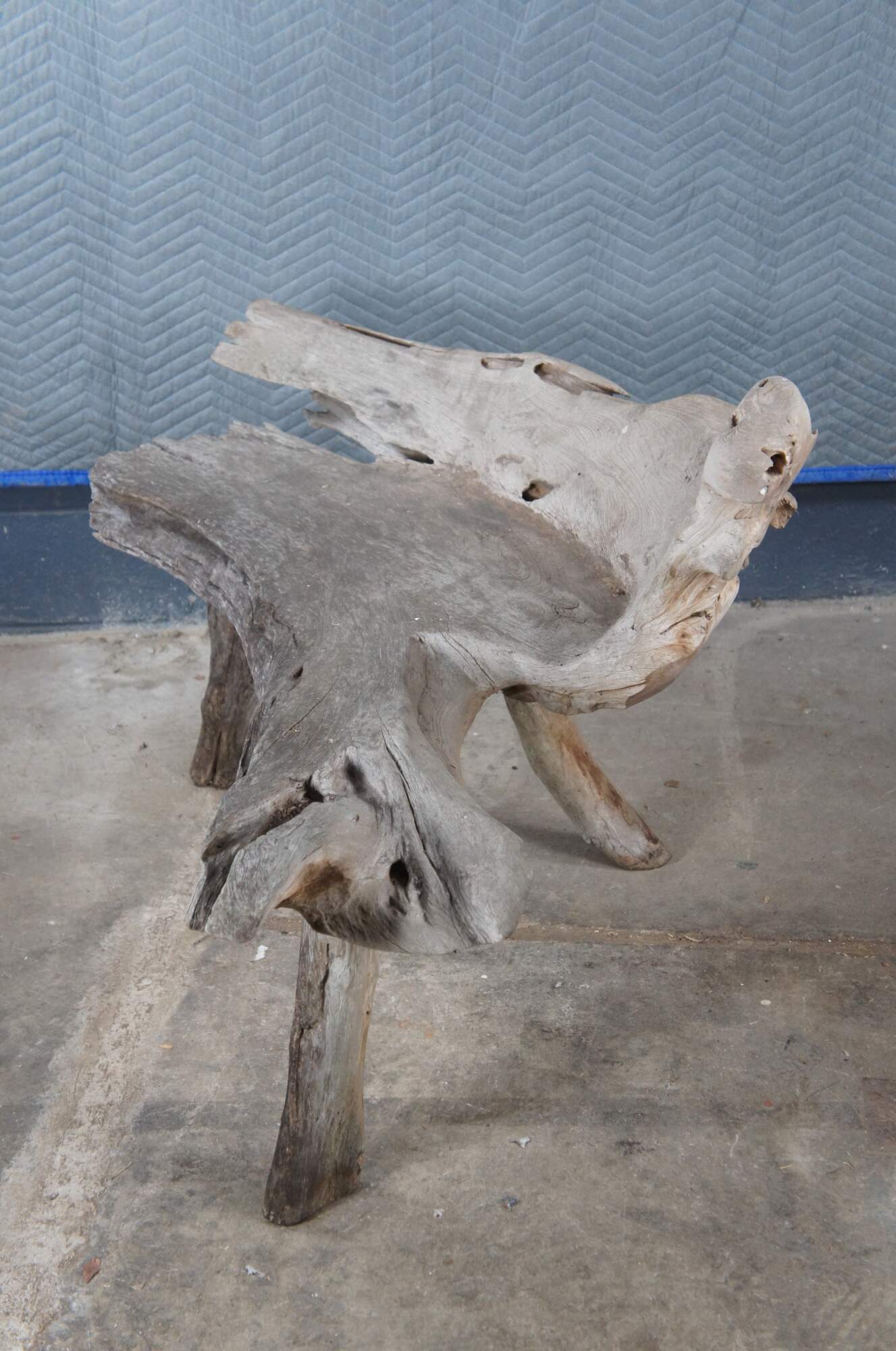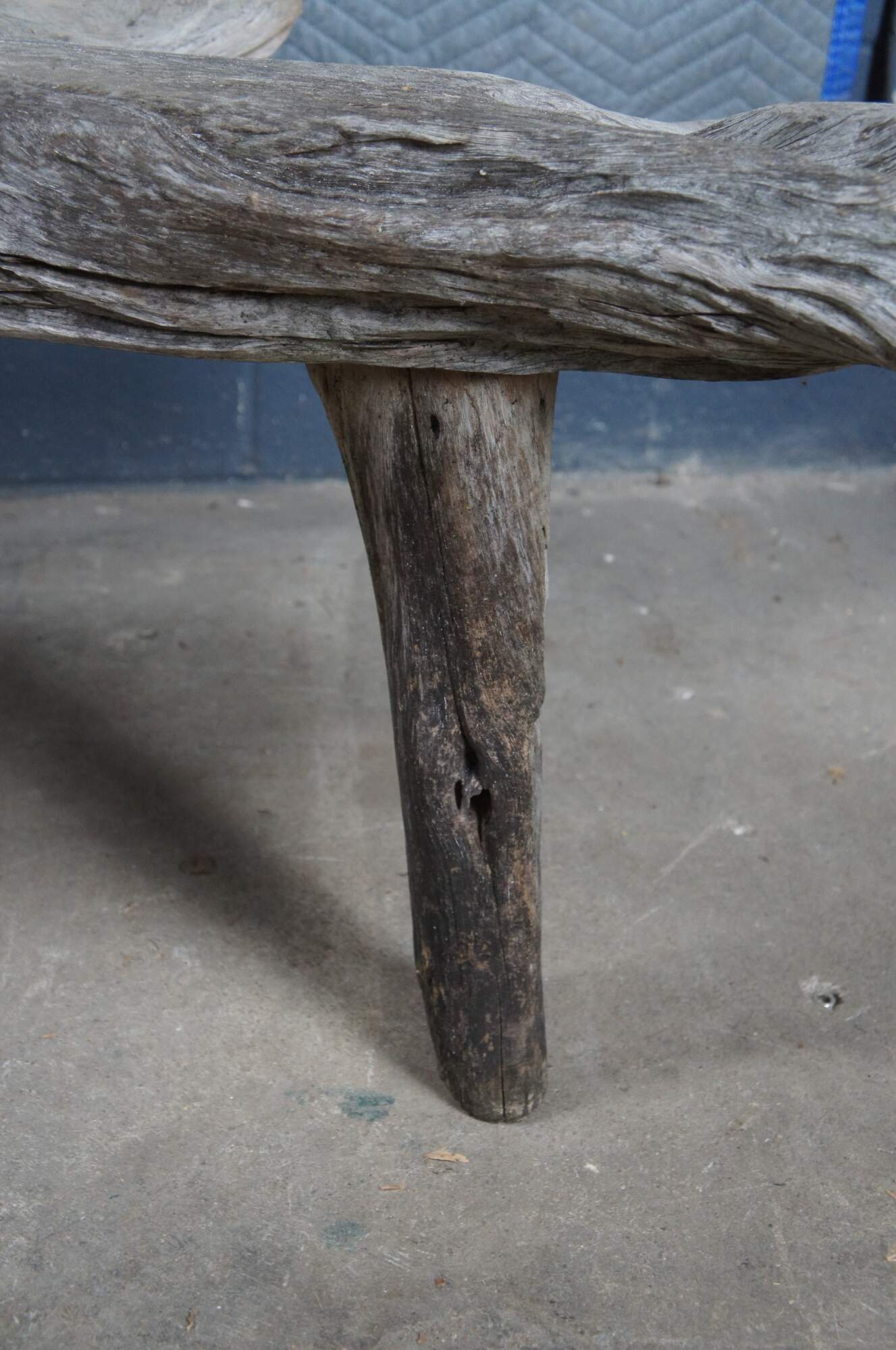 Vintage weathered teak otudoor bench. Features a beautiful organic form with three legs.