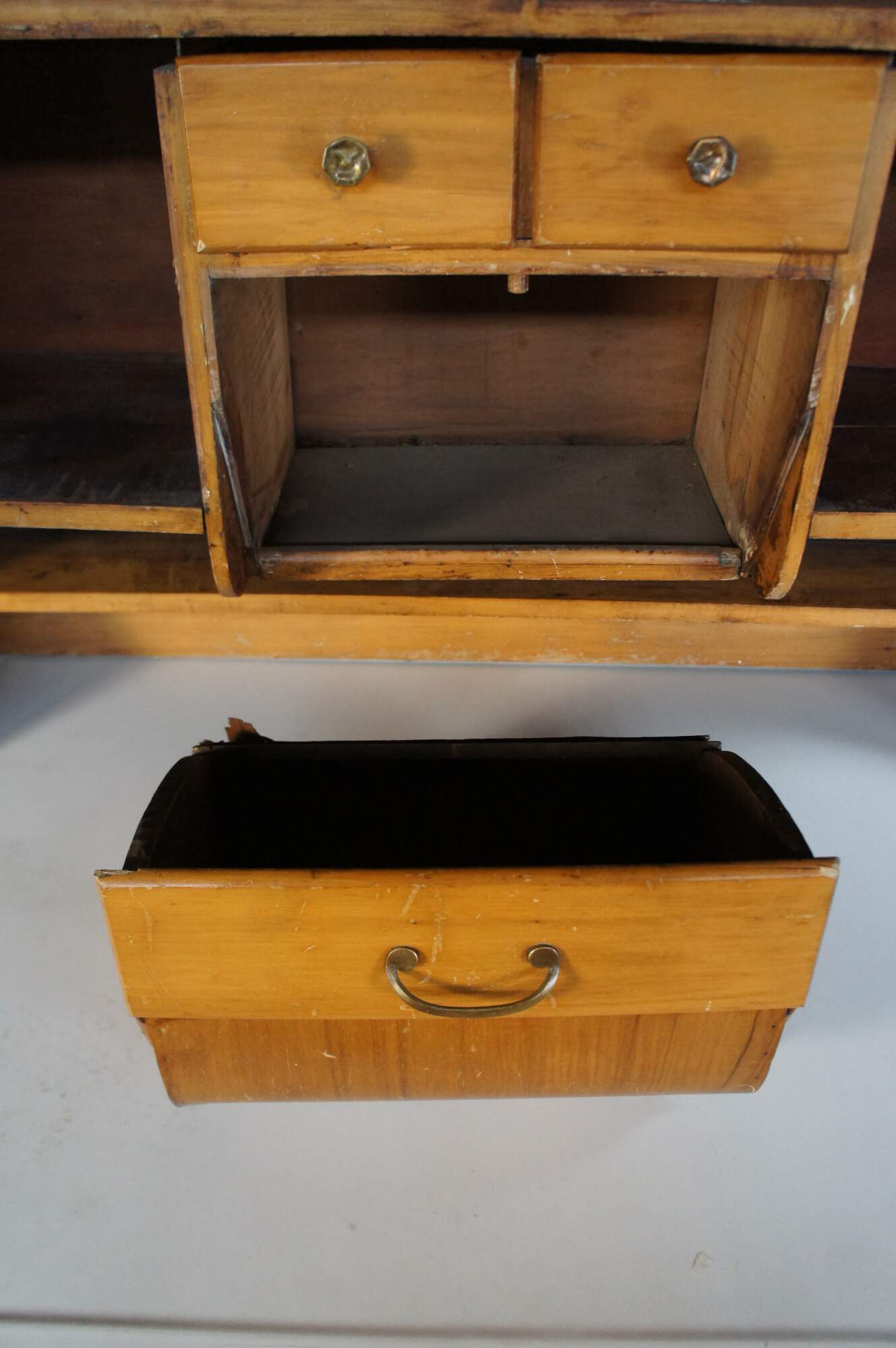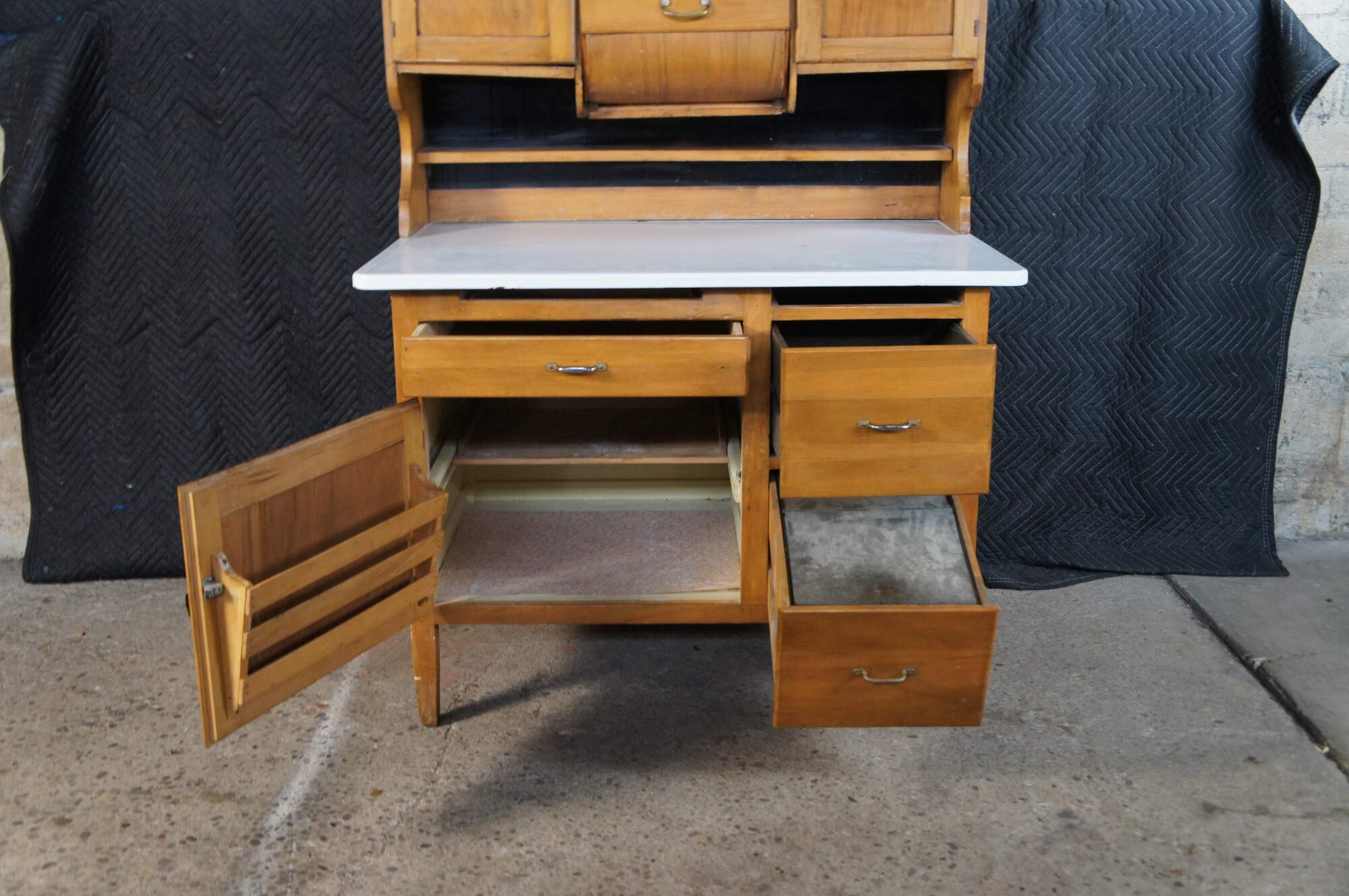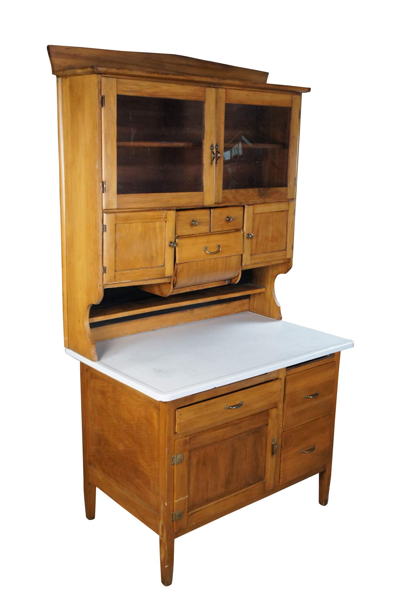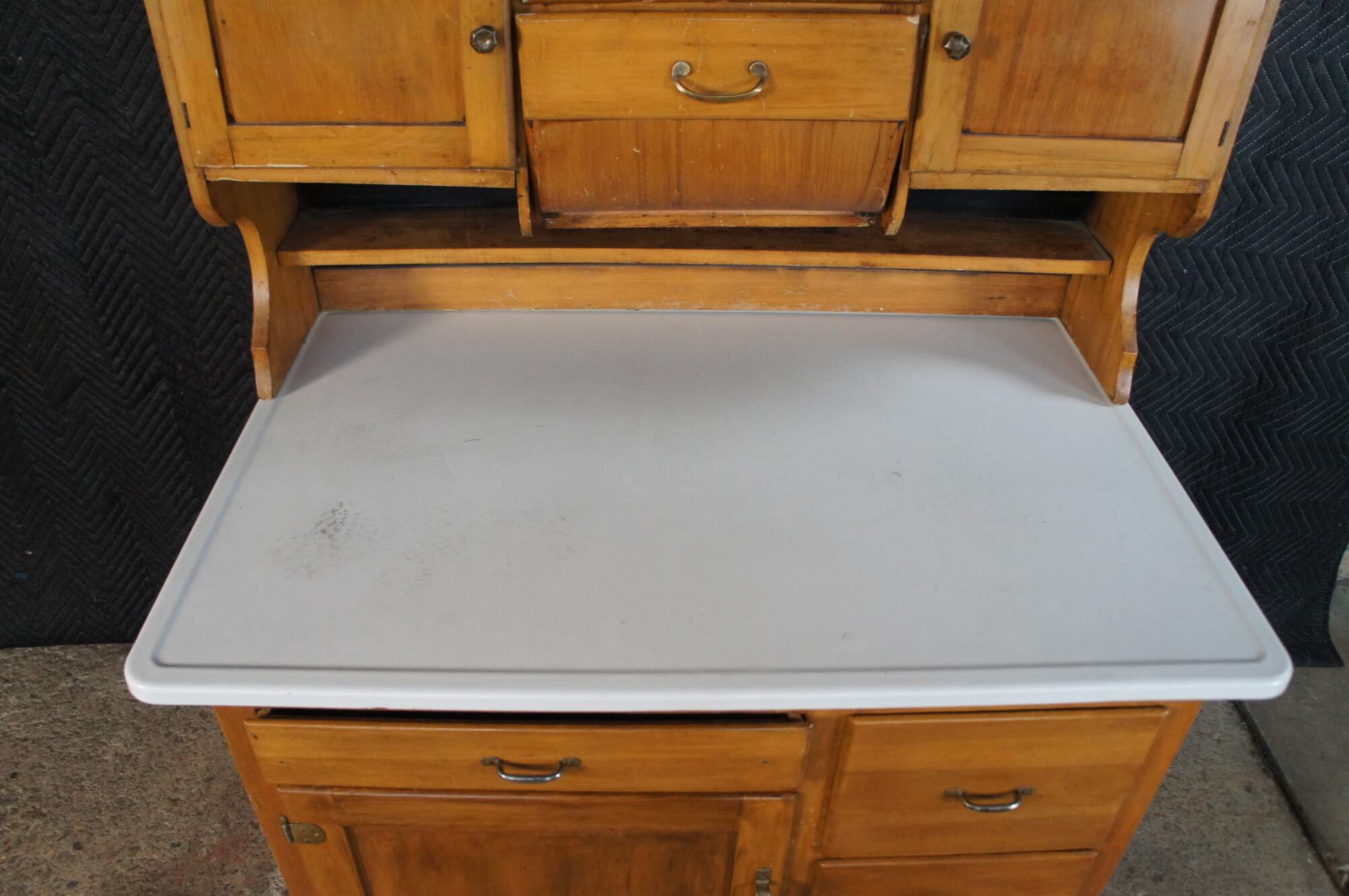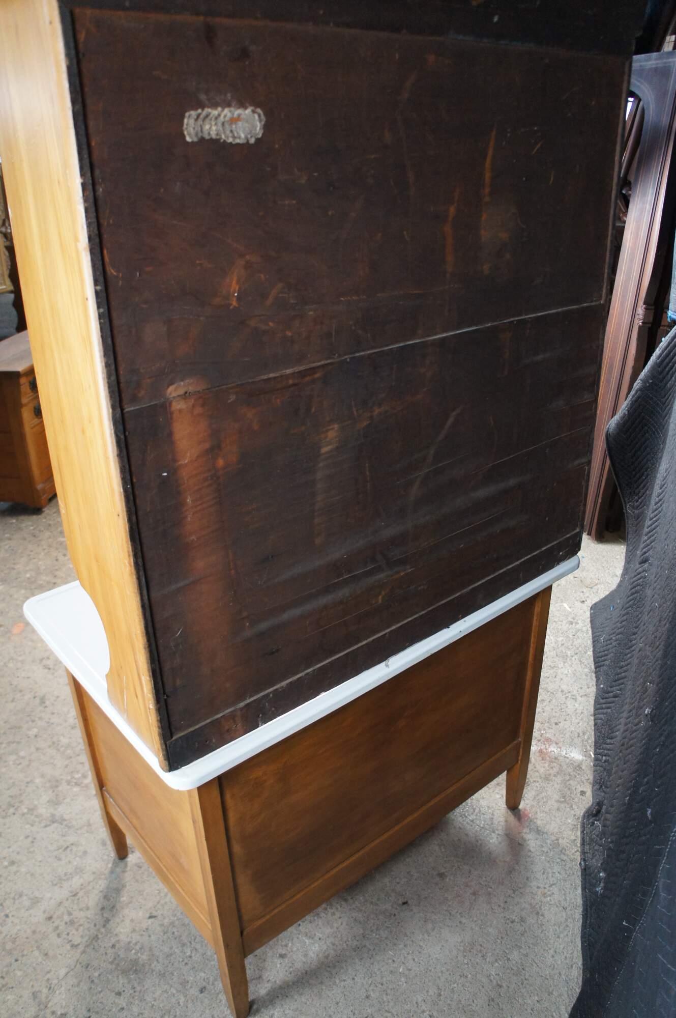 Antique primitive oak kitchen Hoosier cabinet / cupboard with enameled countertop.