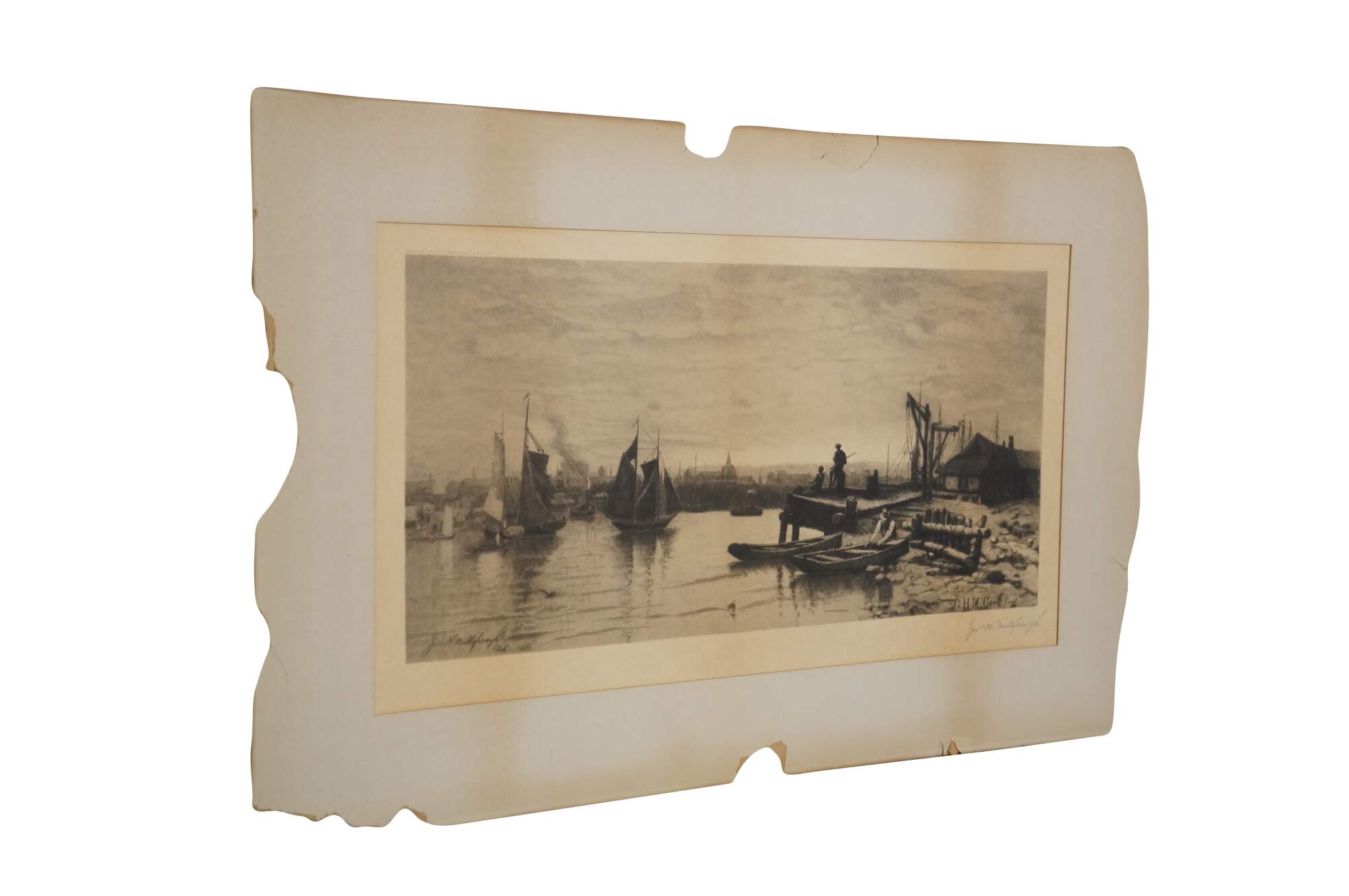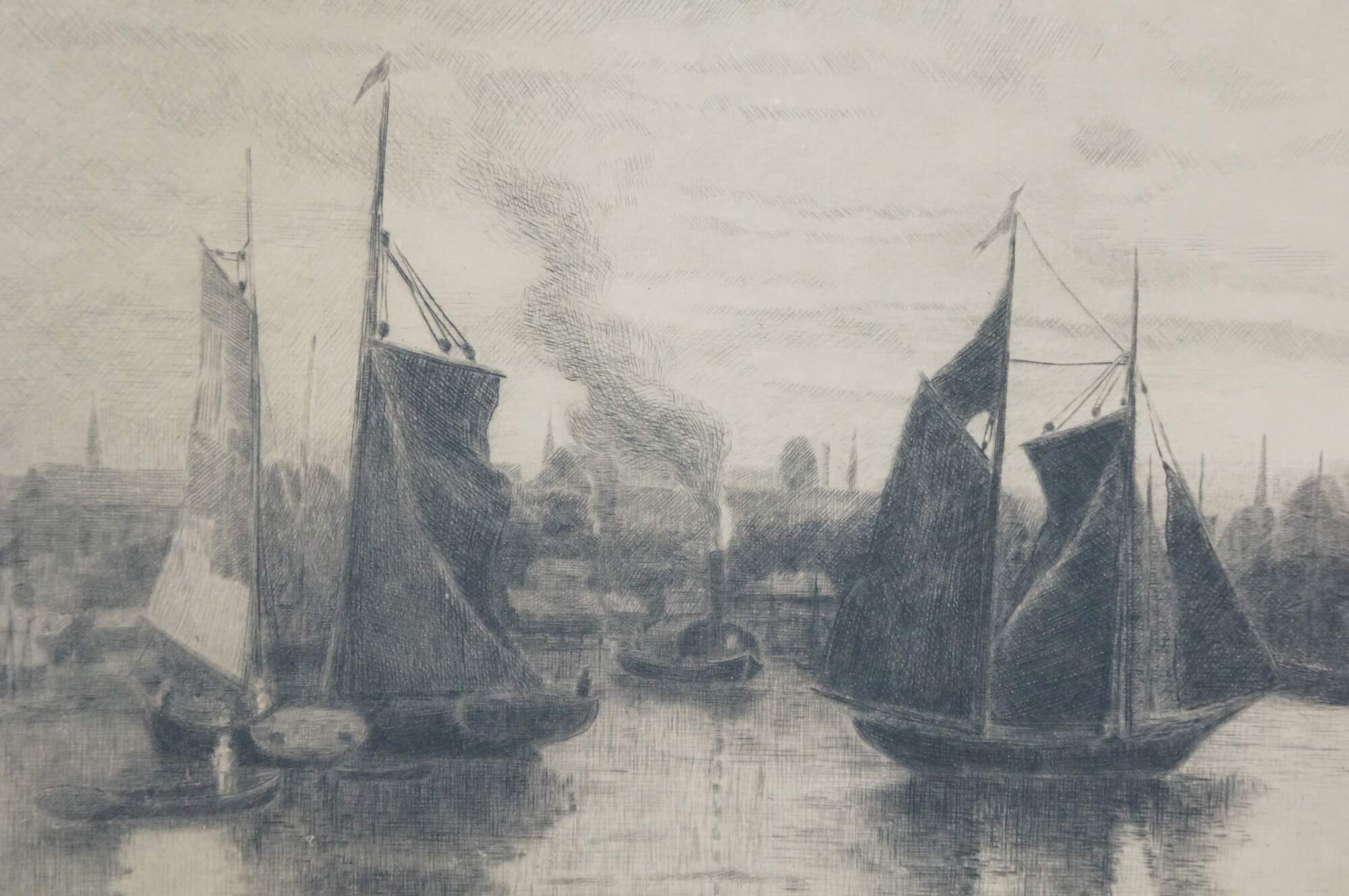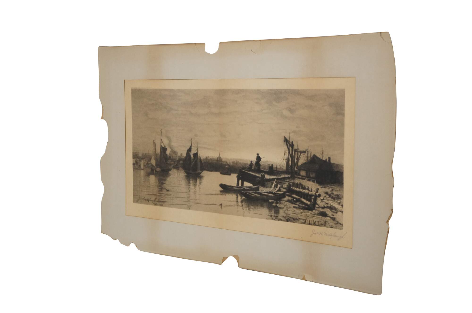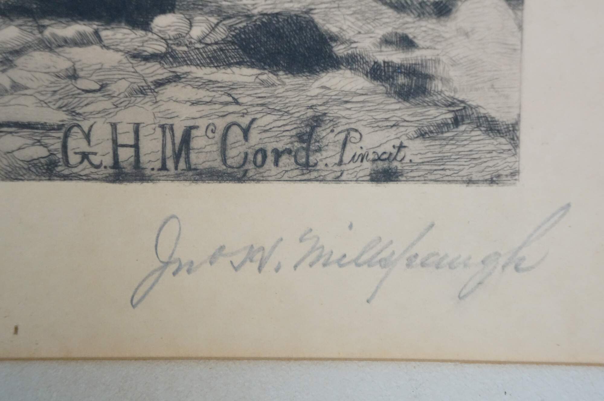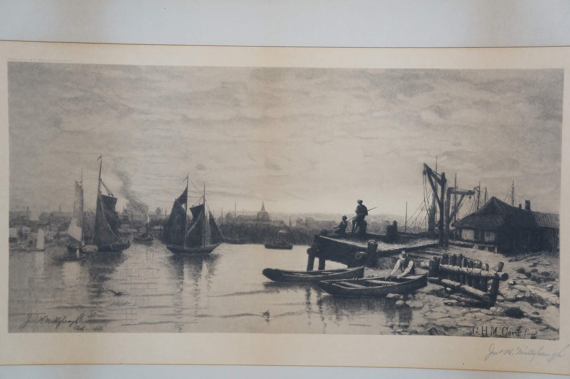 Late 19th century black and white signed etching by John Hill Millspaugh after a painting by George Herbert McCord. Nautical landscape showing sailboats near a small dock with figures and a town across the water. Signed in plate Jn H Millspaugh Etch'r 1886, lower left and G.H. McCord Pinxit, lower right. Pencil signed, lower right. Copyright 1887 by C. Klackner, 17 E 17th St, N.Y. Paper mounted on cardstock; gray mat; unframed.