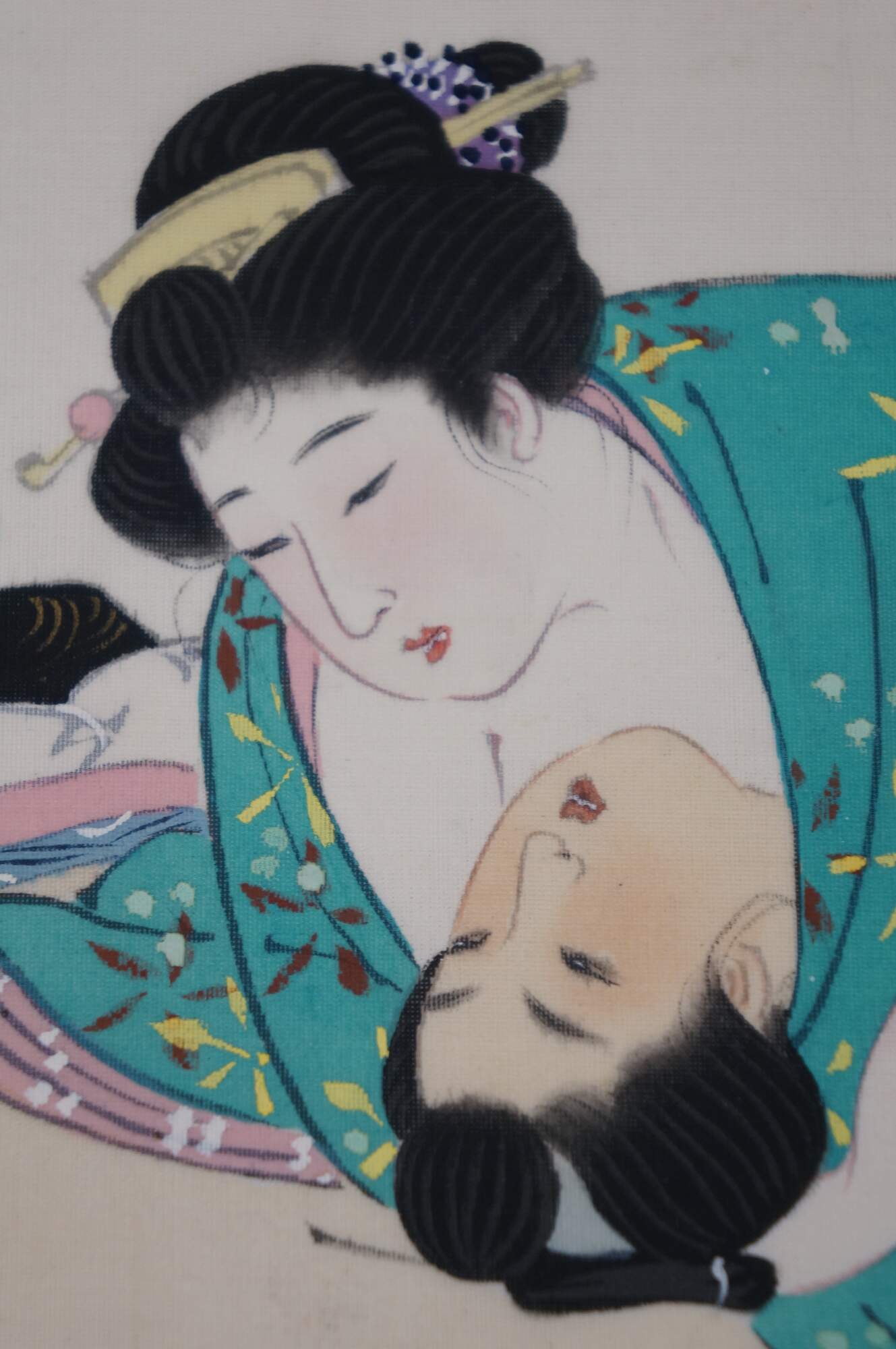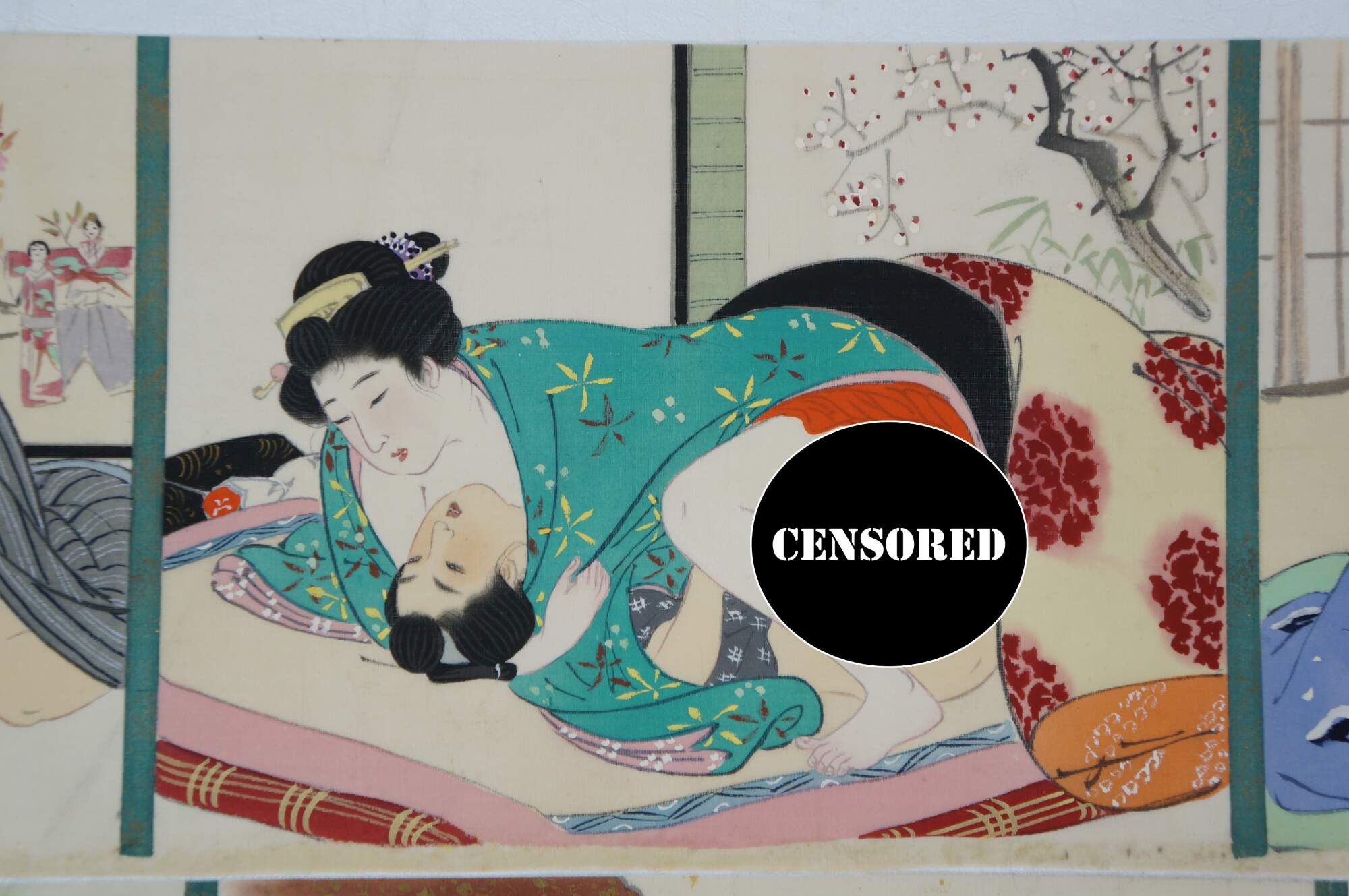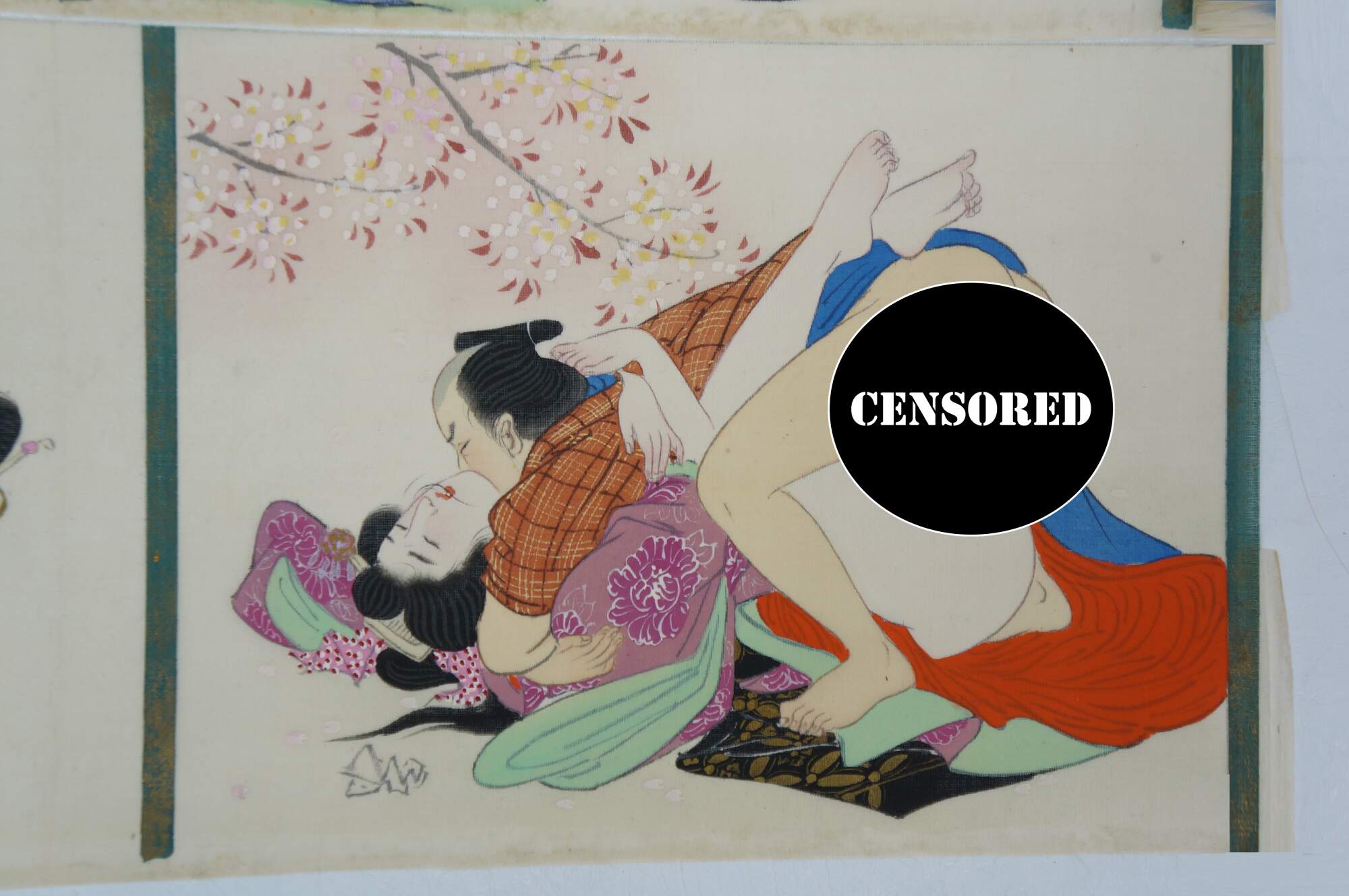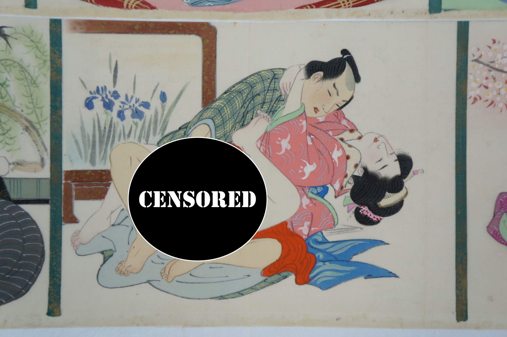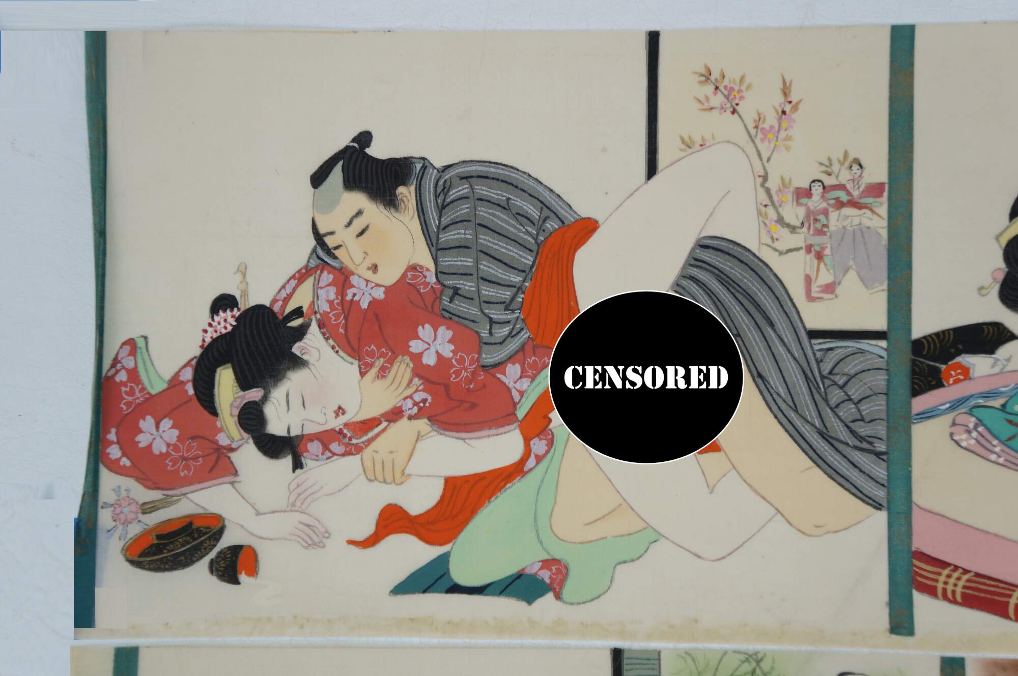 Large vintage mid 20th century ukioo-e style shunga / Japanese erotic scroll featuring six panels of amorous Kama Sutra style scenes hand painted on silk with green and gold ribbon dividers.