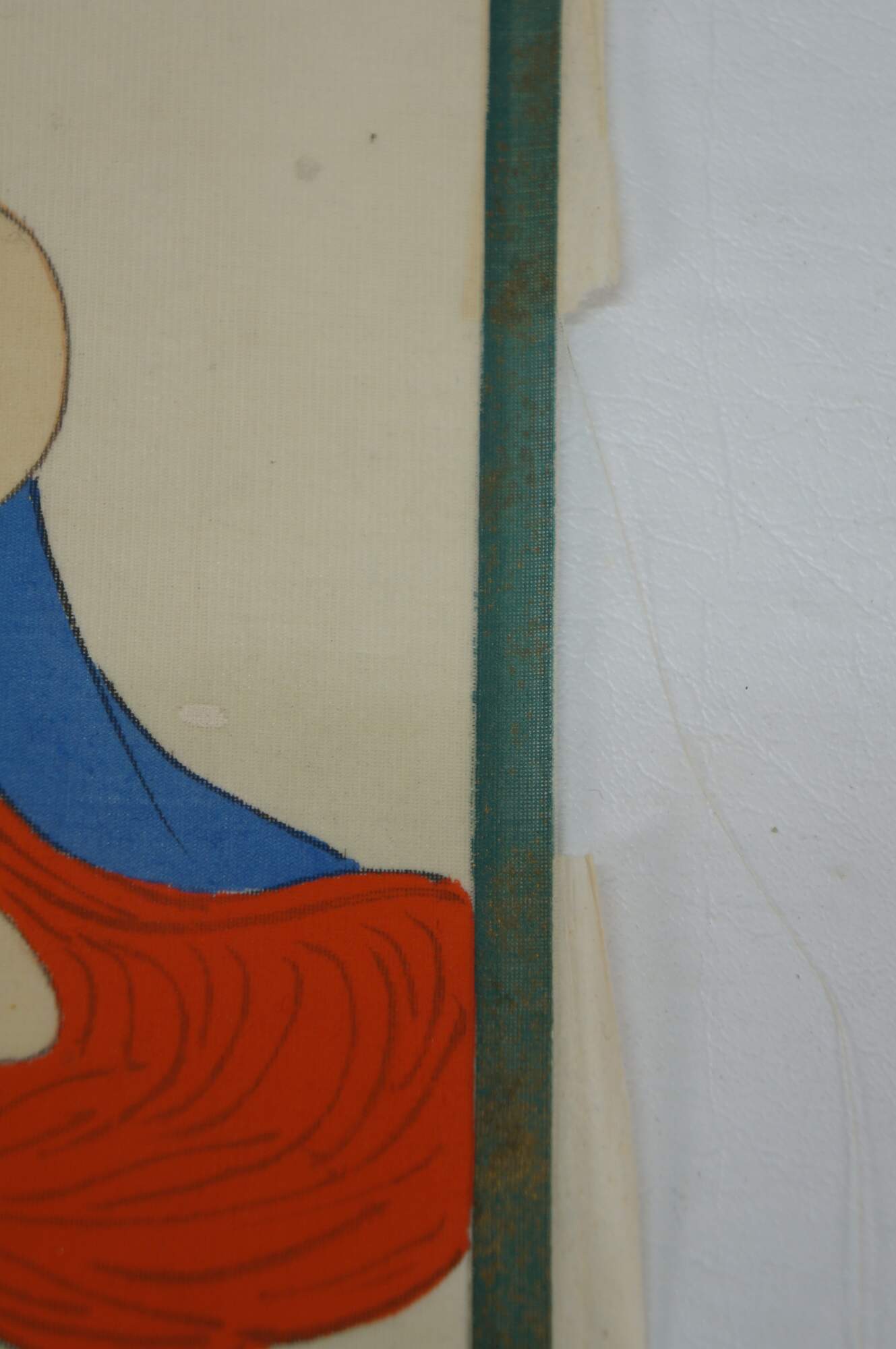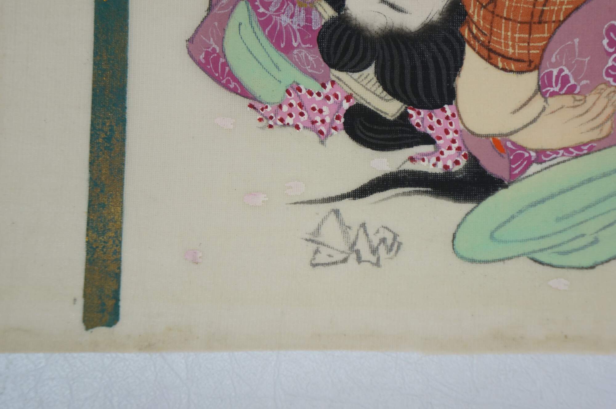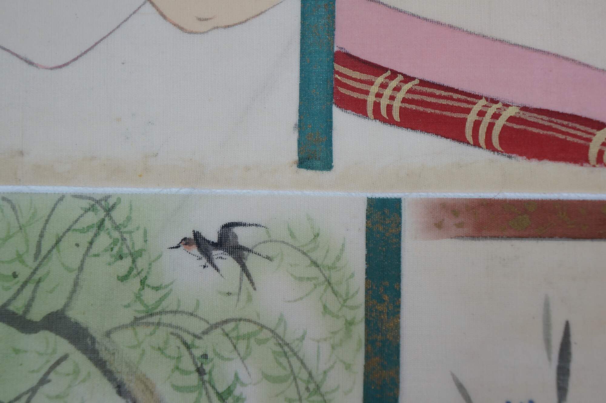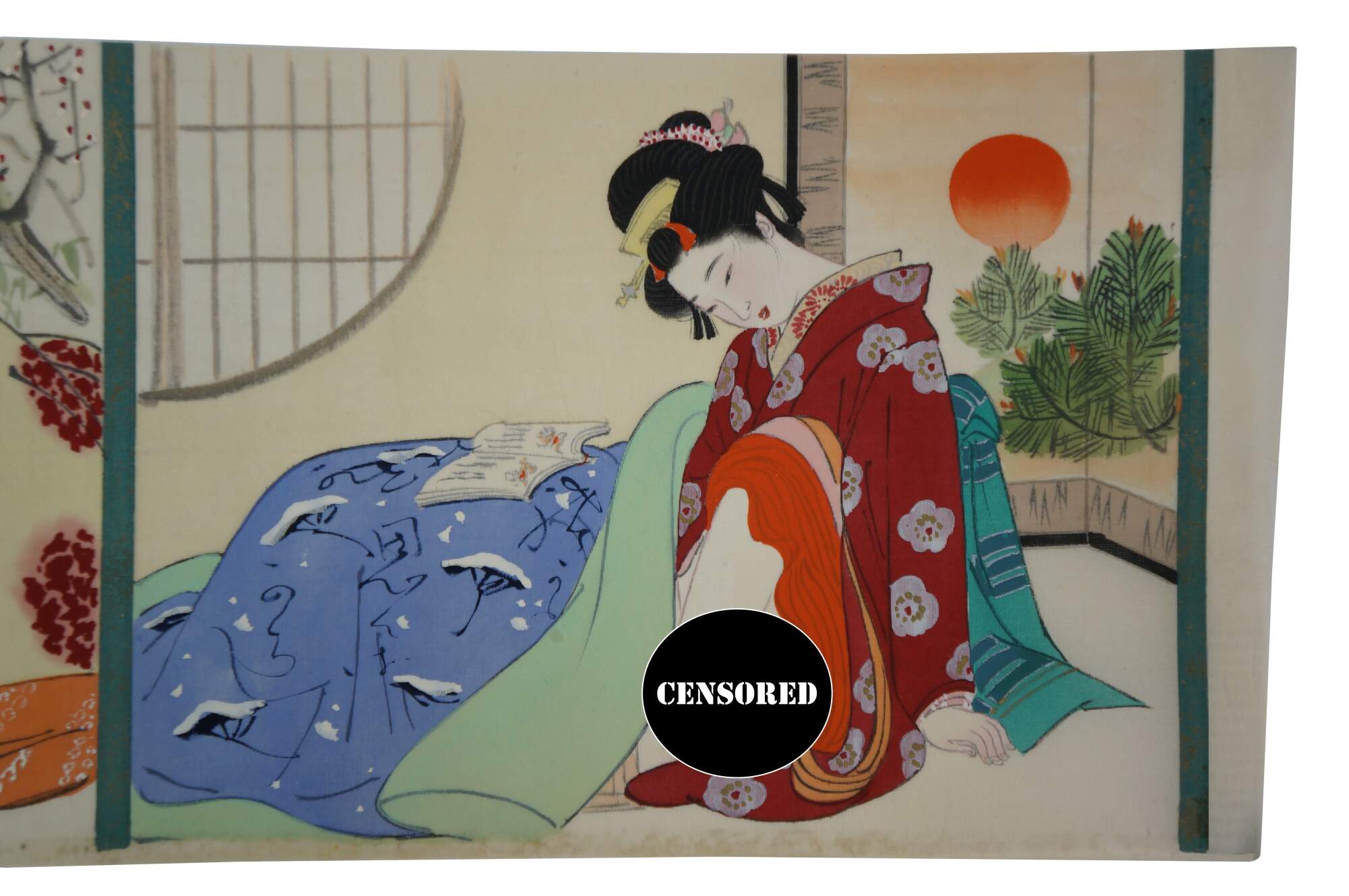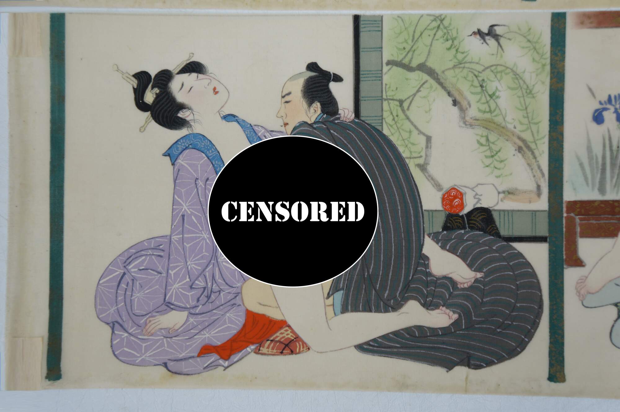 Large vintage mid 20th century ukioo-e style shunga / Japanese erotic scroll featuring six panels of amorous Kama Sutra style scenes hand painted on silk with green and gold ribbon dividers.