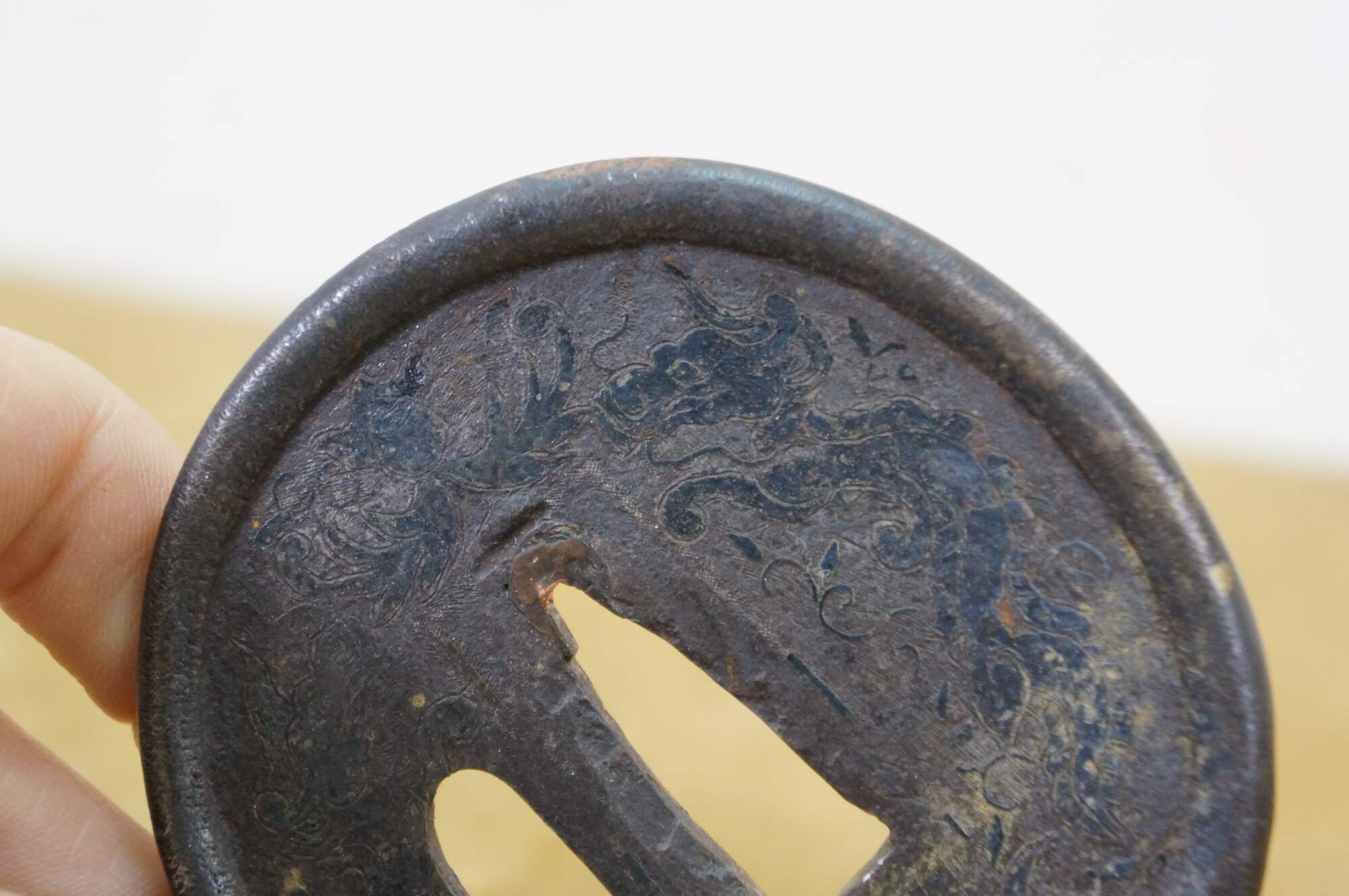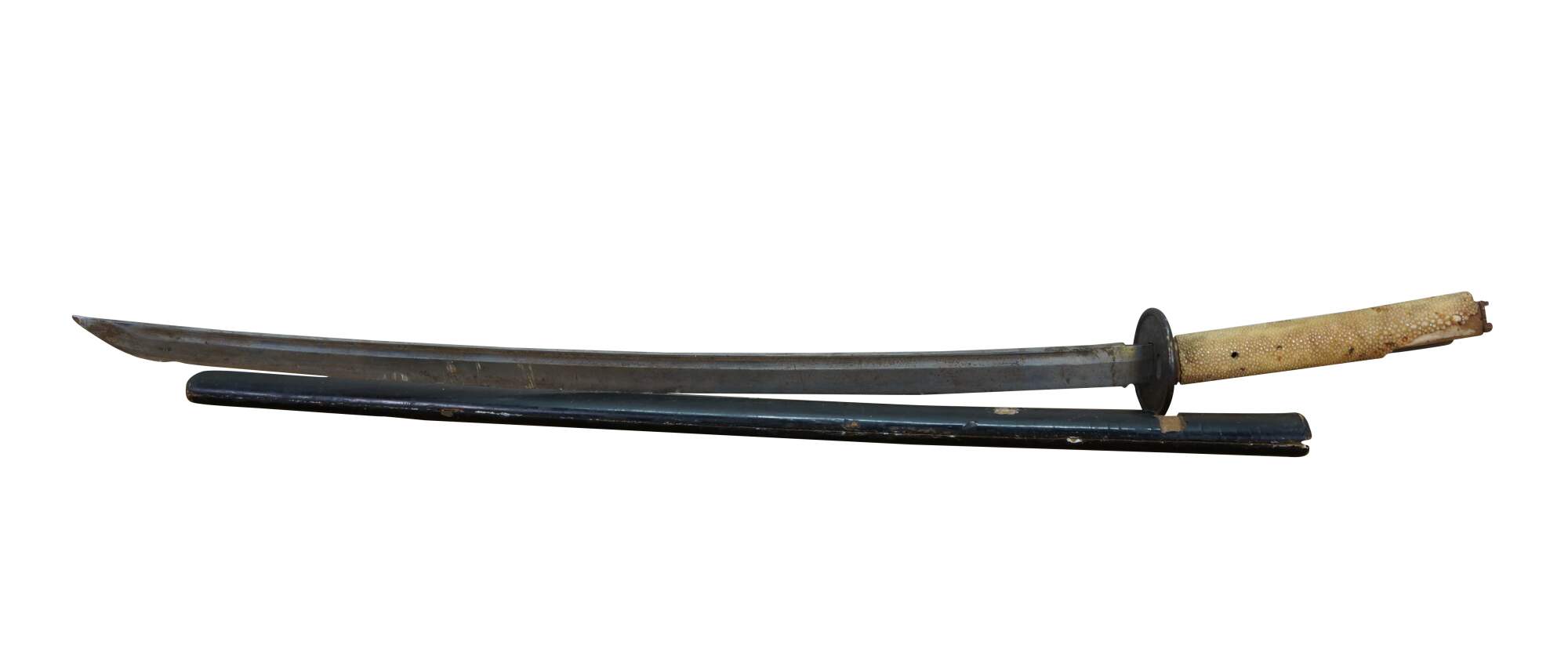 Antique Japanese katana / samurai sword. Same / white rayskin over wood on the tsuak (handle / hilt. Tsuba (guard) etched with flowers and dragons. Nakago (tang) signed. Black lacquered wood saya (scabbard).