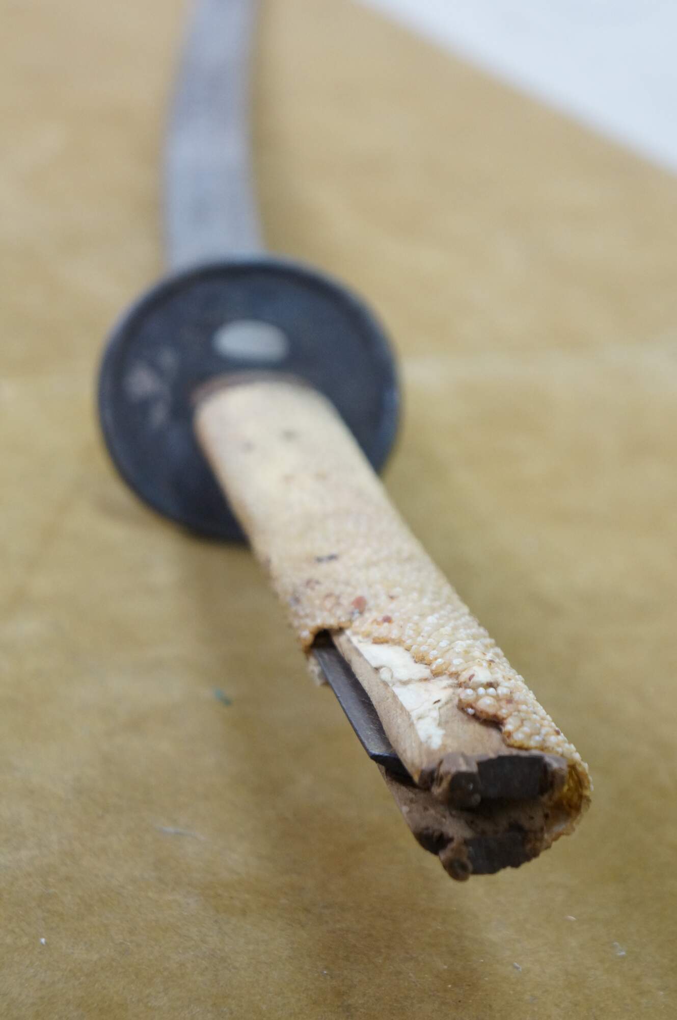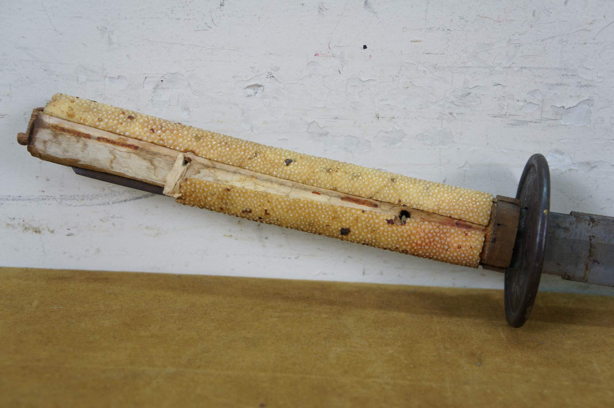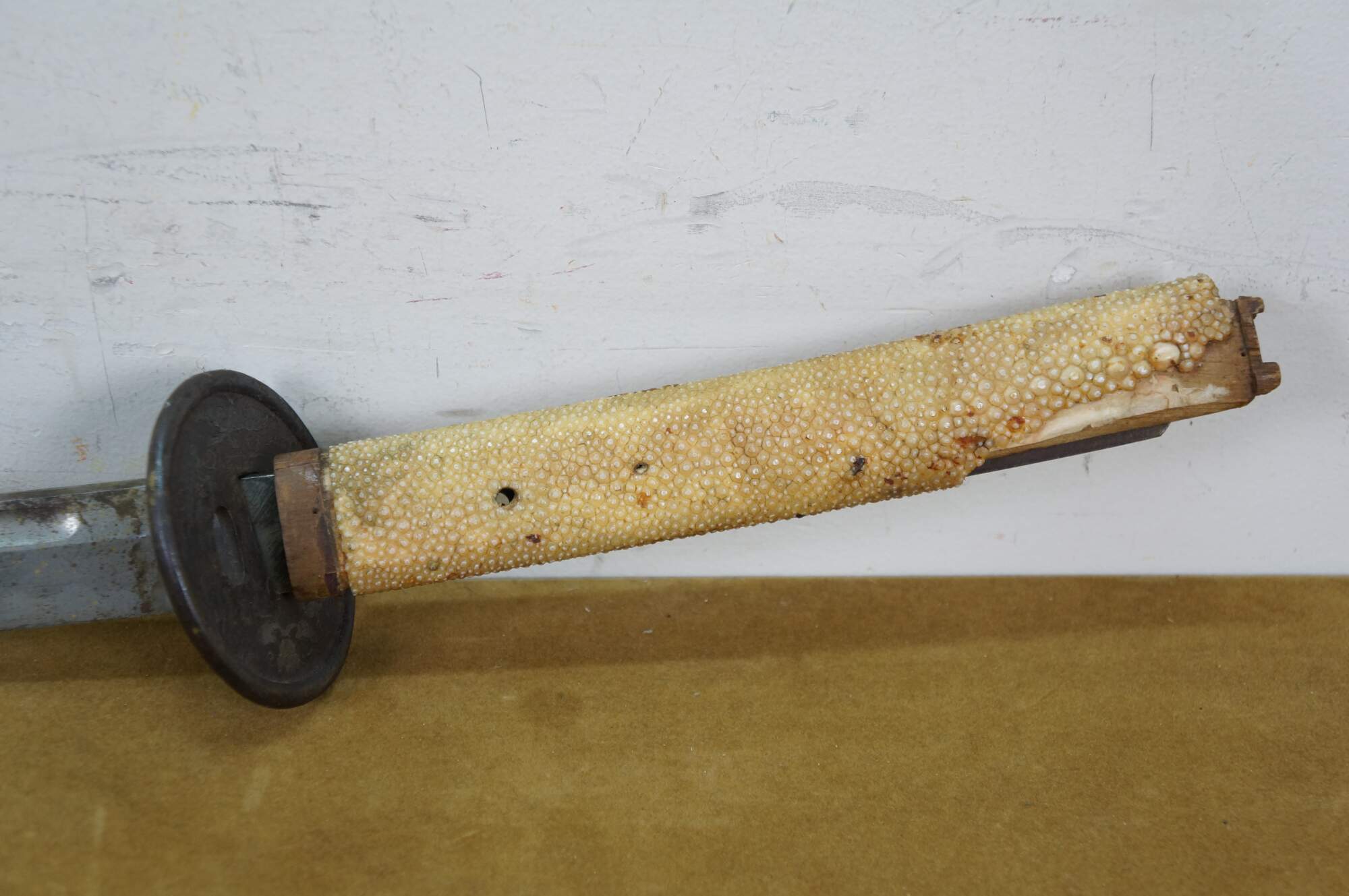 Ray skin, also known as samegawa, is the skin of a ray or shark, traditionally used to wrap the handle (tsuka) of a katana. It provides a textured, durable surface for a secure grip, preventing the sword from slipping during use.
