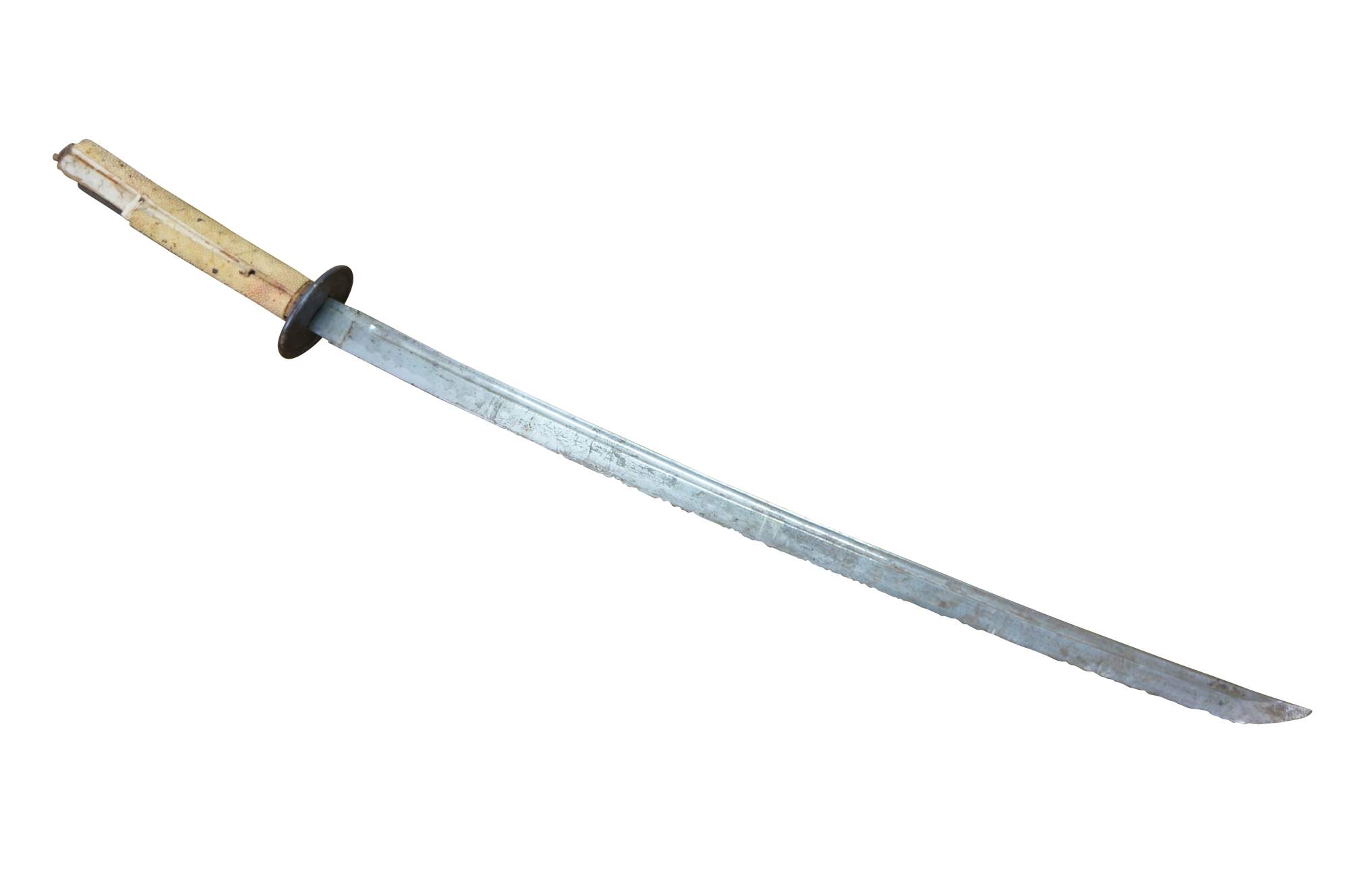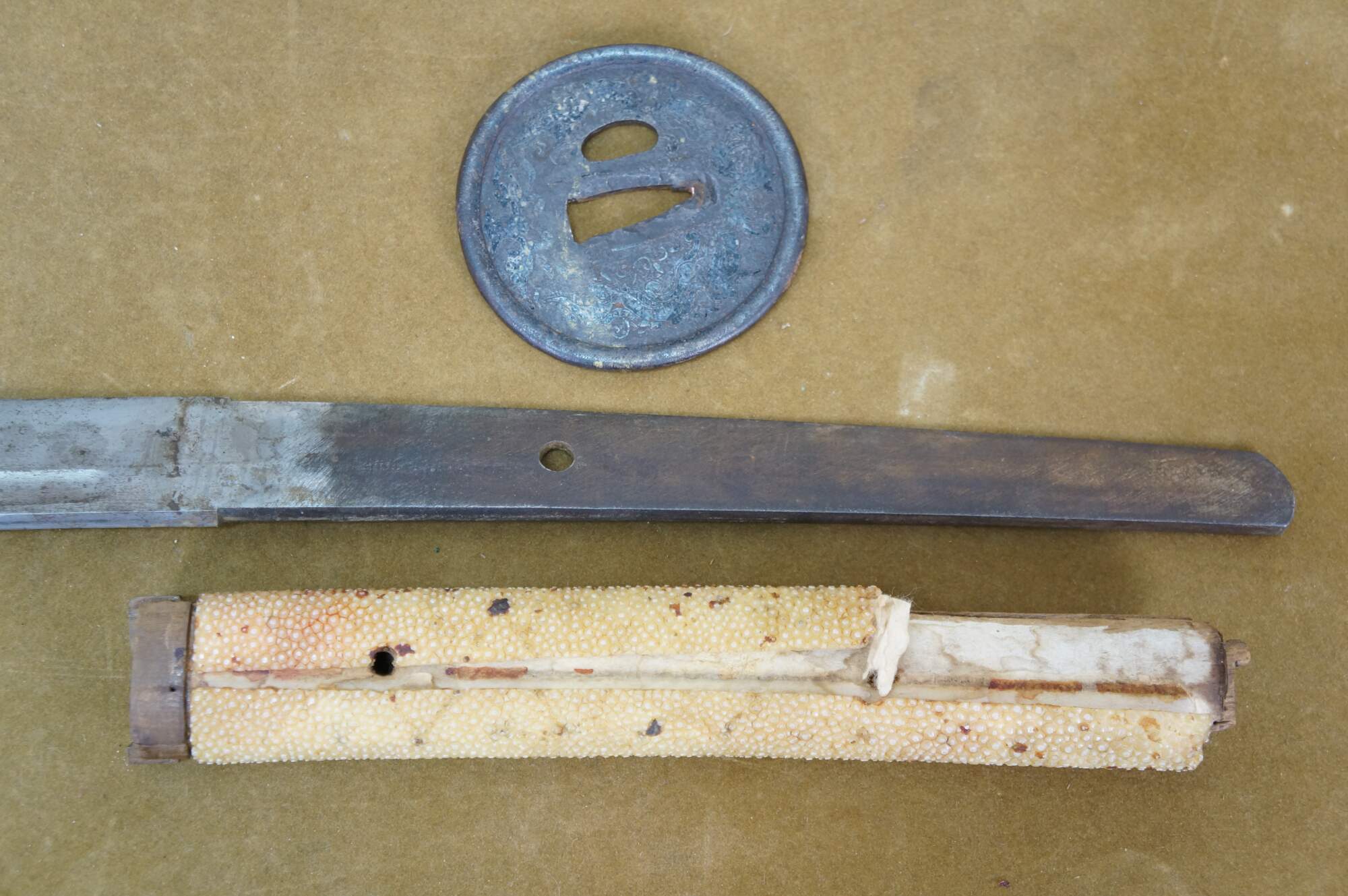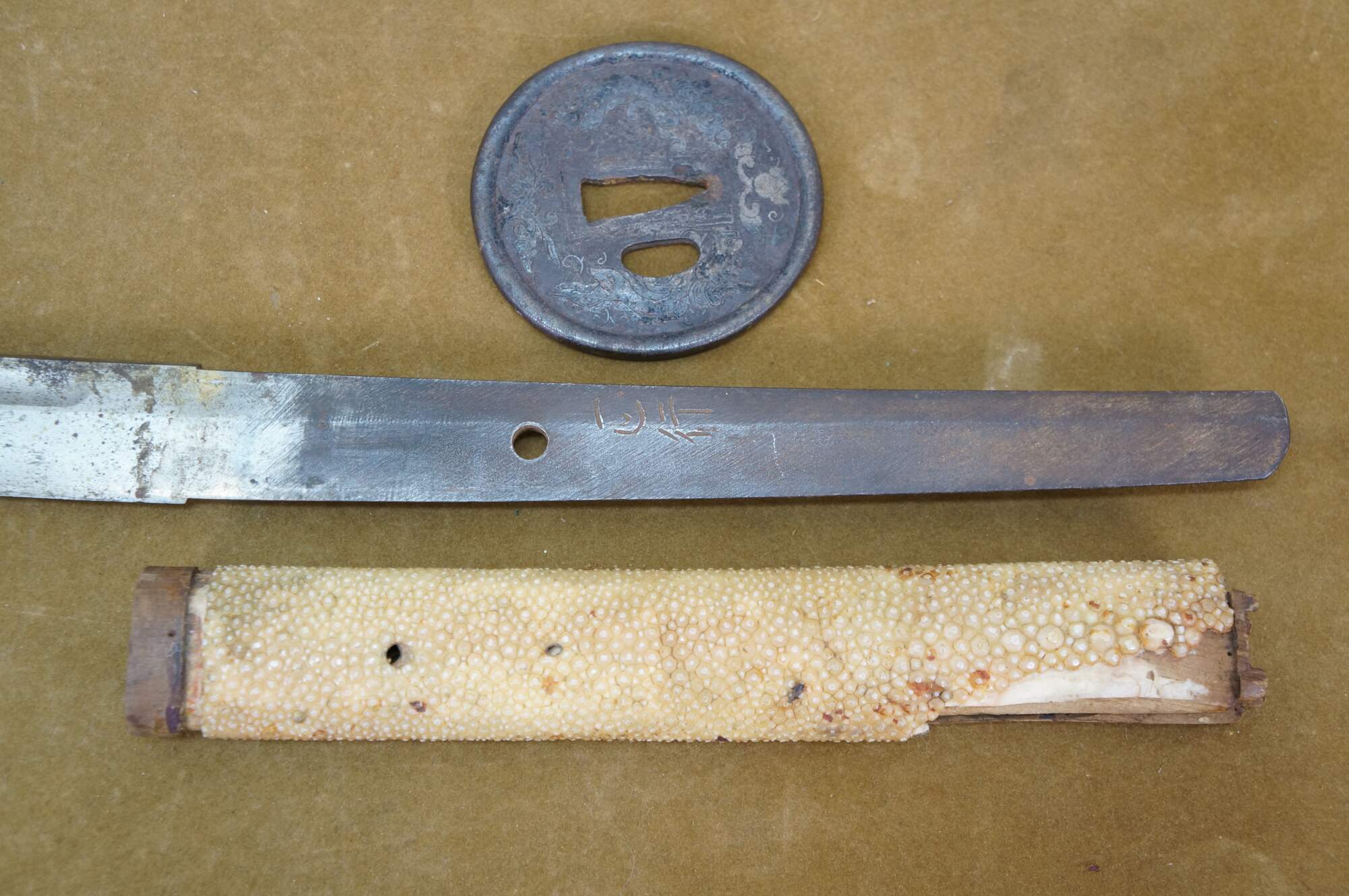 Ray skin, also known as samegawa, is the skin of a ray or shark, traditionally used to wrap the handle (tsuka) of a katana. It provides a textured, durable surface for a secure grip, preventing the sword from slipping during use.