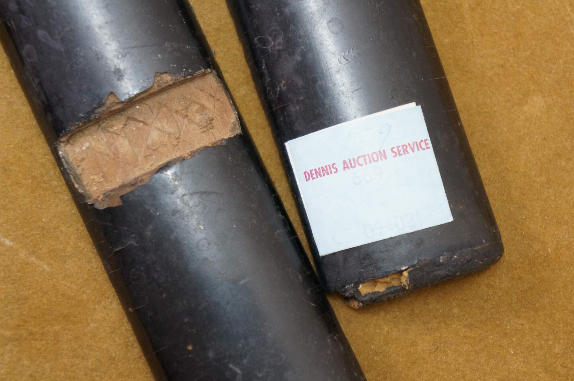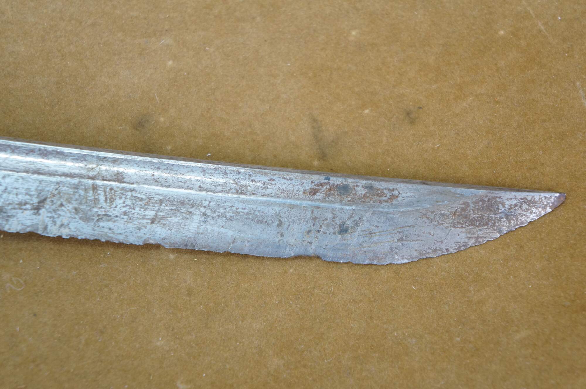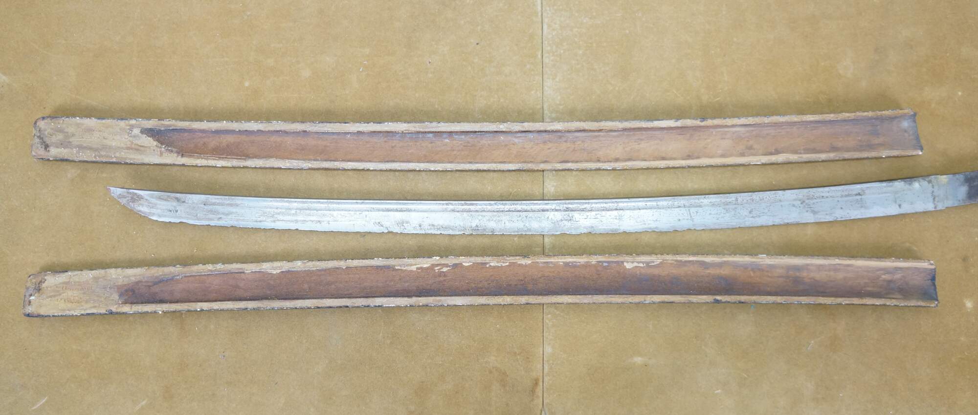 Fair Condition - Damage throughout; Scabbard split; some spots/rusting to metal; blade edge heavily chipped; handle split/damaged