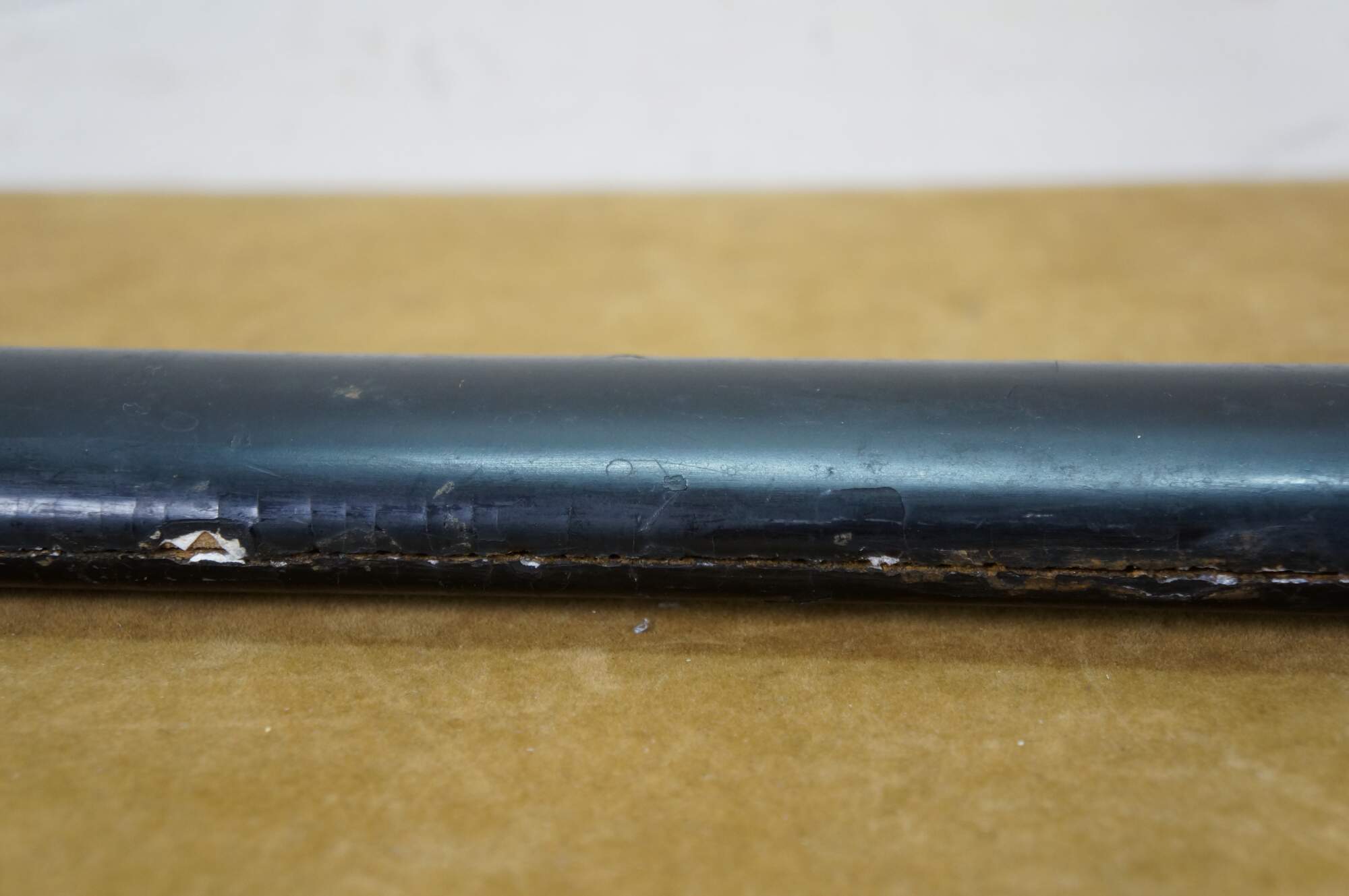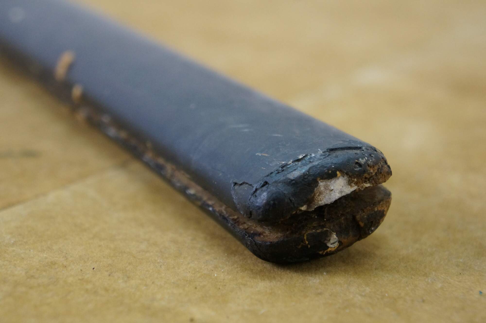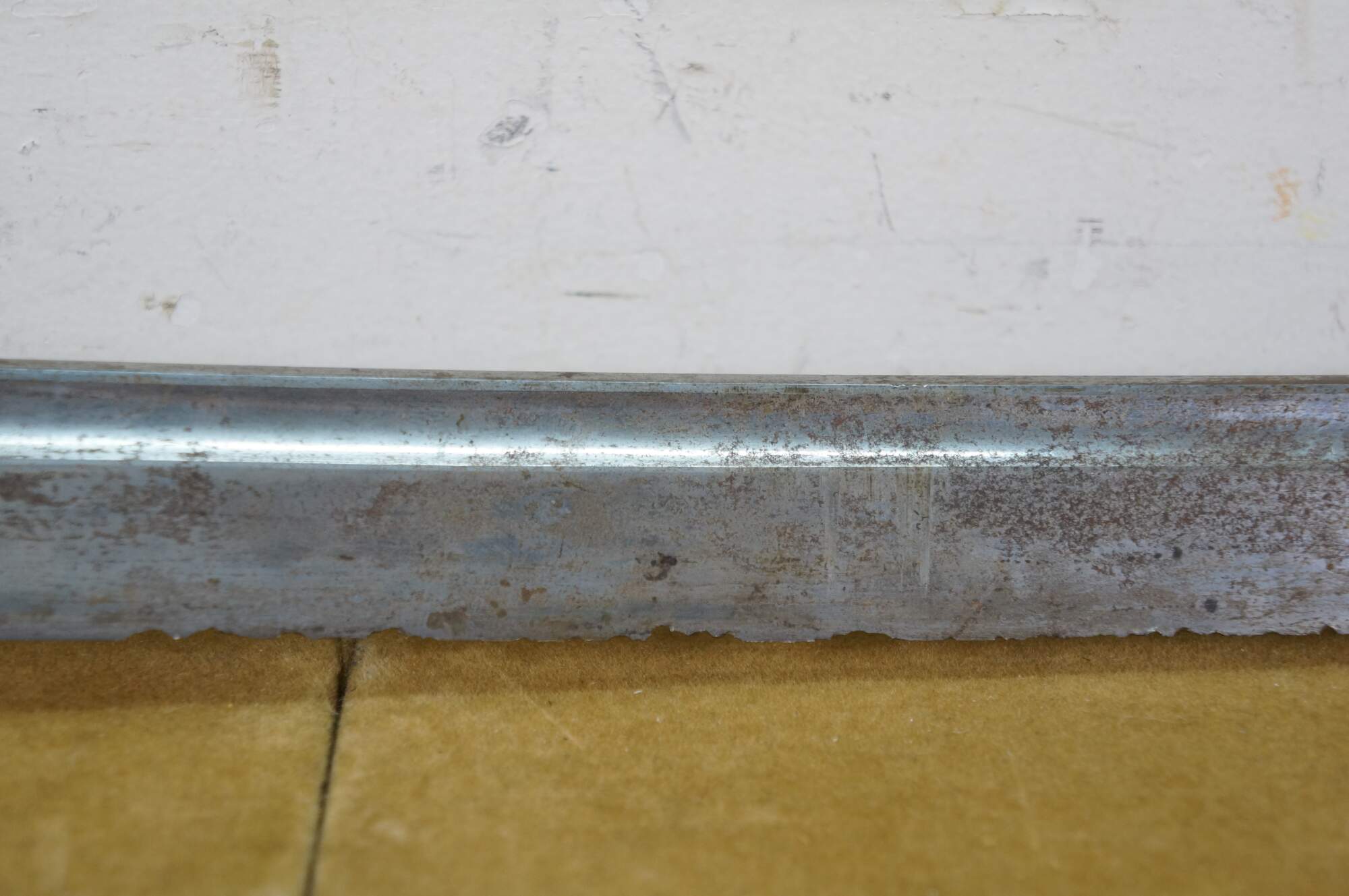 Fair Condition - Damage throughout; Scabbard split; some spots/rusting to metal; blade edge heavily chipped; handle split/damaged