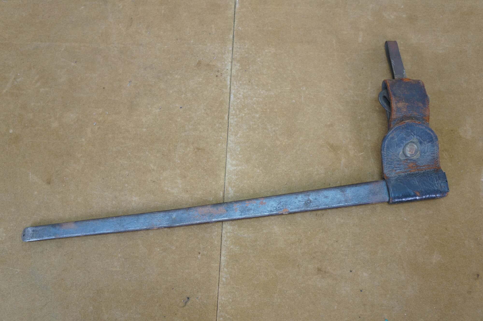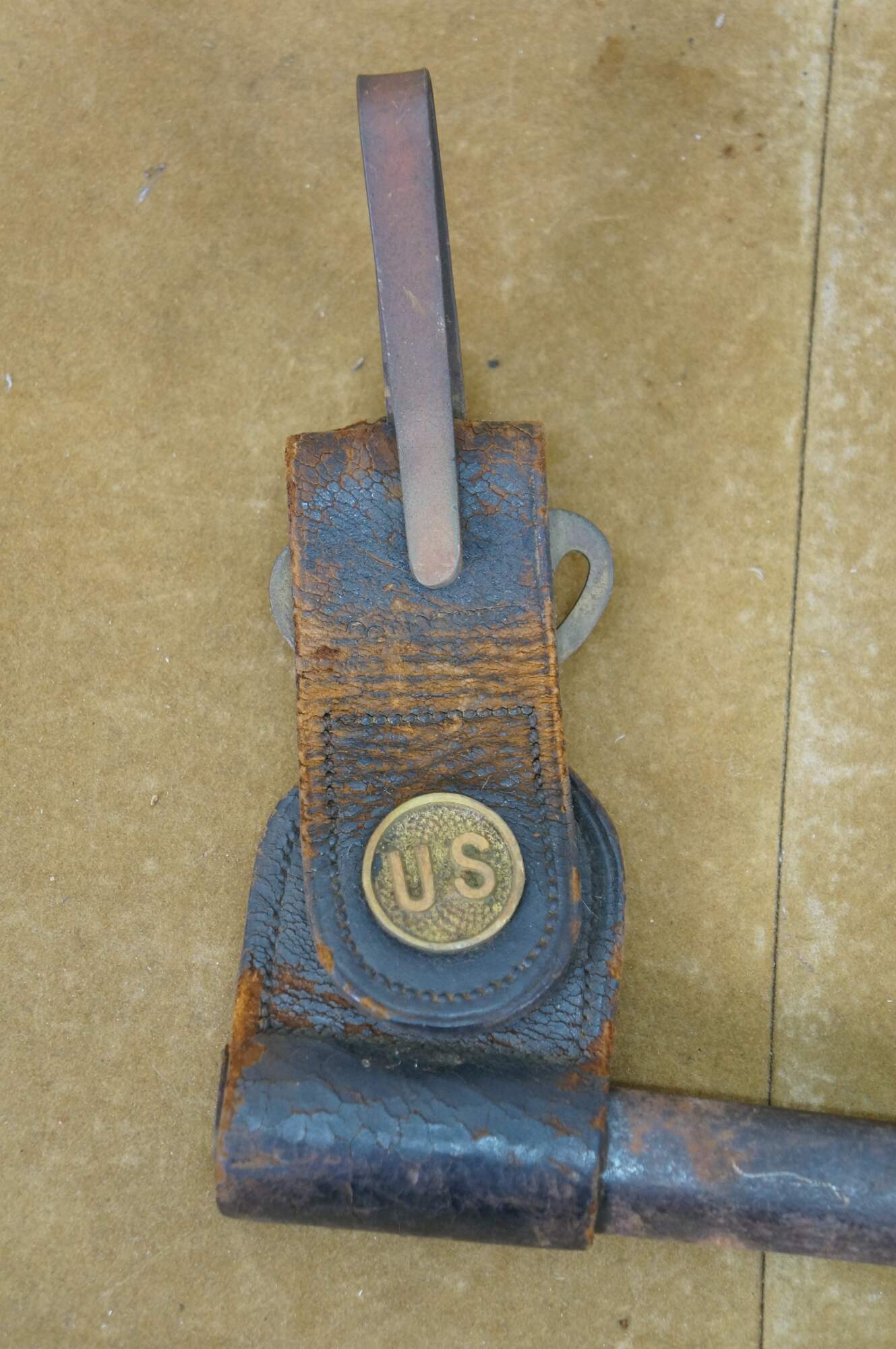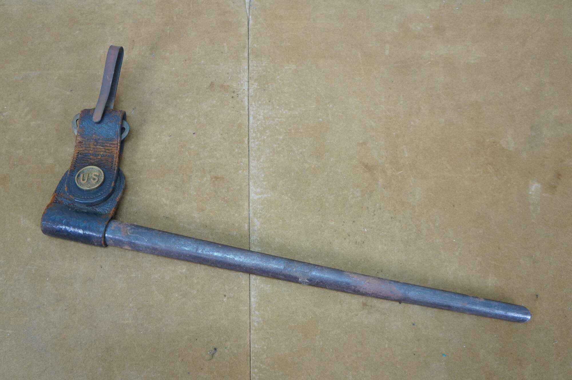 Late 19th century United States military socket bayonet for the Trapdoor Springfield M1873 rifle. Slim, tapered triangular blade with a slightly upturned tip. Metal scabbard with rotating leather frog with brass US button nand metal belt clip. Stamped US on ricasso.