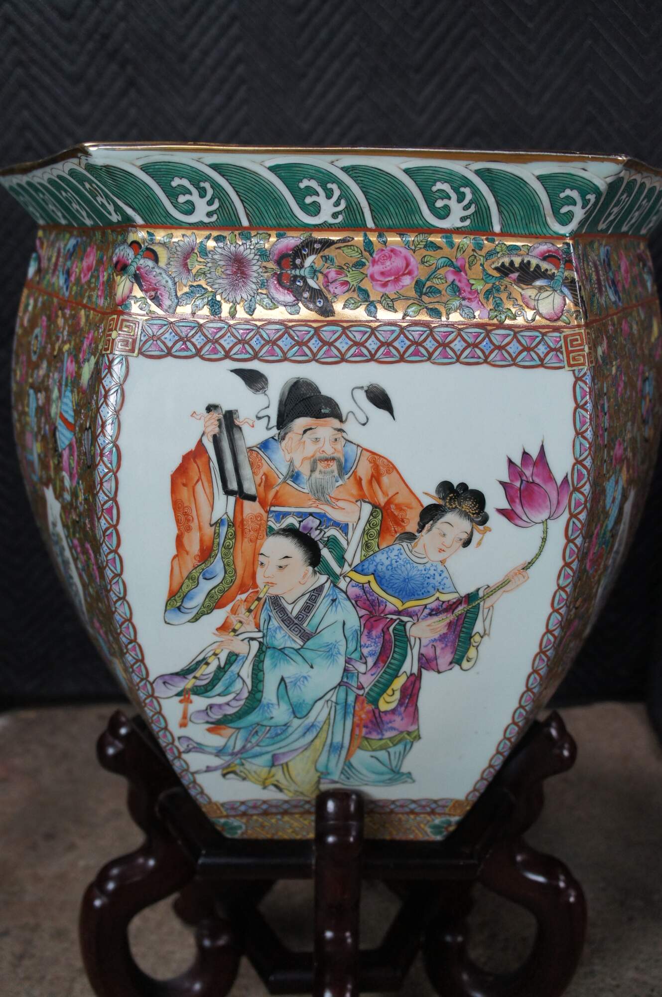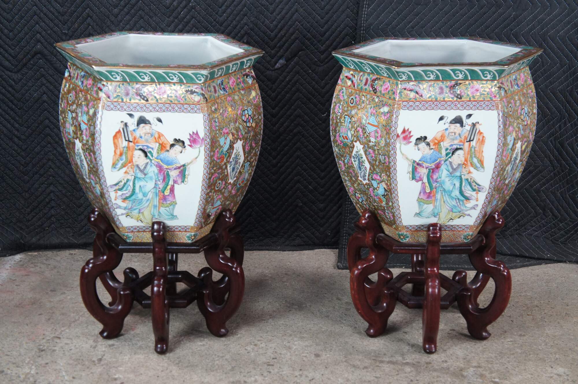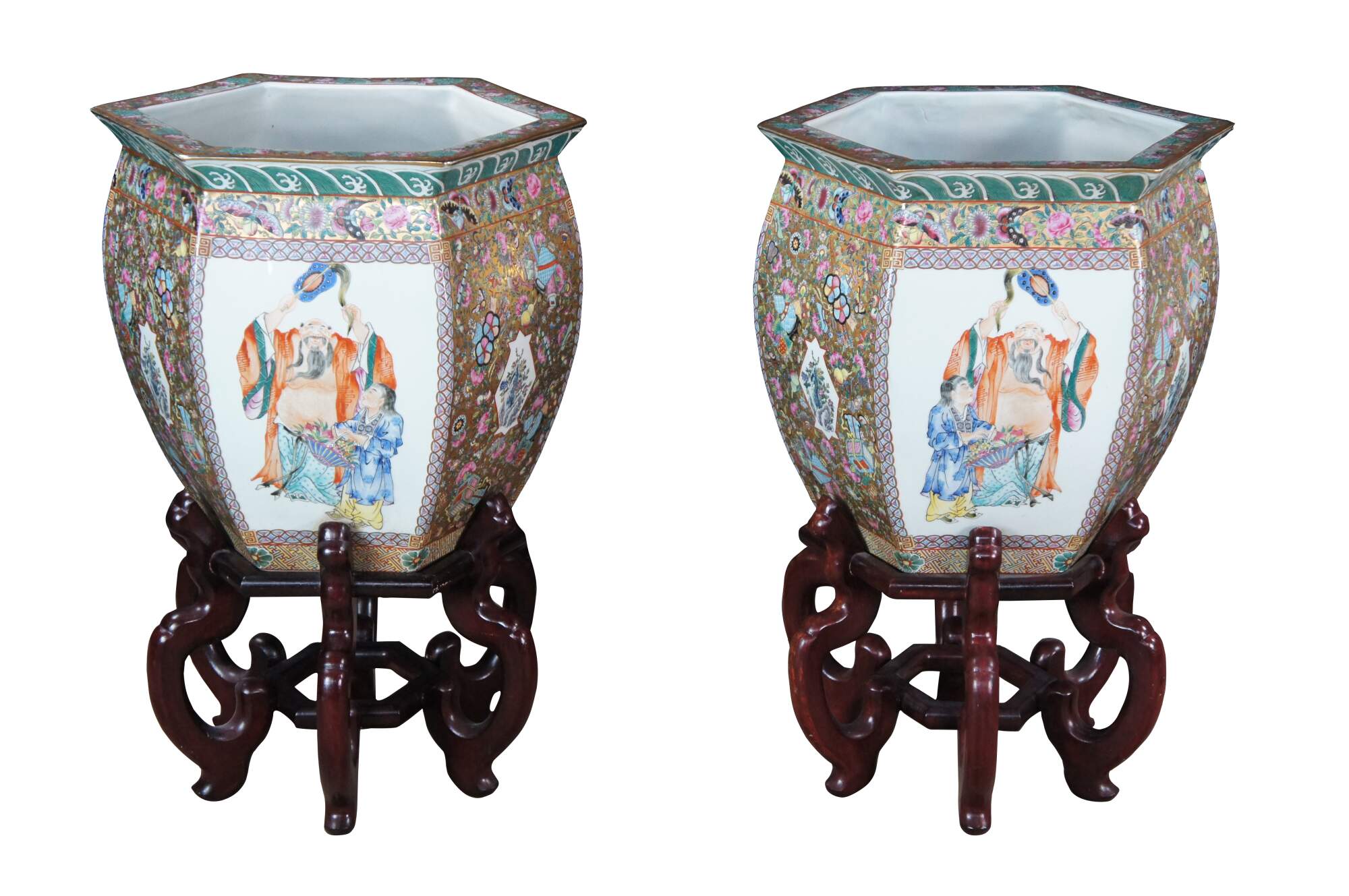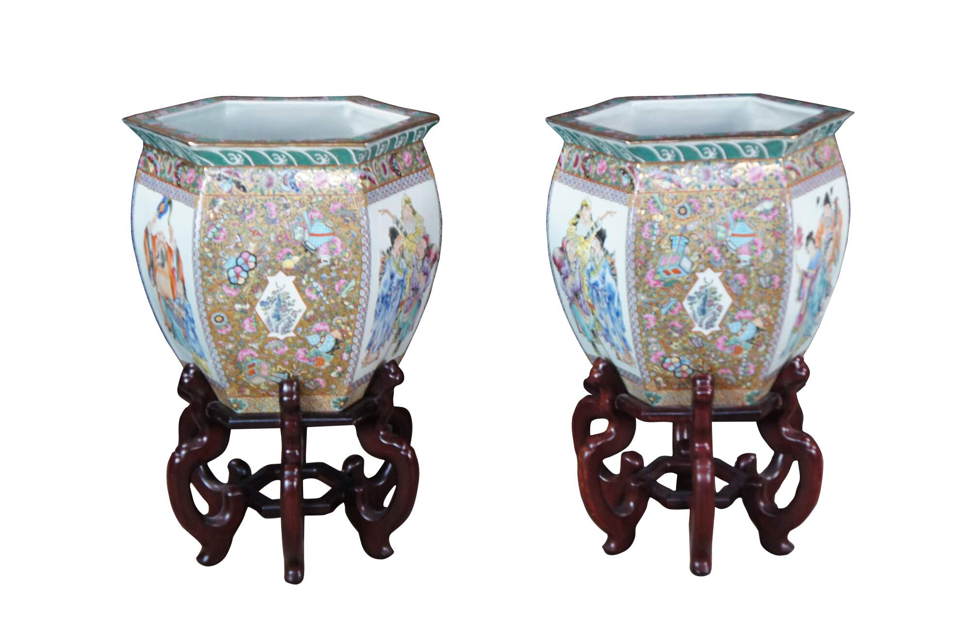 An equisite pair of 20th century Chinese Famille Rose Planters, Jardinieries or Cache Pots. Feature ornately decorated heaxagonal polychrome porcelain form with koi fish painted along the inside. The exterior has a beautiful alternating pattern of oriental figures set between a flowing pattern of insects, chrysanthemums, foliate and decorative wares over gold. A true pair with mirrored scenes. One shows two musicians with a geisha or dancer holding a lotus flower. Another shows three wise men or elders and the last shows a large man with child holding a basket of flowers. The lip of each vase has a vibrant green repeating wavecrest pattern along the outside and the tops have a colorful scene of birds, foliate and lotus flowers. The vase rest on wooden scrolled stands and are stamped along the base. A chrarming addition and statement in any space!