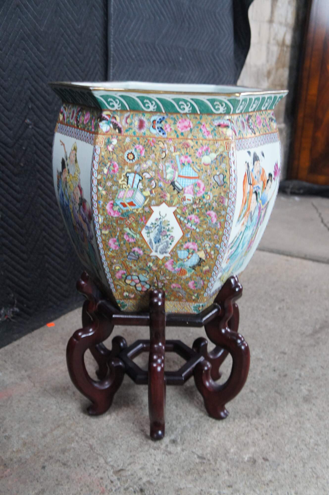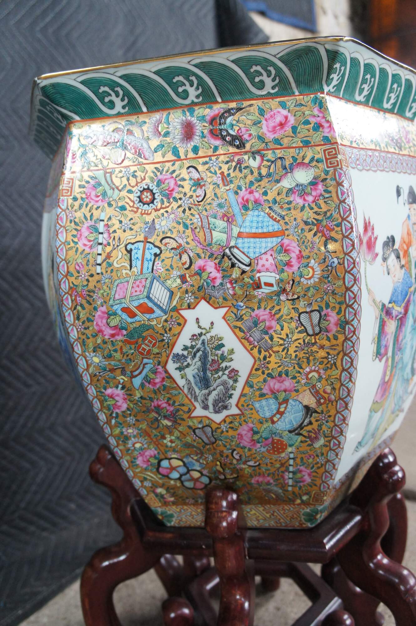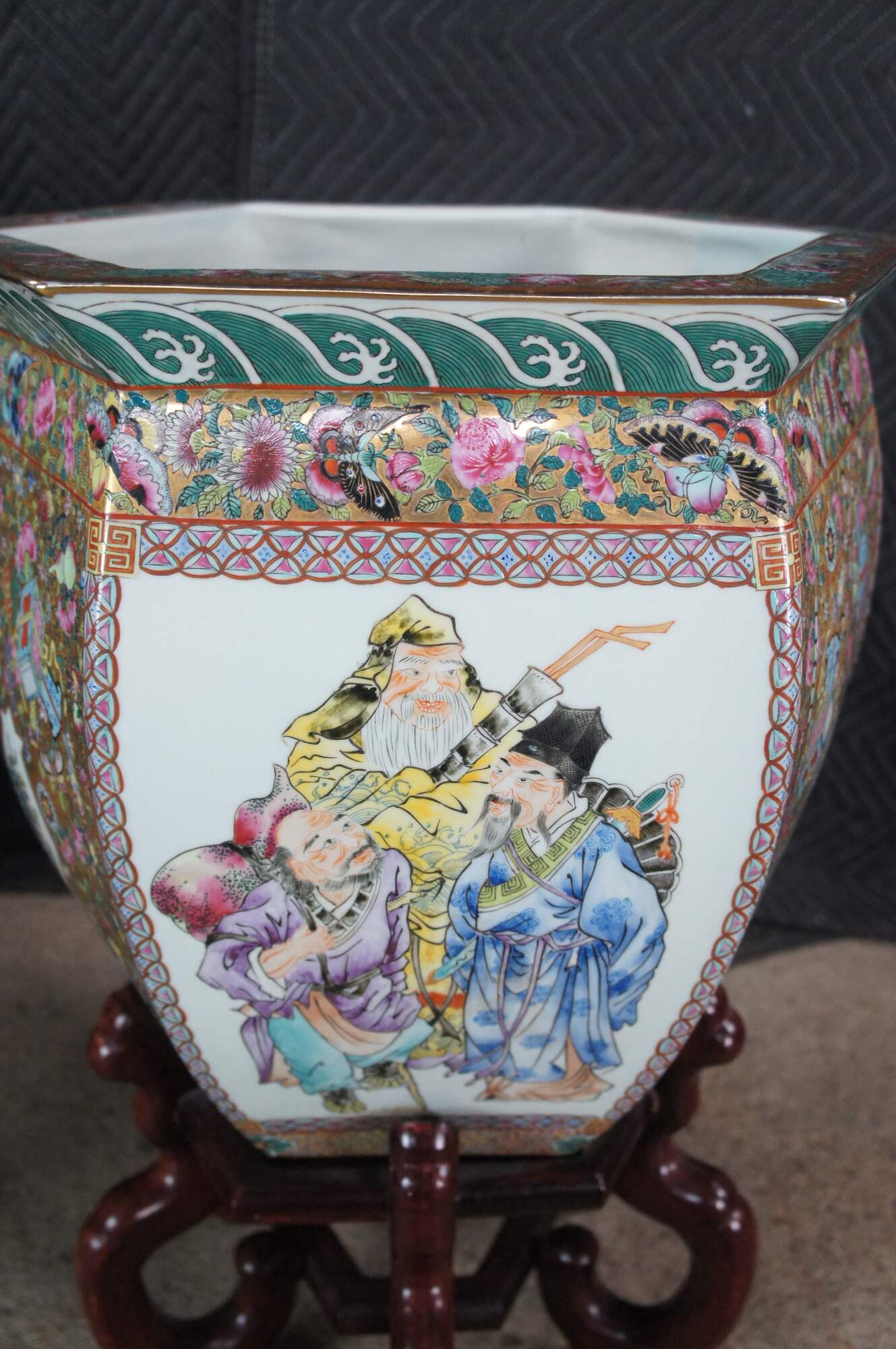 An equisite pair of 20th century Chinese Famille Rose Planters, Jardinieries or Cache Pots. Feature ornately decorated heaxagonal polychrome porcelain form with koi fish painted along the inside. The exterior has a beautiful alternating pattern of oriental figures set between a flowing pattern of insects, chrysanthemums, foliate and decorative wares over gold. A true pair with mirrored scenes. One shows two musicians with a geisha or dancer holding a lotus flower. Another shows three wise men or elders and the last shows a large man with child holding a basket of flowers. The lip of each vase has a vibrant green repeating wavecrest pattern along the outside and the tops have a colorful scene of birds, foliate and lotus flowers. The vase rest on wooden scrolled stands and are stamped along the base. A chrarming addition and statement in any space!