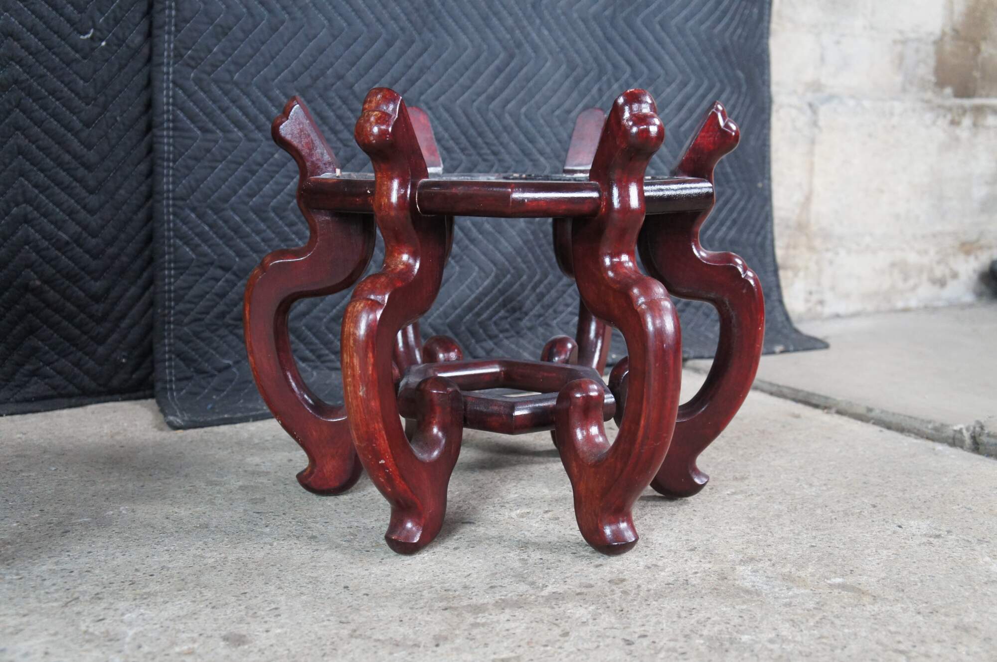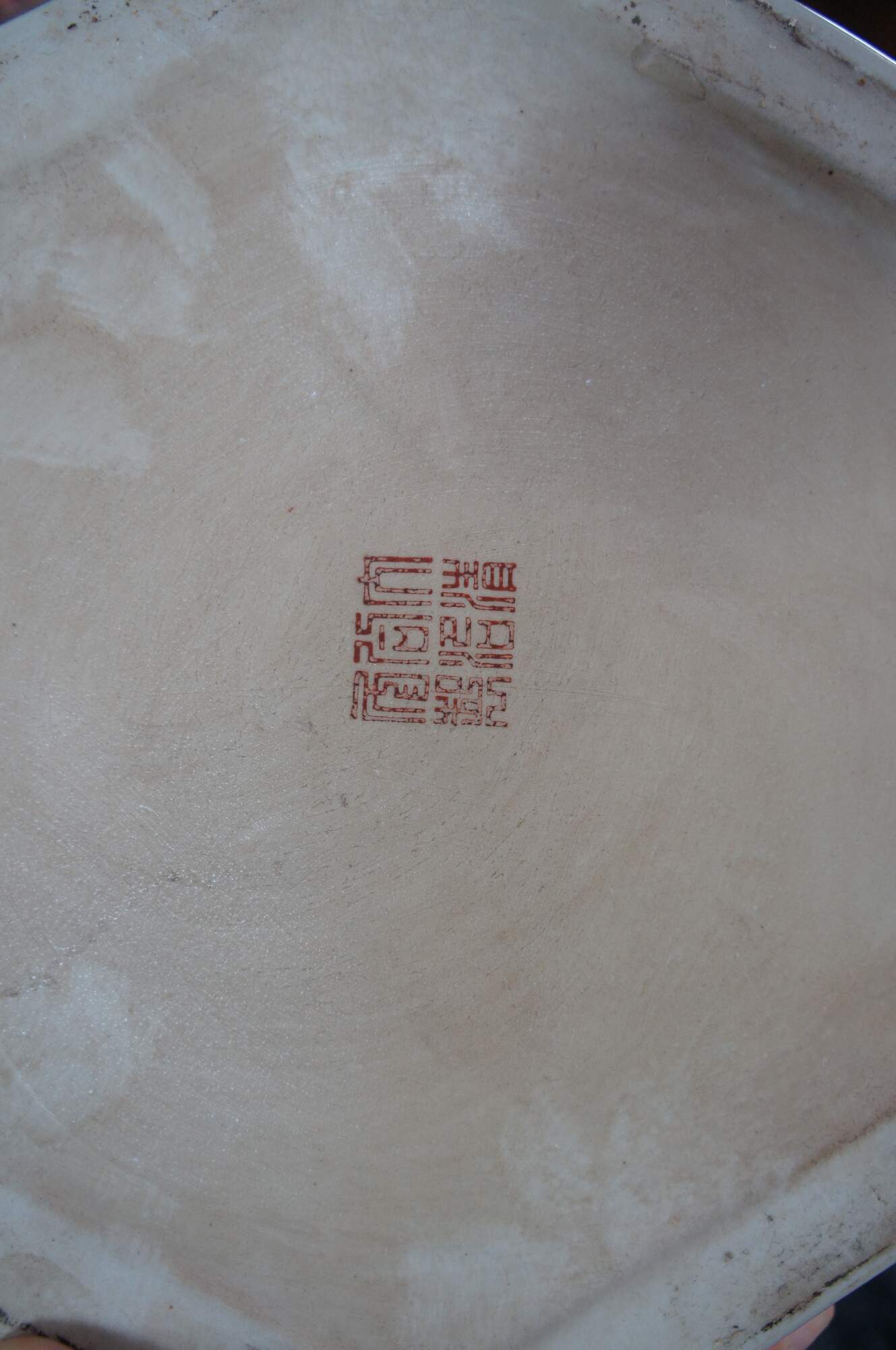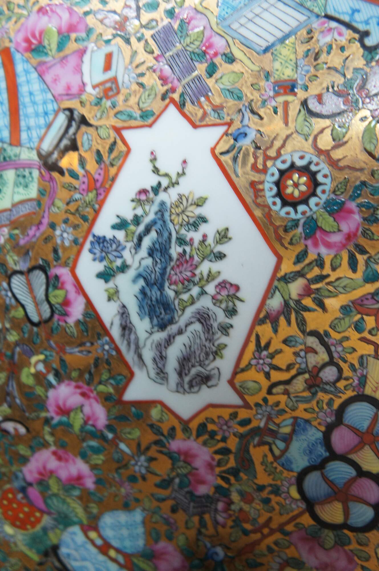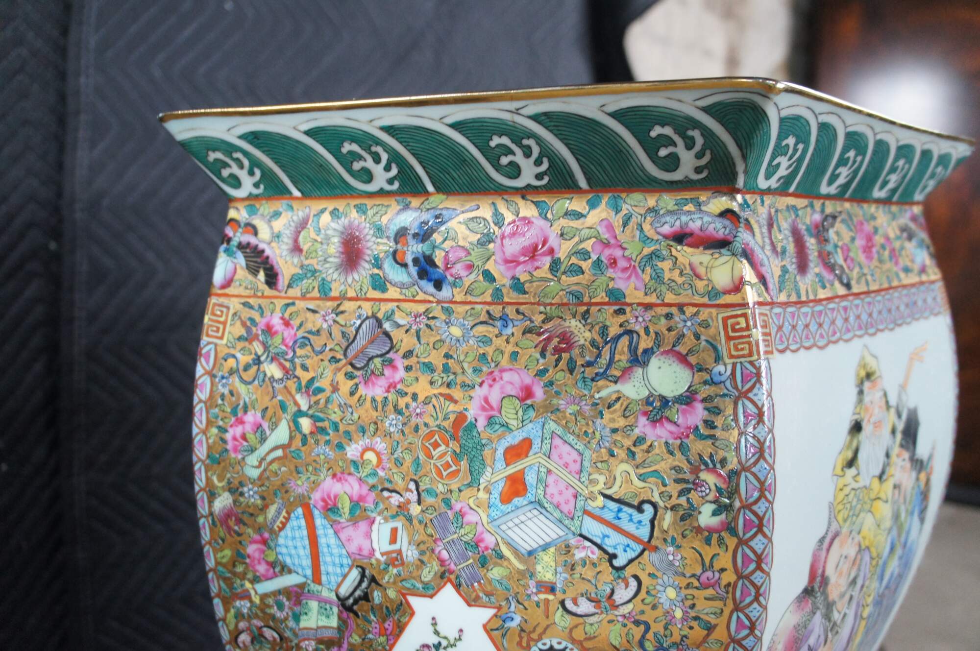An equisite pair of 20th century Chinese Famille Rose Planters, Jardinieries or Cache Pots. Feature ornately decorated heaxagonal polychrome porcelain form with koi fish painted along the inside. The exterior has a beautiful alternating pattern of oriental figures set between a flowing pattern of insects, chrysanthemums, foliate and decorative wares over gold. A true pair with mirrored scenes. One shows two musicians with a geisha or dancer holding a lotus flower. Another shows three wise men or elders and the last shows a large man with child holding a basket of flowers. The lip of each vase has a vibrant green repeating wavecrest pattern along the outside and the tops have a colorful scene of birds, foliate and lotus flowers. The vase rest on wooden scrolled stands and are stamped along the base. A chrarming addition and statement in any space!