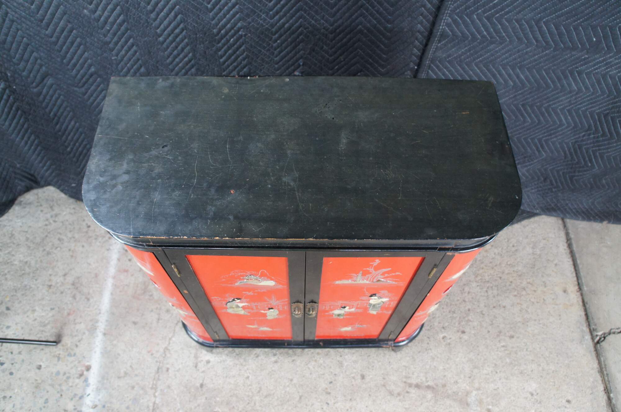 Mid-20th Century Chinese Red and Black Lacquer Soapstone Inlaid Dry Bar, circa 1960s. Features a demilune form with a flip-top opening to a mirrored area for glassware and bottles as well as hanging glasses. The lower section has a pullout with space for 8 additional bottles. Each front corner opens with hanging space for 3 additional goblets or cordials. Along the back side, there are two additional hidden doors that open to 3 shelves for more glassware. The cabinet is decorated in a traditional oriental motif with painted pagoda and geisha scenes featuring raised soapstone elements and figures. A fun addition to any space.
