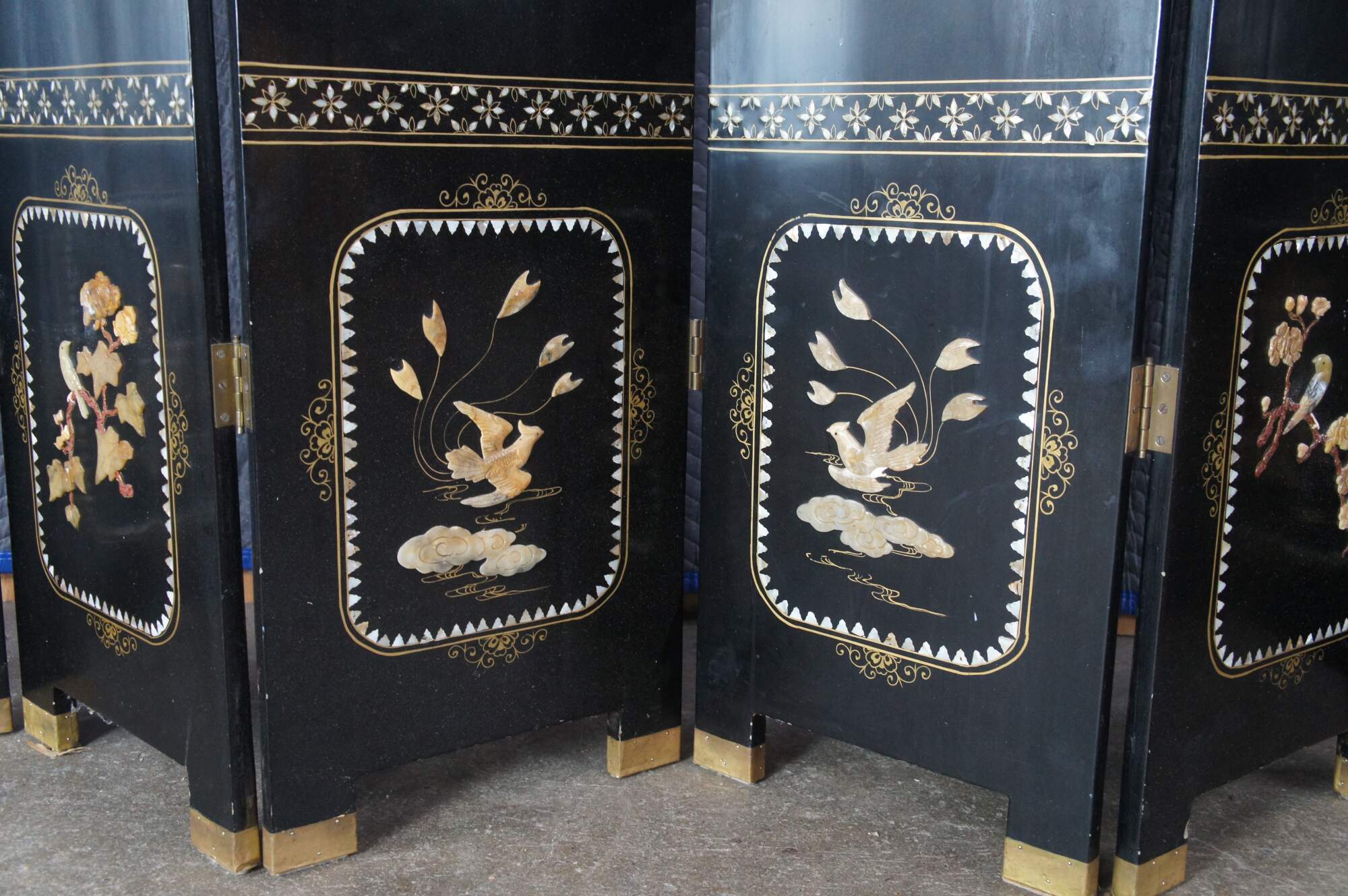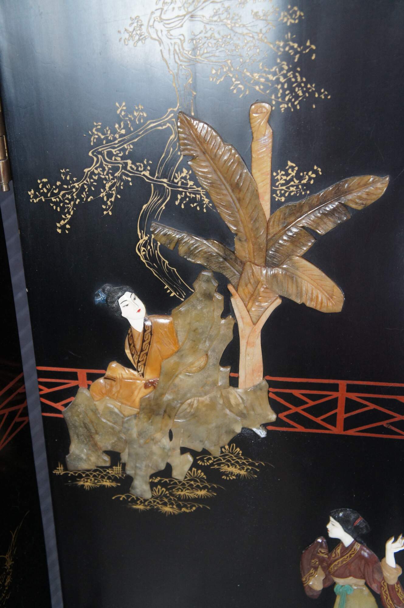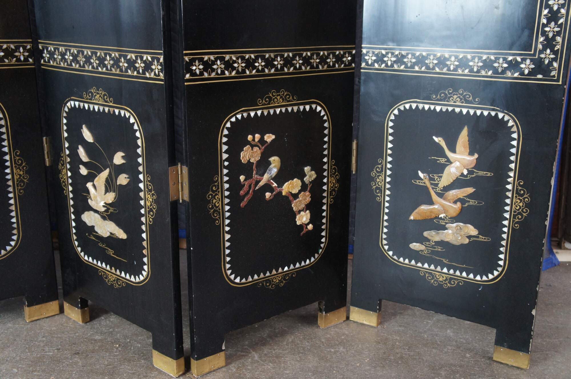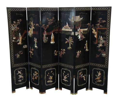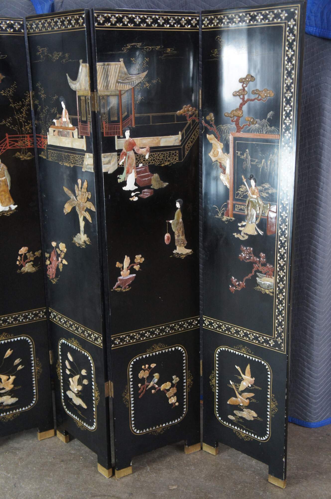 An Equisite Mid 20th Century Chinoiserie Six Panel Folding Screen. Features a black lacquer frame decorated with a traditional oriental garden scene with raised soapstone figures and mother of pearl inlay. Features a garden landscapewith Geisha figures amongst cherry blossome trees and pagodas. The bottom portion of screen features cranes, birds and ducks framed in mother of pearl inlay. Verso of screen is decorated in black and gold with birds a brached detail. Feet are brass capped