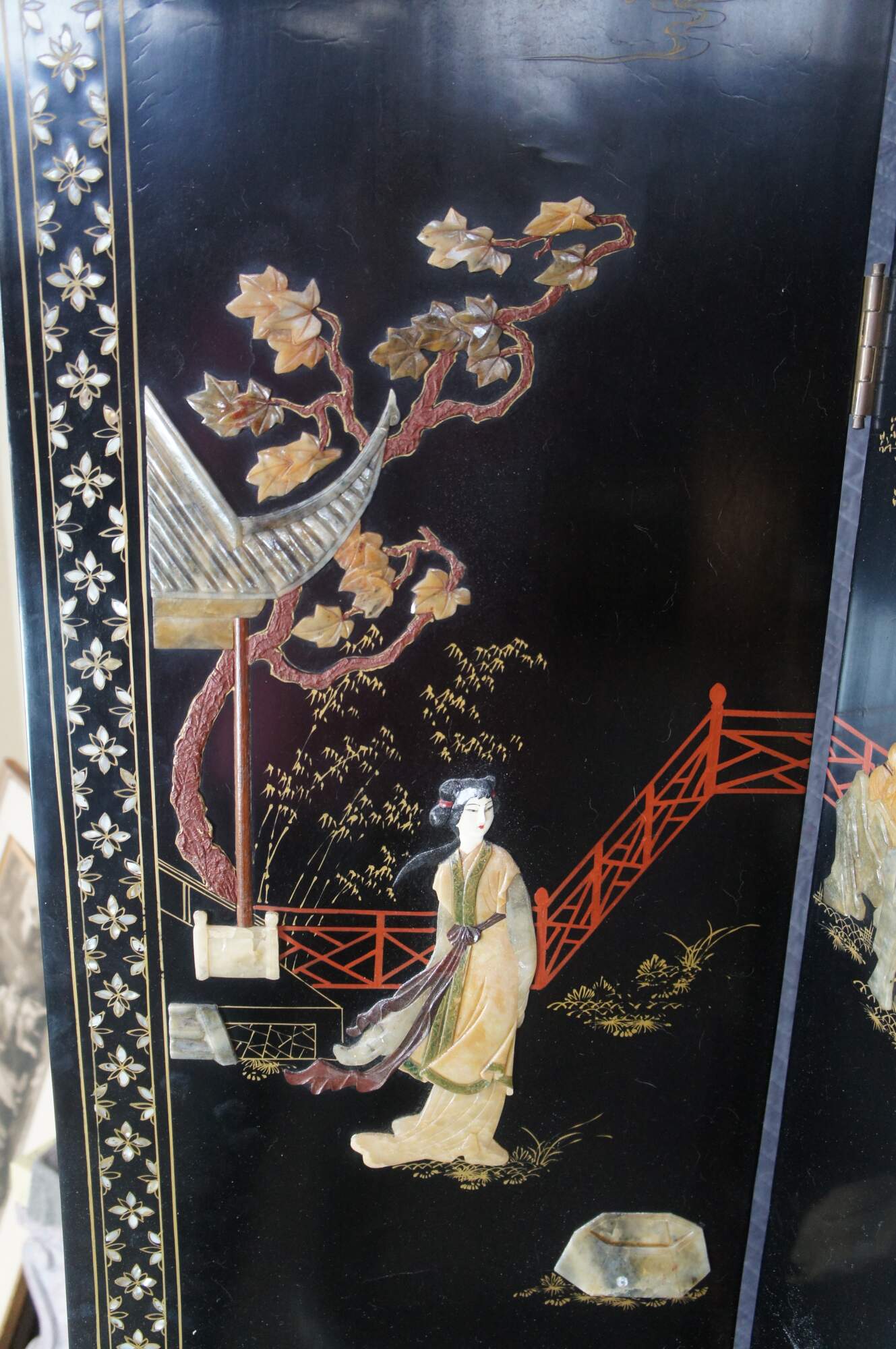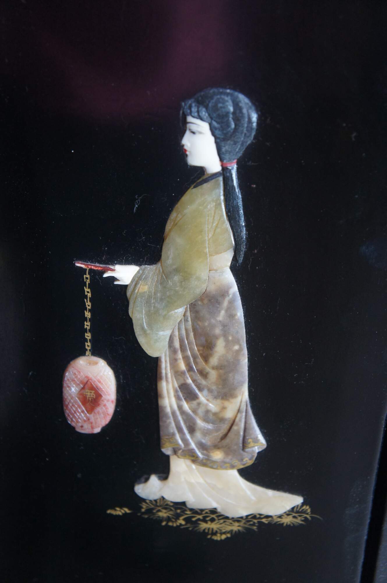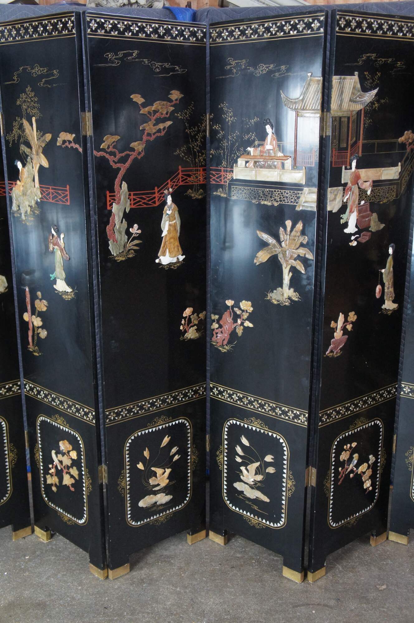 An Equisite Mid 20th Century Chinoiserie Six Panel Folding Screen. Features a black lacquer frame decorated with a traditional oriental garden scene with raised soapstone figures and mother of pearl inlay. Features a garden landscapewith Geisha figures amongst cherry blossome trees and pagodas. The bottom portion of screen features cranes, birds and ducks framed in mother of pearl inlay. Verso of screen is decorated in black and gold with birds a brached detail. Feet are brass capped