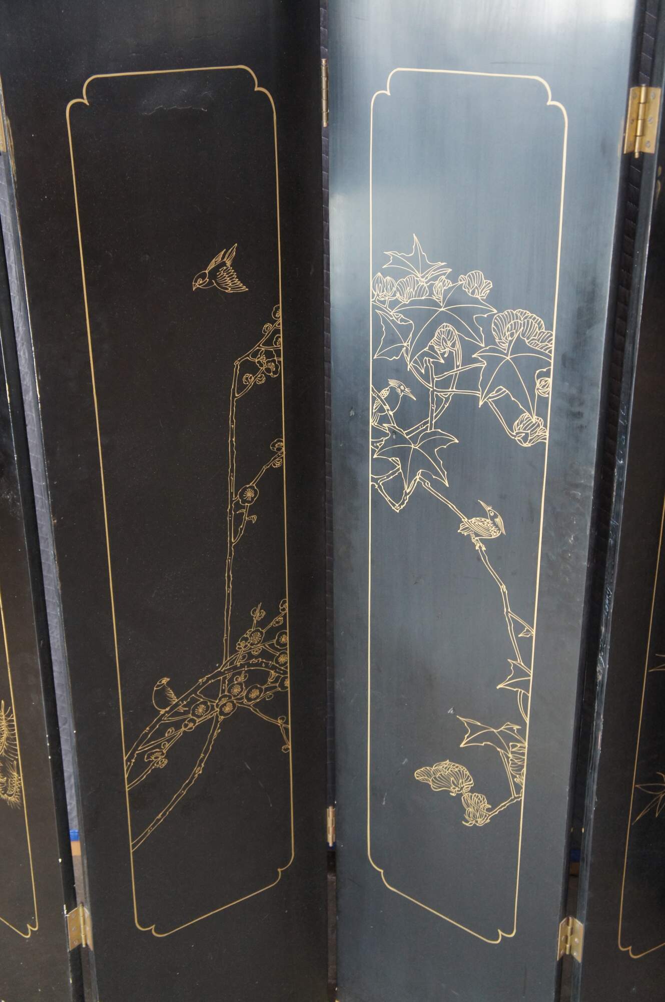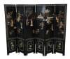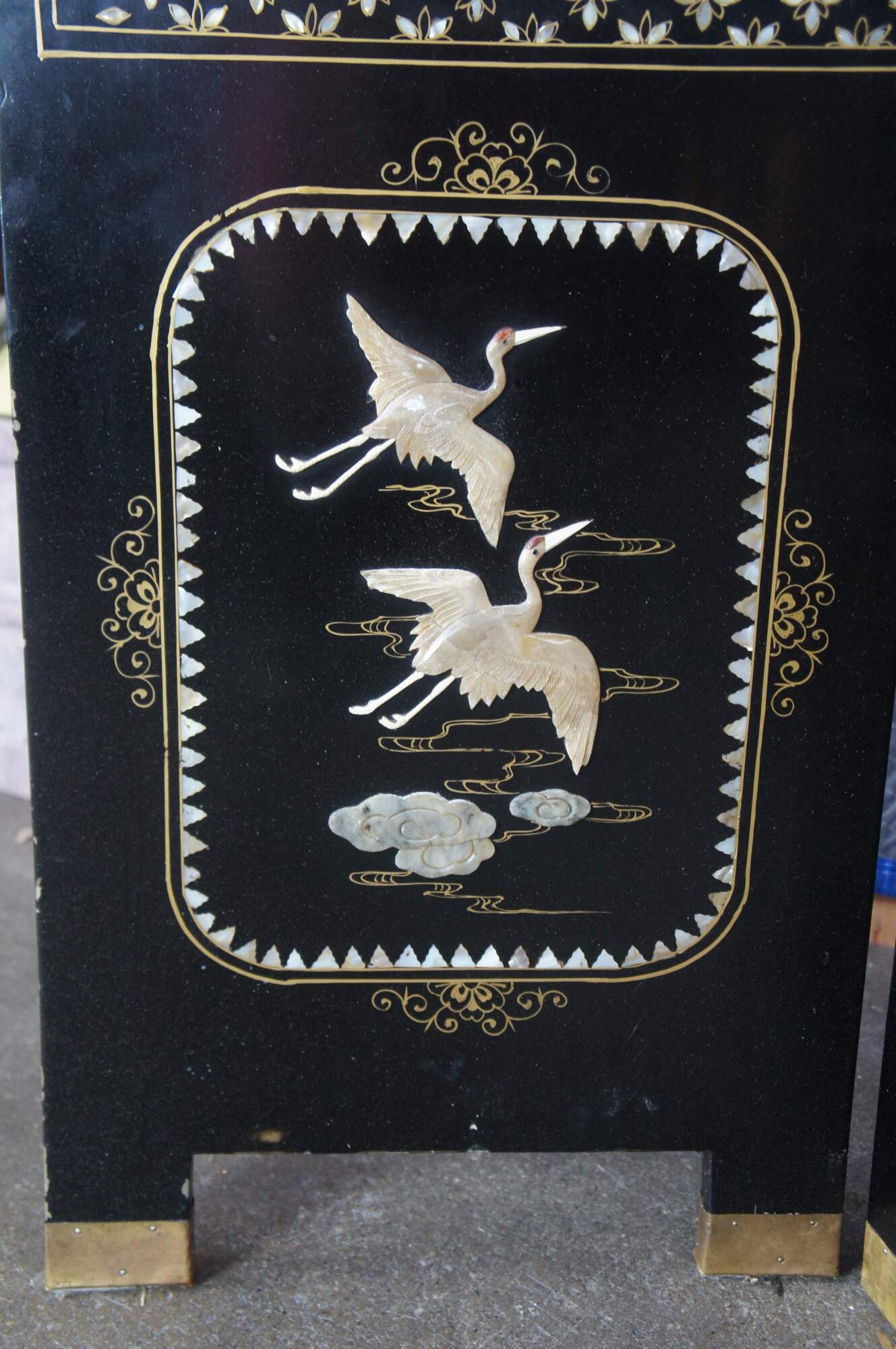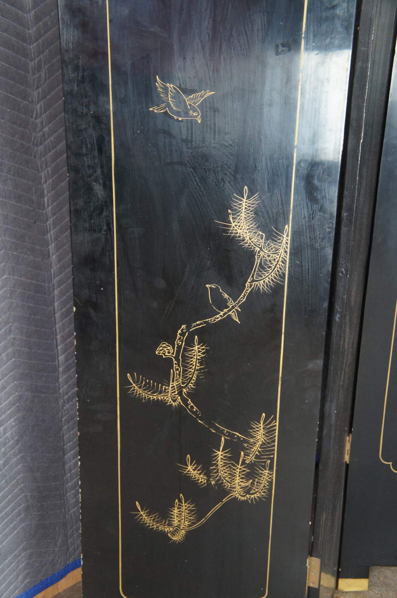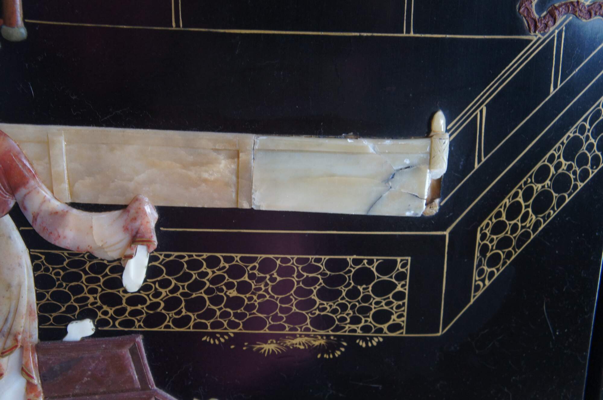 An Equisite Mid 20th Century Chinoiserie Six Panel Folding Screen. Features a black lacquer frame decorated with a traditional oriental garden scene with raised soapstone figures and mother of pearl inlay. Features a garden landscapewith Geisha figures amongst cherry blossome trees and pagodas. The bottom portion of screen features cranes, birds and ducks framed in mother of pearl inlay. Verso of screen is decorated in black and gold with birds a brached detail. Feet are brass capped
