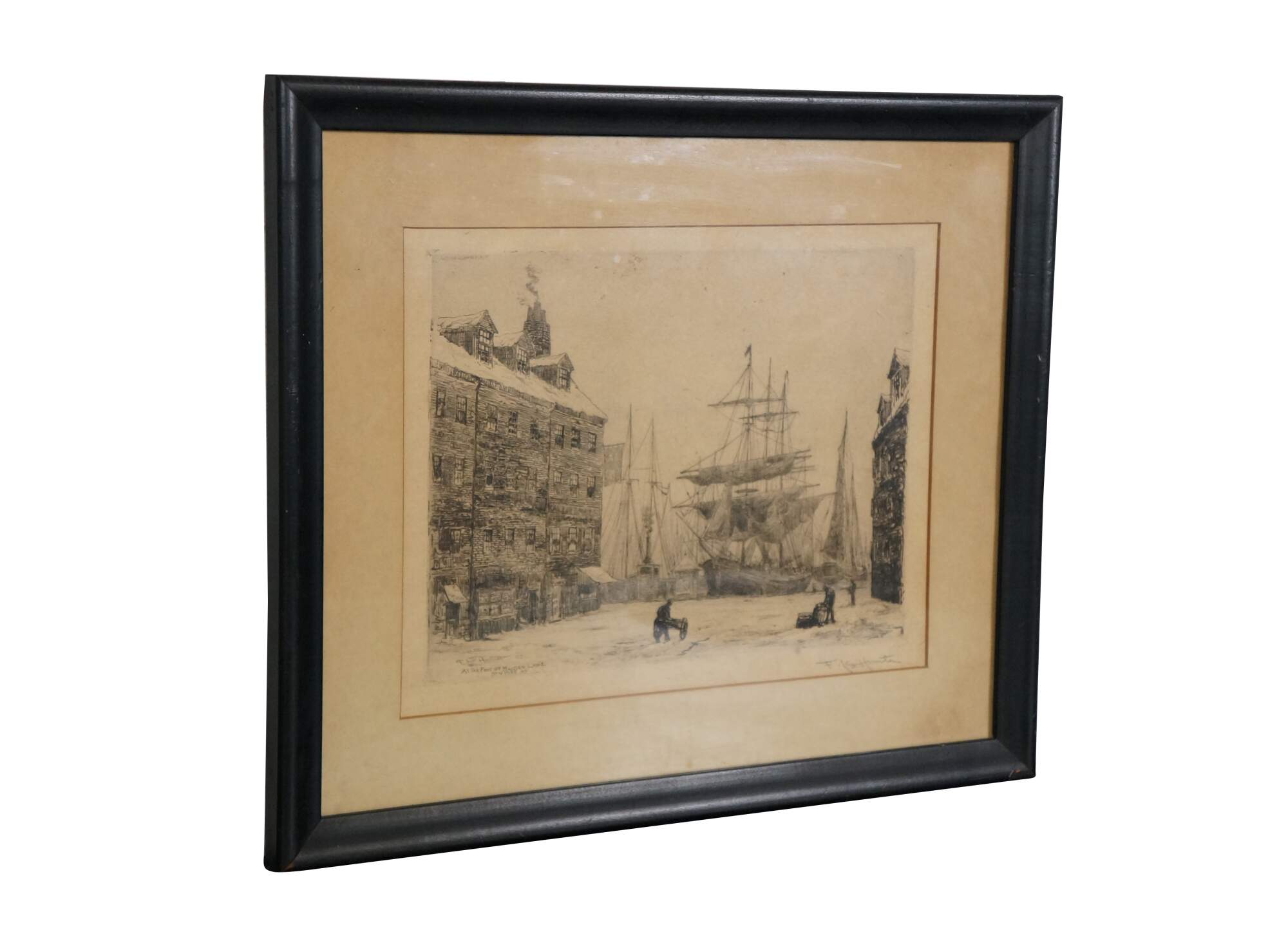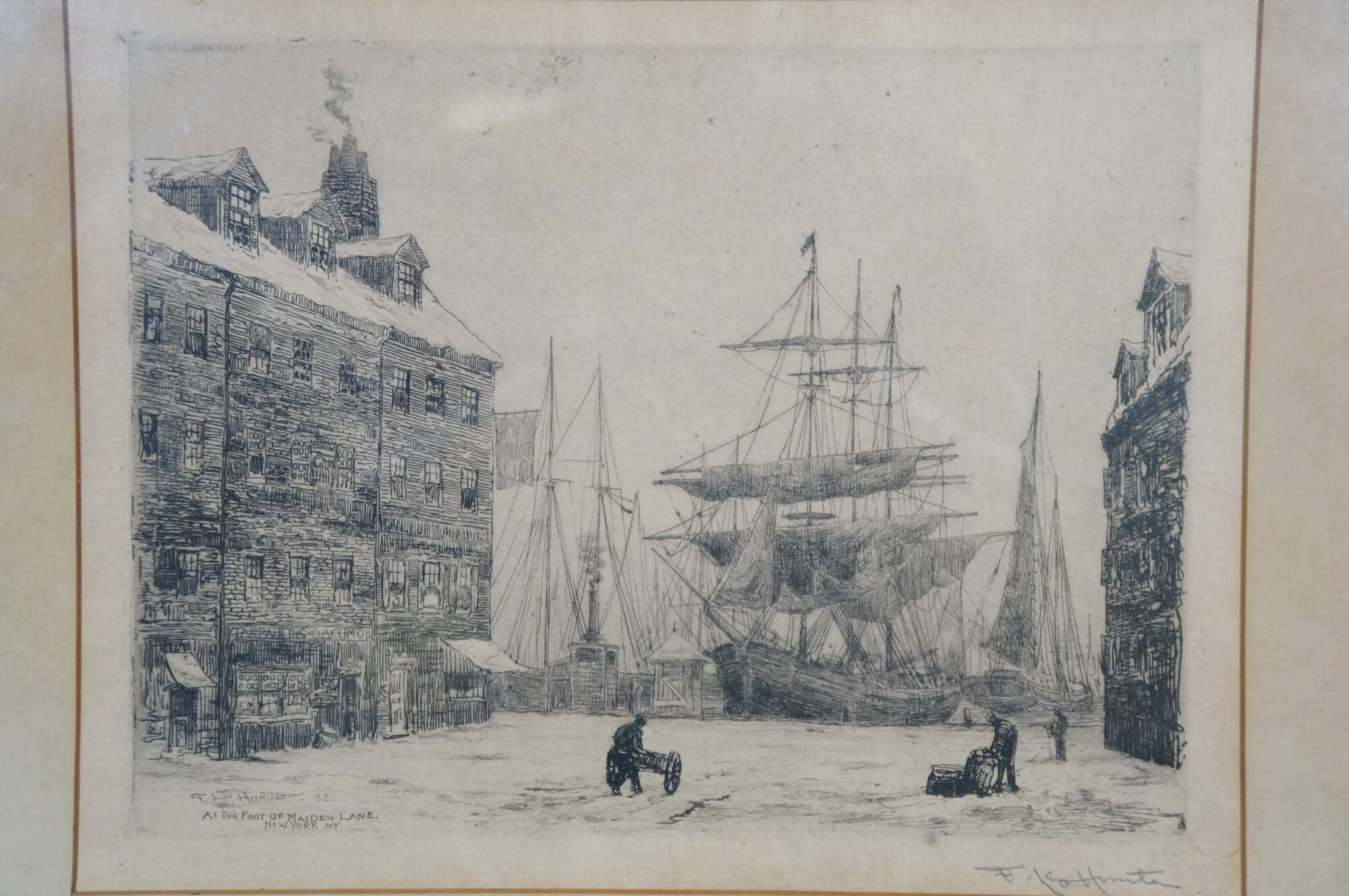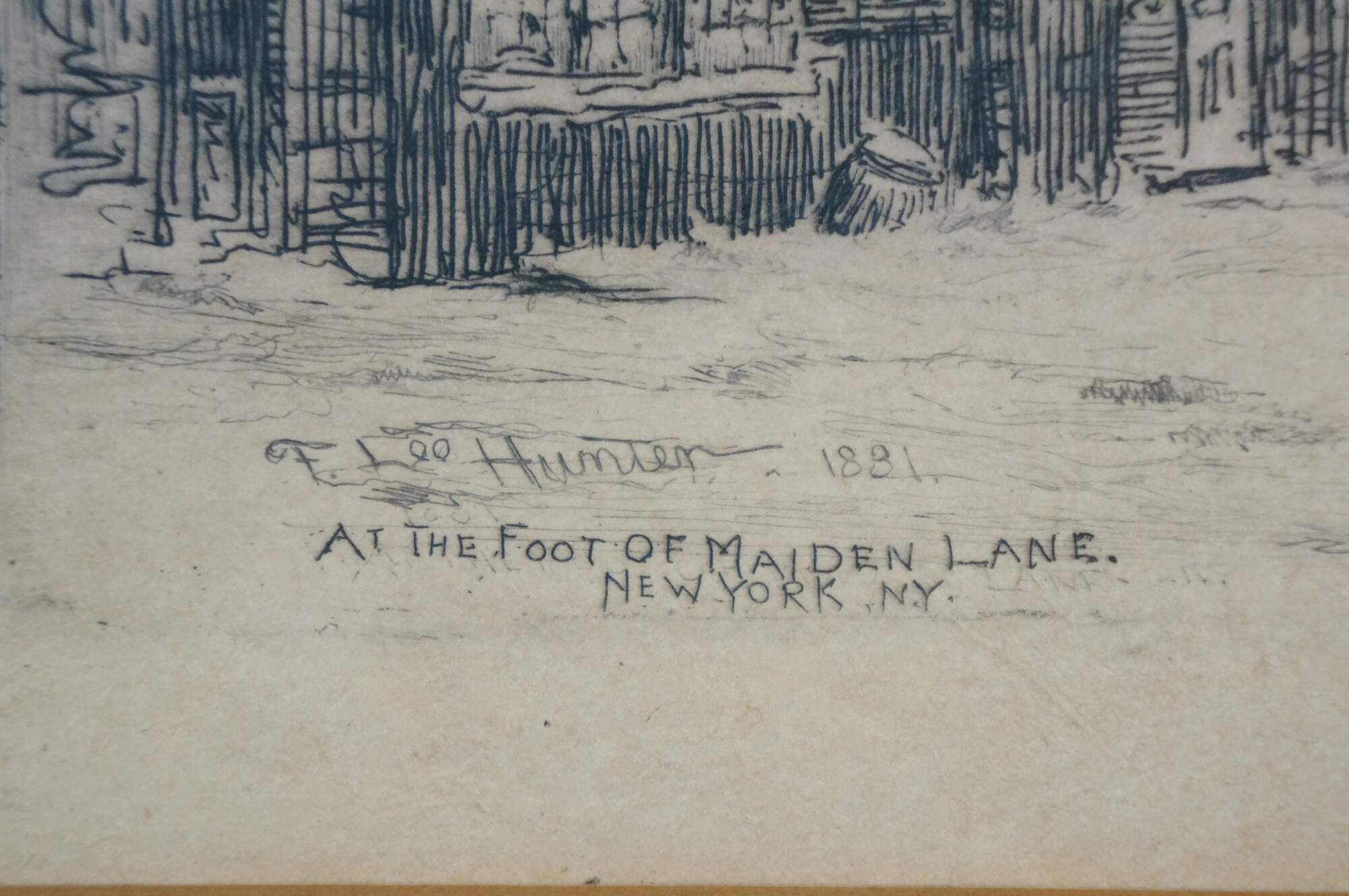 Early 20th century black and white etching titled "At the Foot of Maiden Lane, New York, NY" by Frederick Leo Hunter. Cityscape view of dock buildings by large sailing ships / boats. Signed in plate and dated 1881. Pencil signed, lower right. Copyright, N.Y. 1921. Black beveled wood frame; off-white mat.