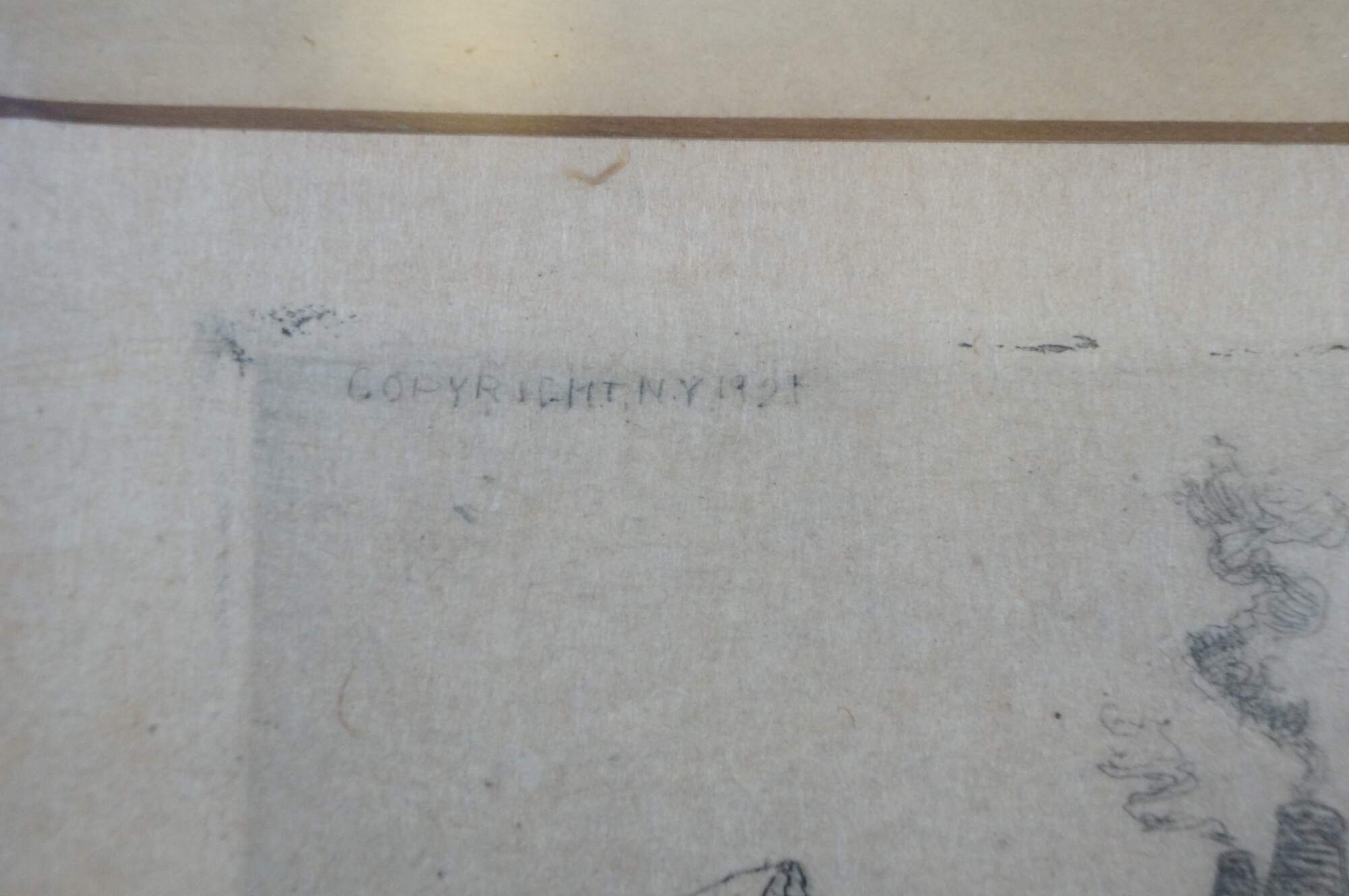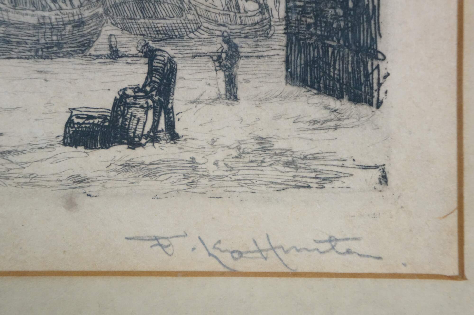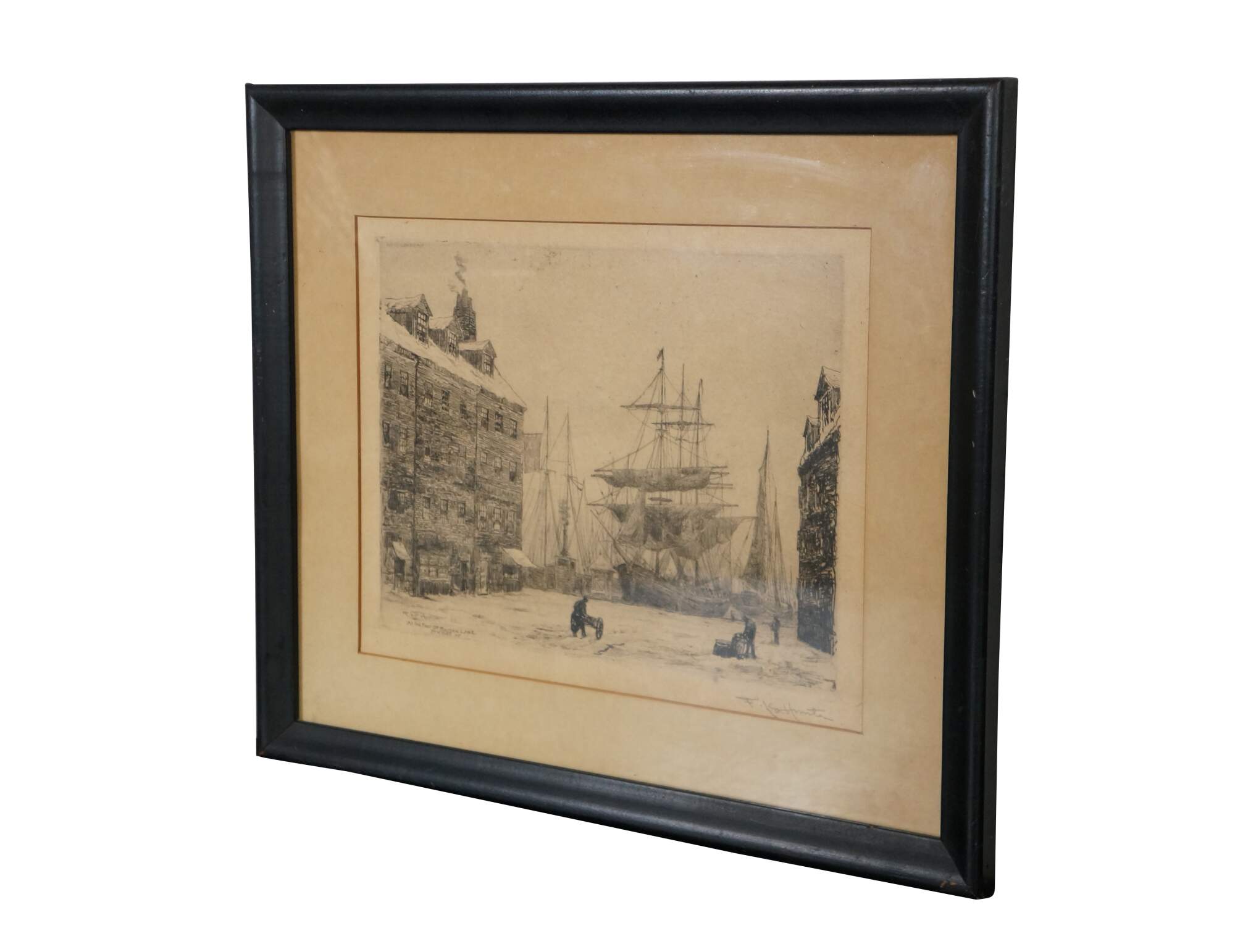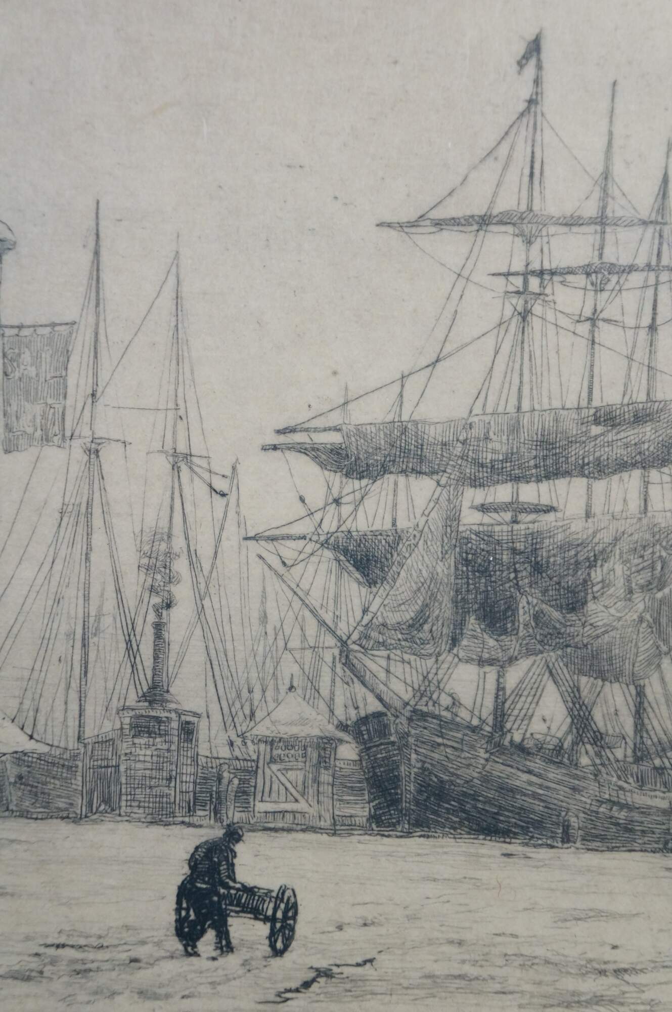 Early 20th century black and white etching titled "At the Foot of Maiden Lane, New York, NY" by Frederick Leo Hunter. Cityscape view of dock buildings by large sailing ships / boats. Signed in plate and dated 1881. Pencil signed, lower right. Copyright, N.Y. 1921. Black beveled wood frame; off-white mat.