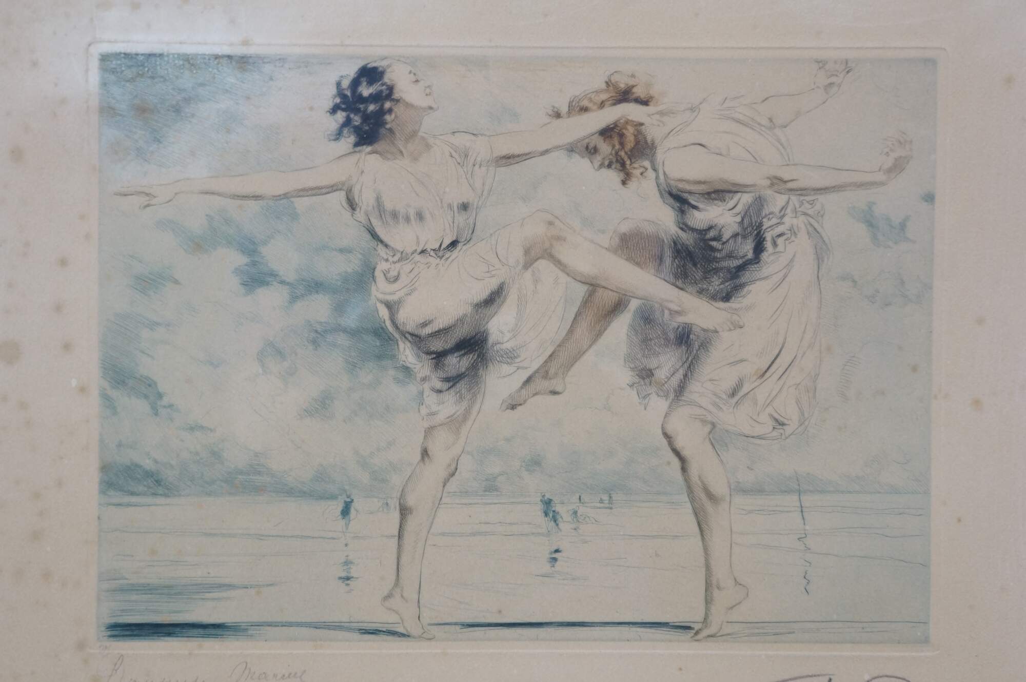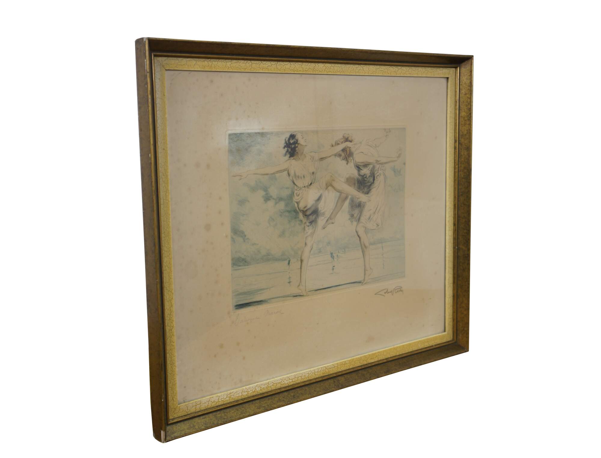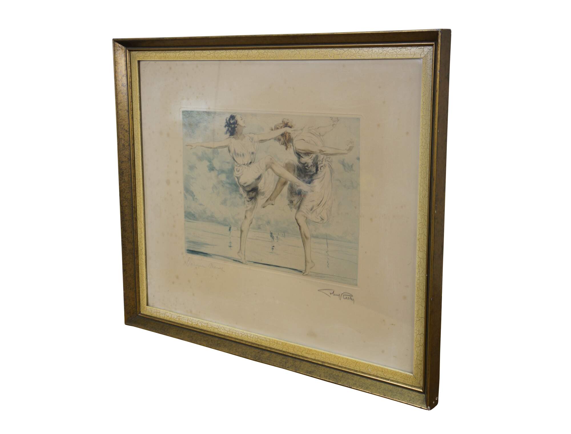 Vintage colored etching depicting a man and woman dressed in classical Grecian style clothing dancing gracefully on the beach with figures in the background. Pencil signed and titled, lower edge. Gilt painted and crackled beveled frame; no mat.