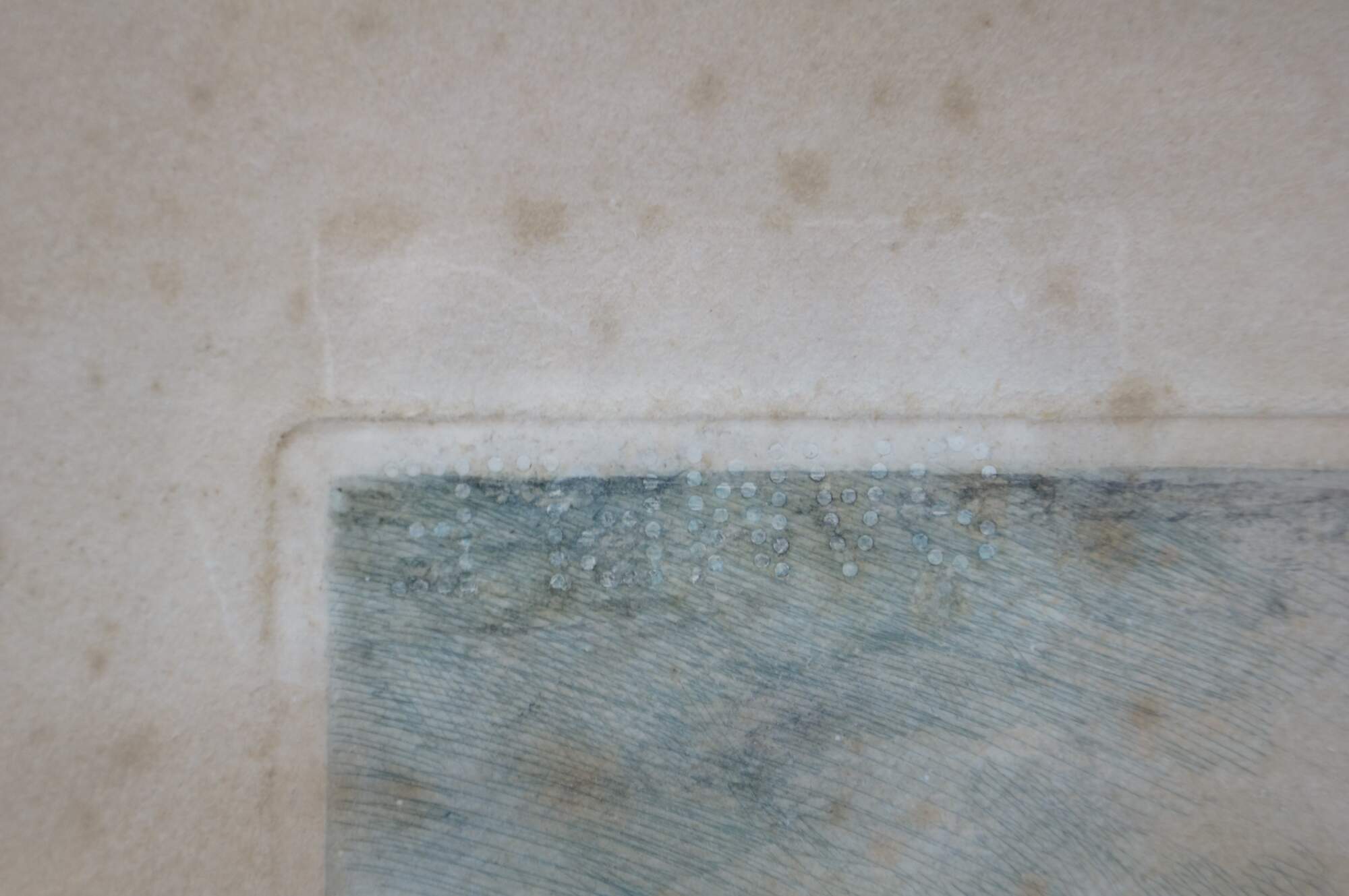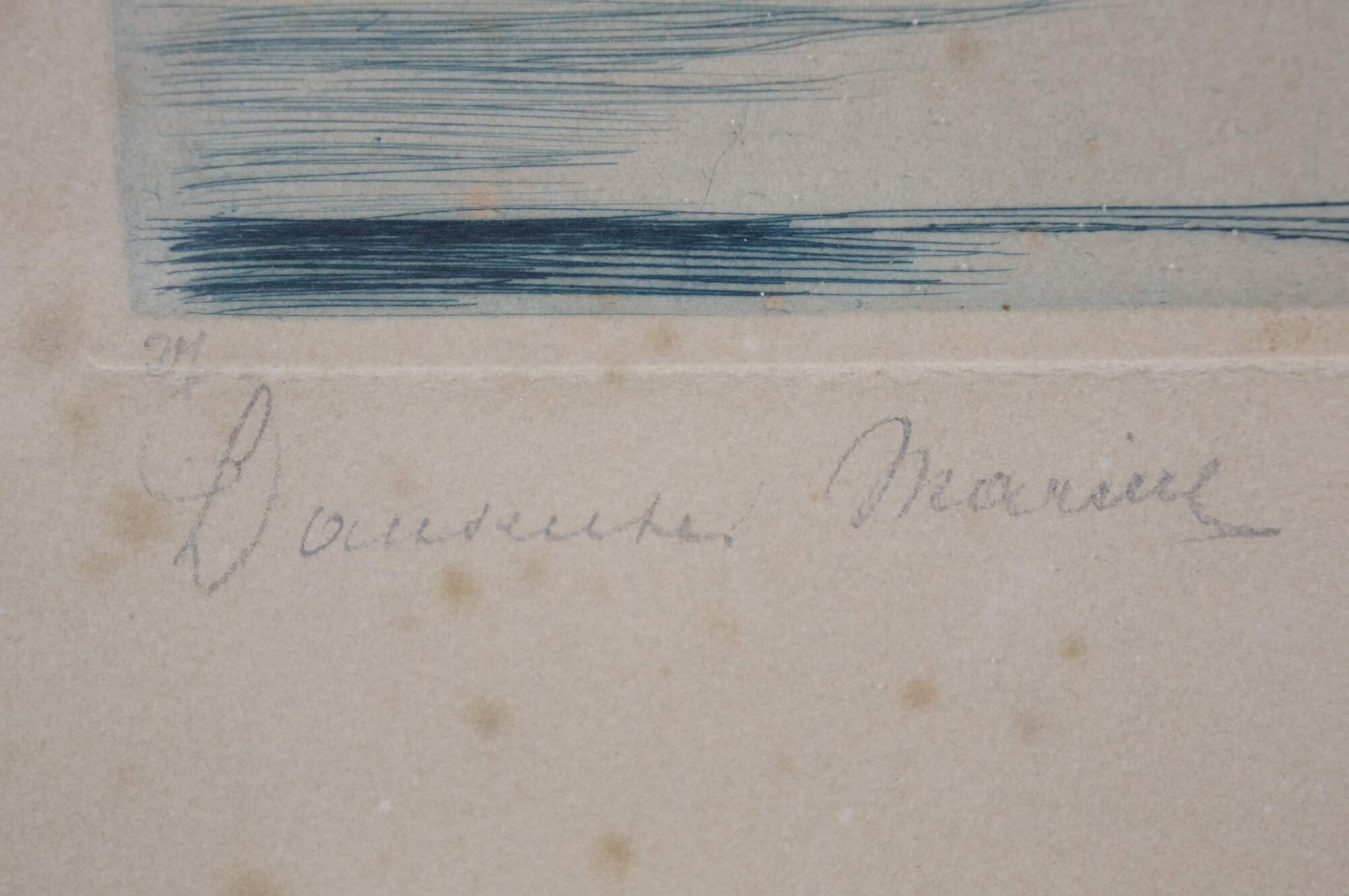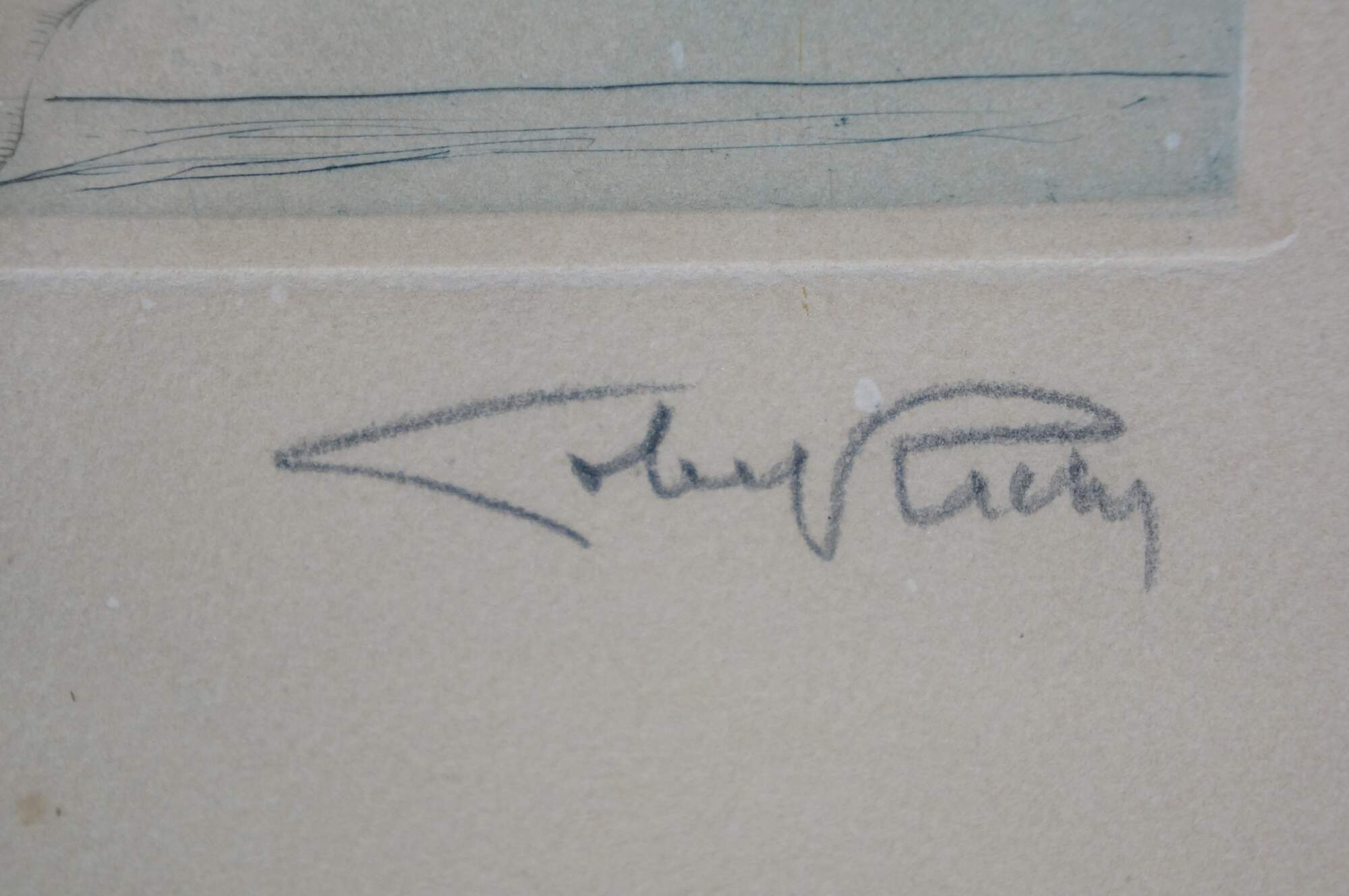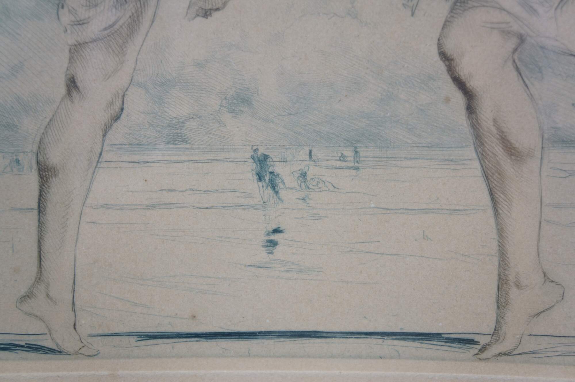 Vintage colored etching depicting a man and woman dressed in classical Grecian style clothing dancing gracefully on the beach with figures in the background. Pencil signed and titled, lower edge. Gilt painted and crackled beveled frame; no mat.