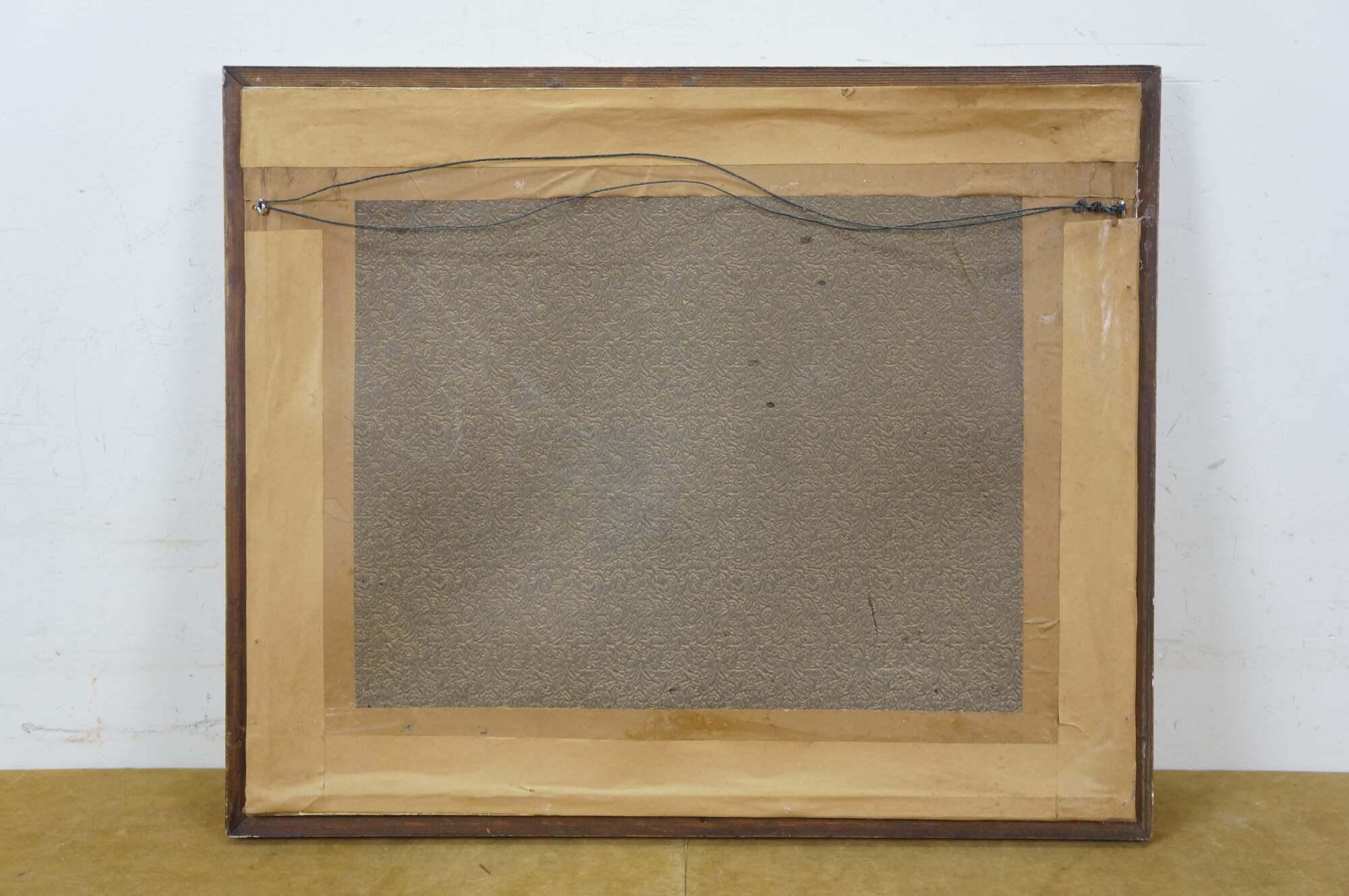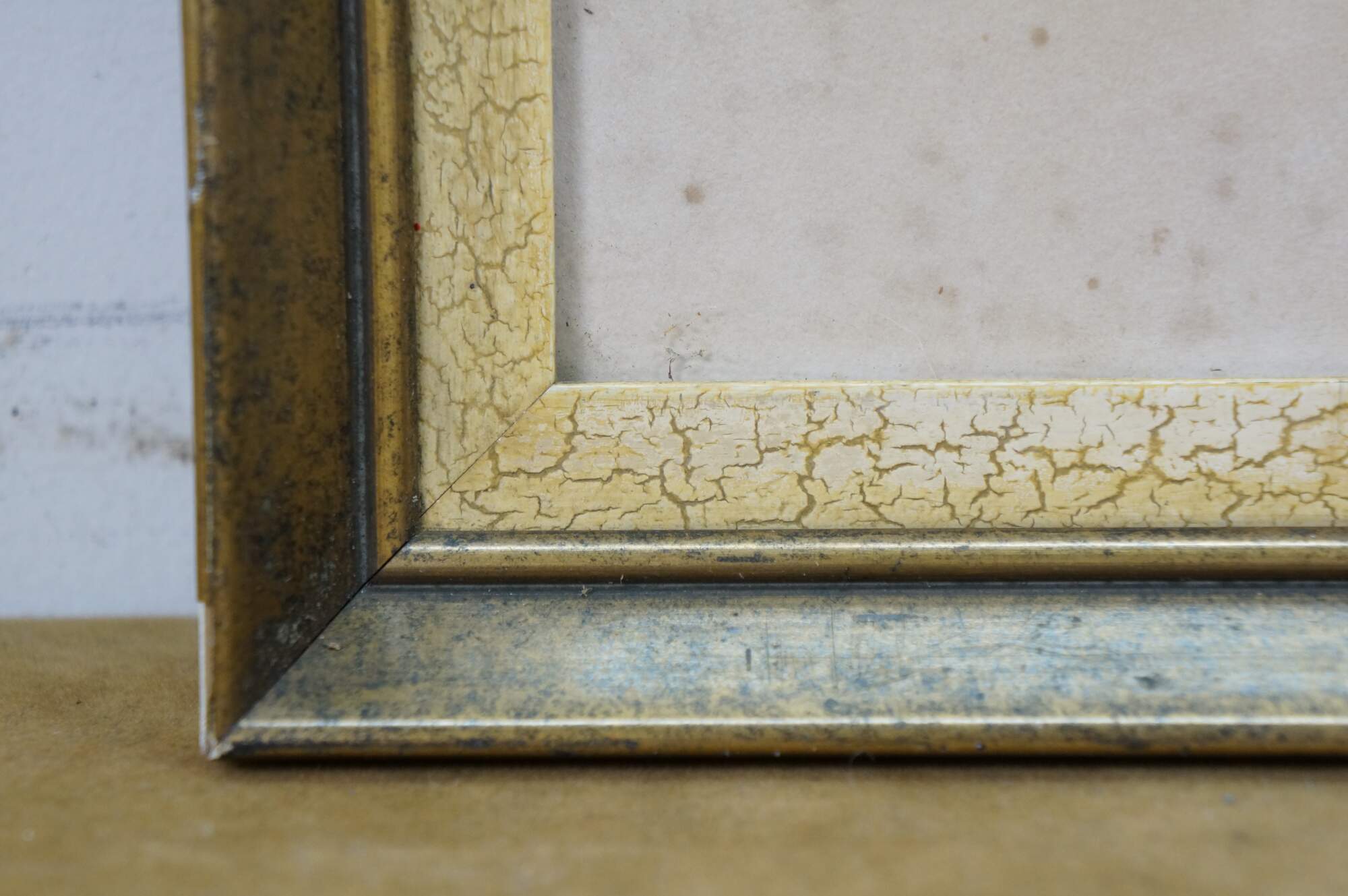 Wear and distressing from age, foxing/discoloration to print, crazing to frame, appears to be the word SAMPLE emblased upside down in the upper left of the print.
