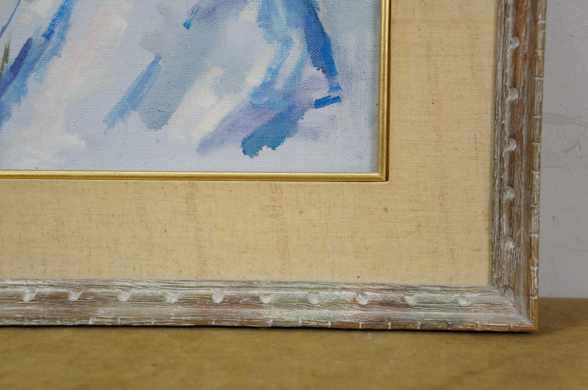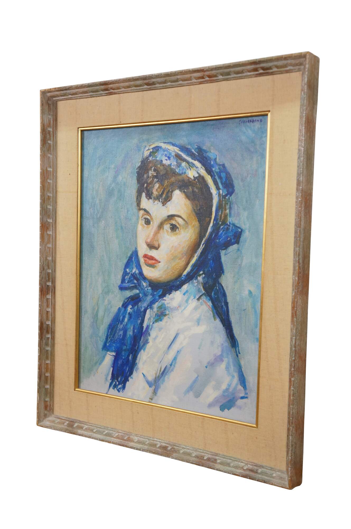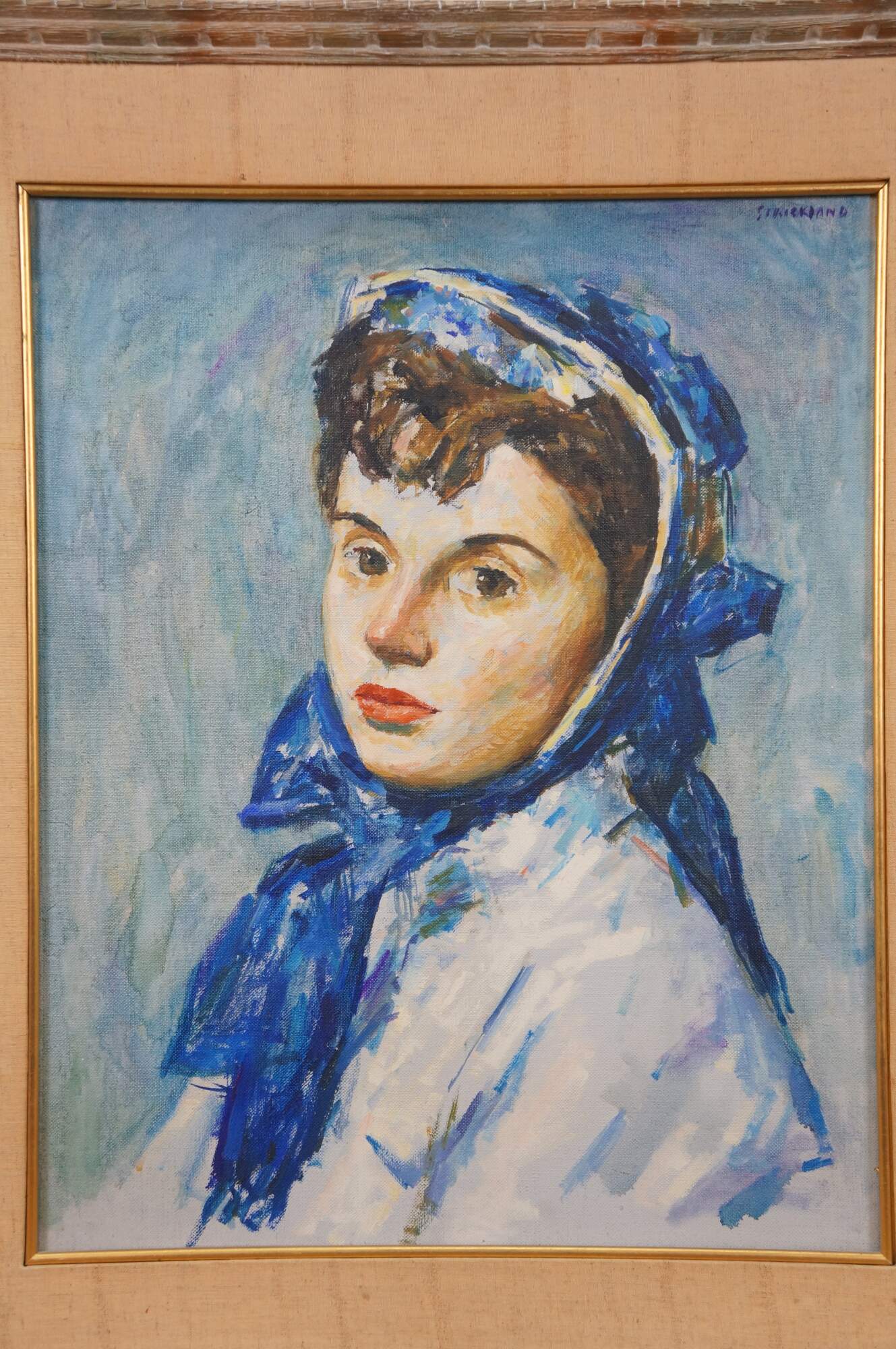 Vintage Thomas J Strickland oil painting on canvas showing a portrait of a young woman with brown hair, dressed in white and blue. Signed upper right. Distressed wood frame with off-white linen mat and gilt inner border.