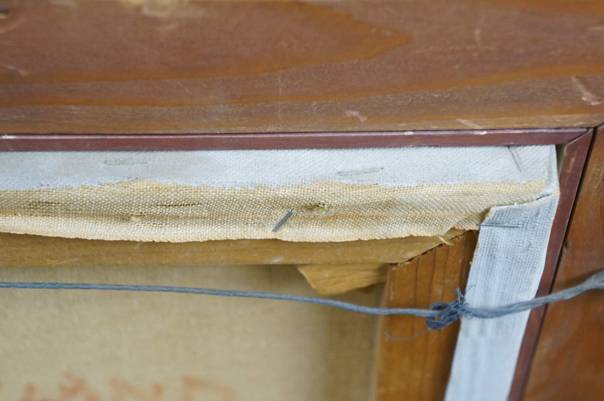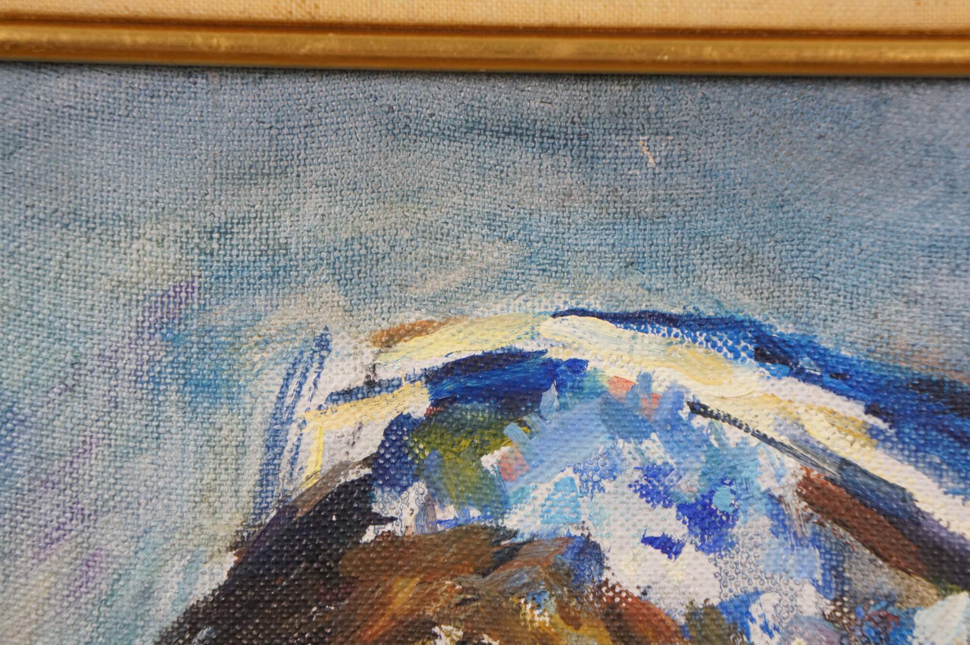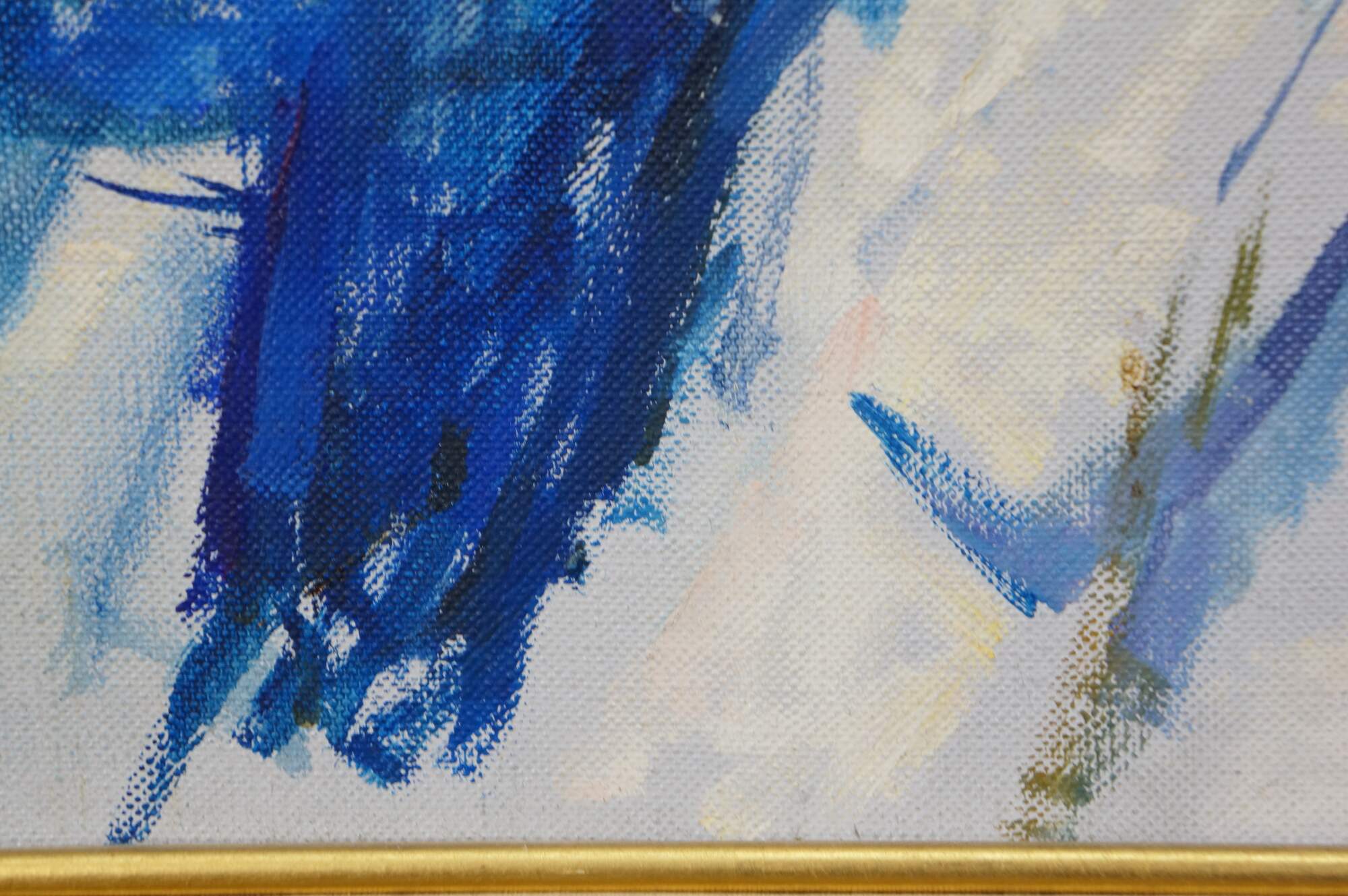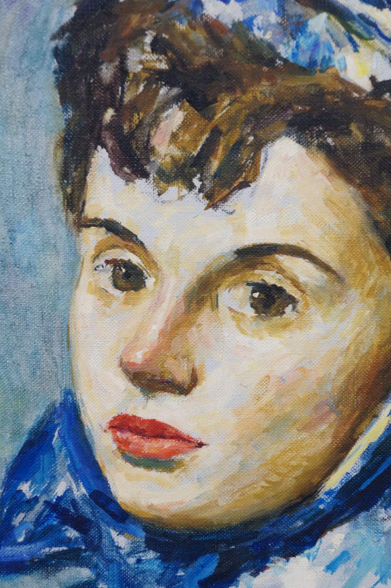Vintage Thomas J Strickland oil painting on canvas showing a portrait of a young woman with brown hair, dressed in white and blue. Signed upper right. Distressed wood frame with off-white linen mat and gilt inner border.