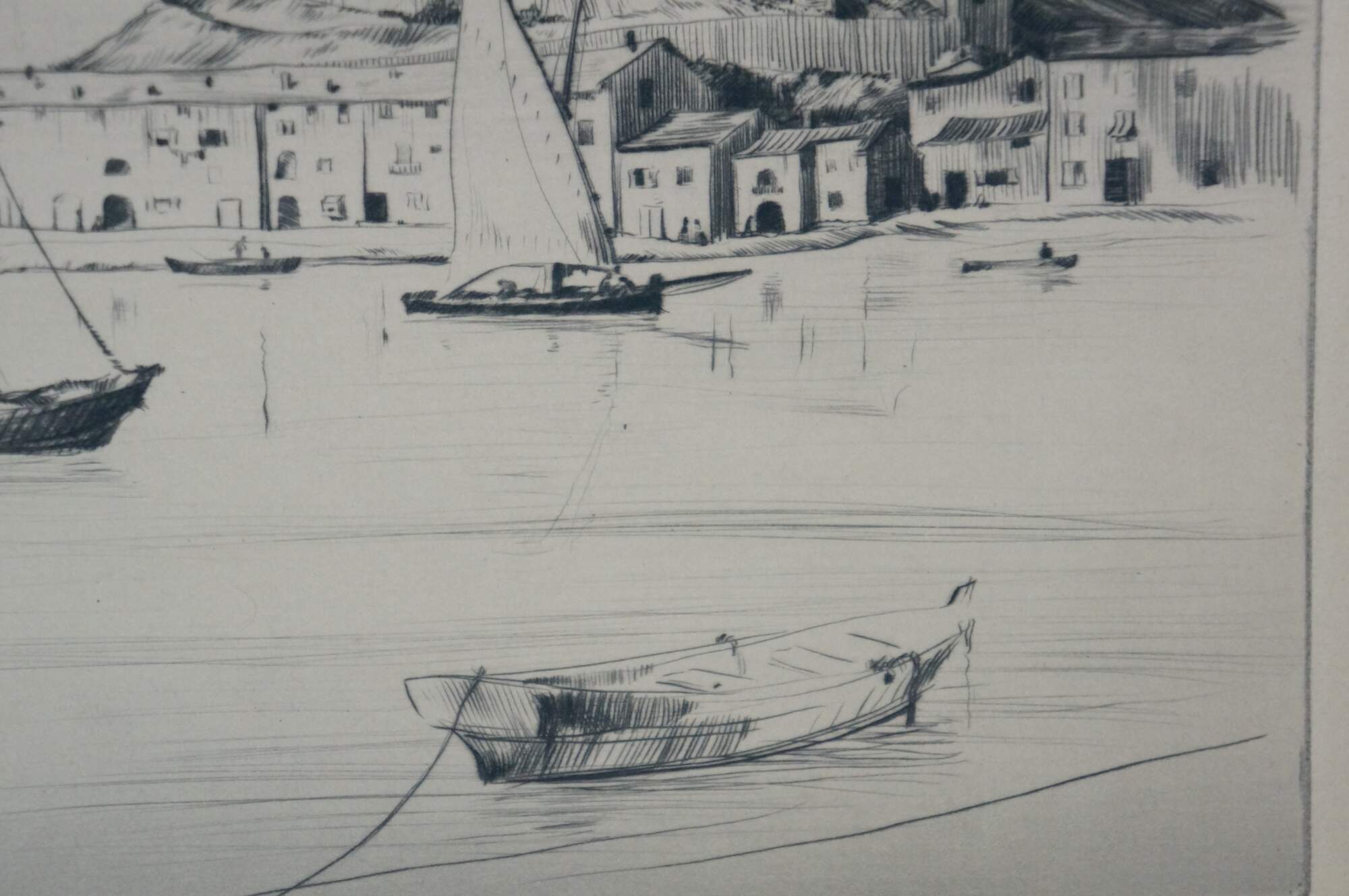 Early 20th century black and white etching titled "Ventimiglia" by Loren Roberta Barton. Coastal seascape of Ventimiglia Italy, with a large ship / sailboats in the foreground. Pencil signed, lower right. Paper in white cardstock mat; unframed.
