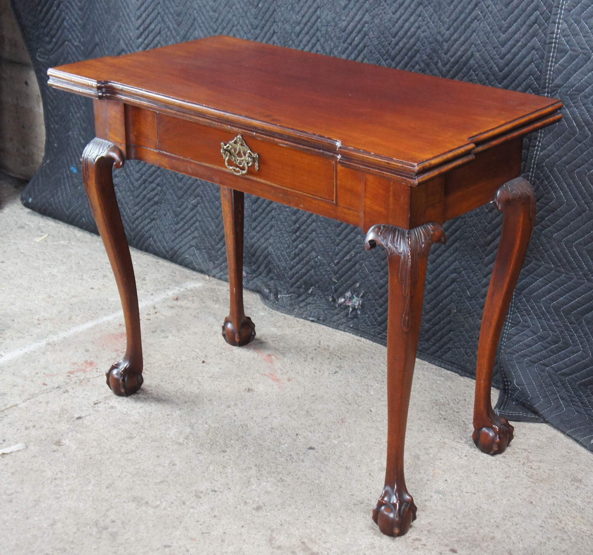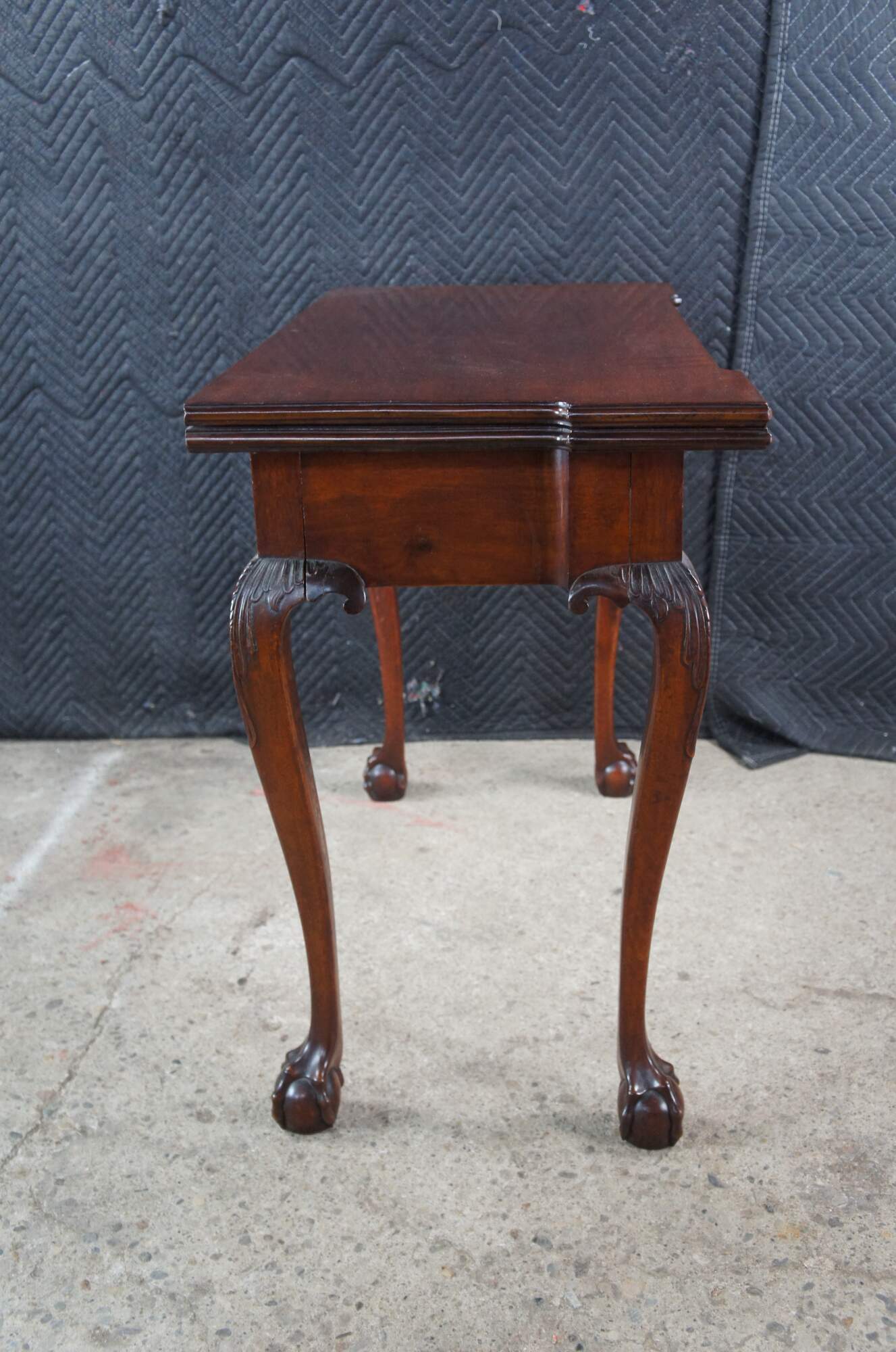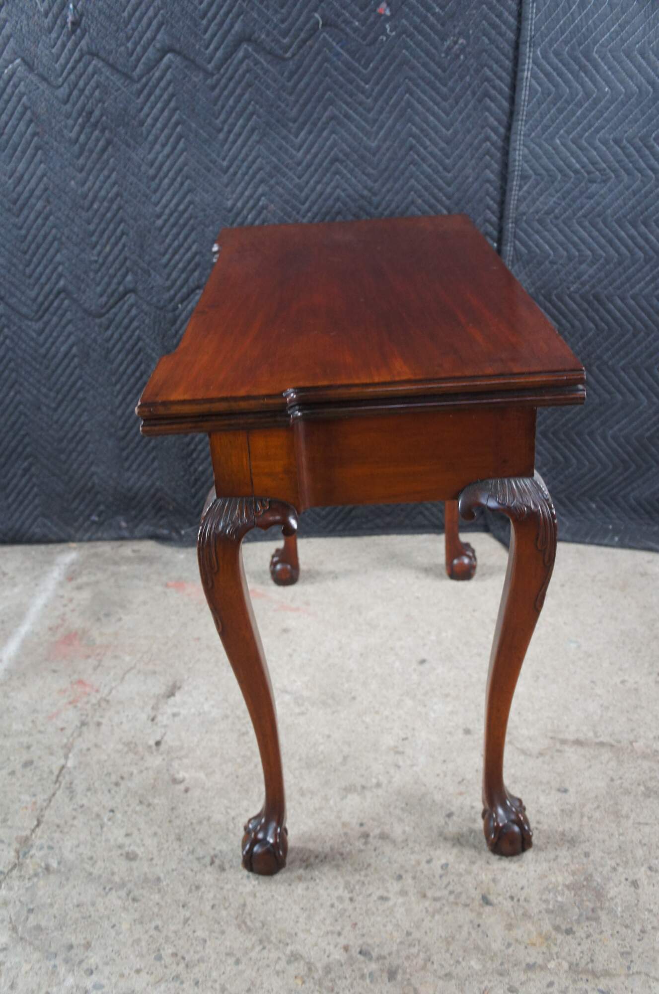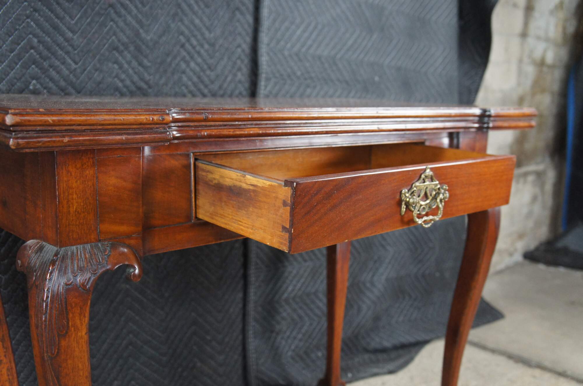 Mid 19th Century English George II Style Card / Game Table. Features a retangular form with recessed centers over a hand dovetailed frieze drawer with ornate scaled brass bale pull. The table is supported by long cabriole legs with carved knees terminating into ball and claw feet. The left rear legs swivels back to support the table when in the extended position. Perfect for use in an entry or library setting.