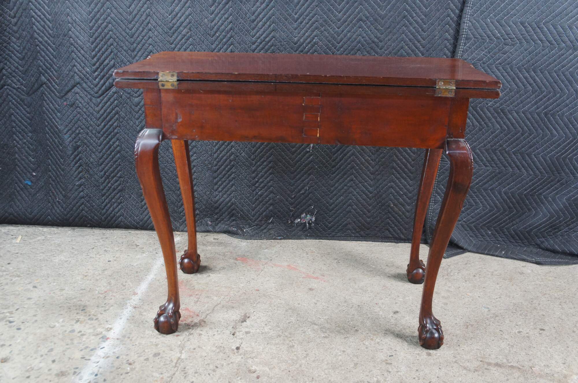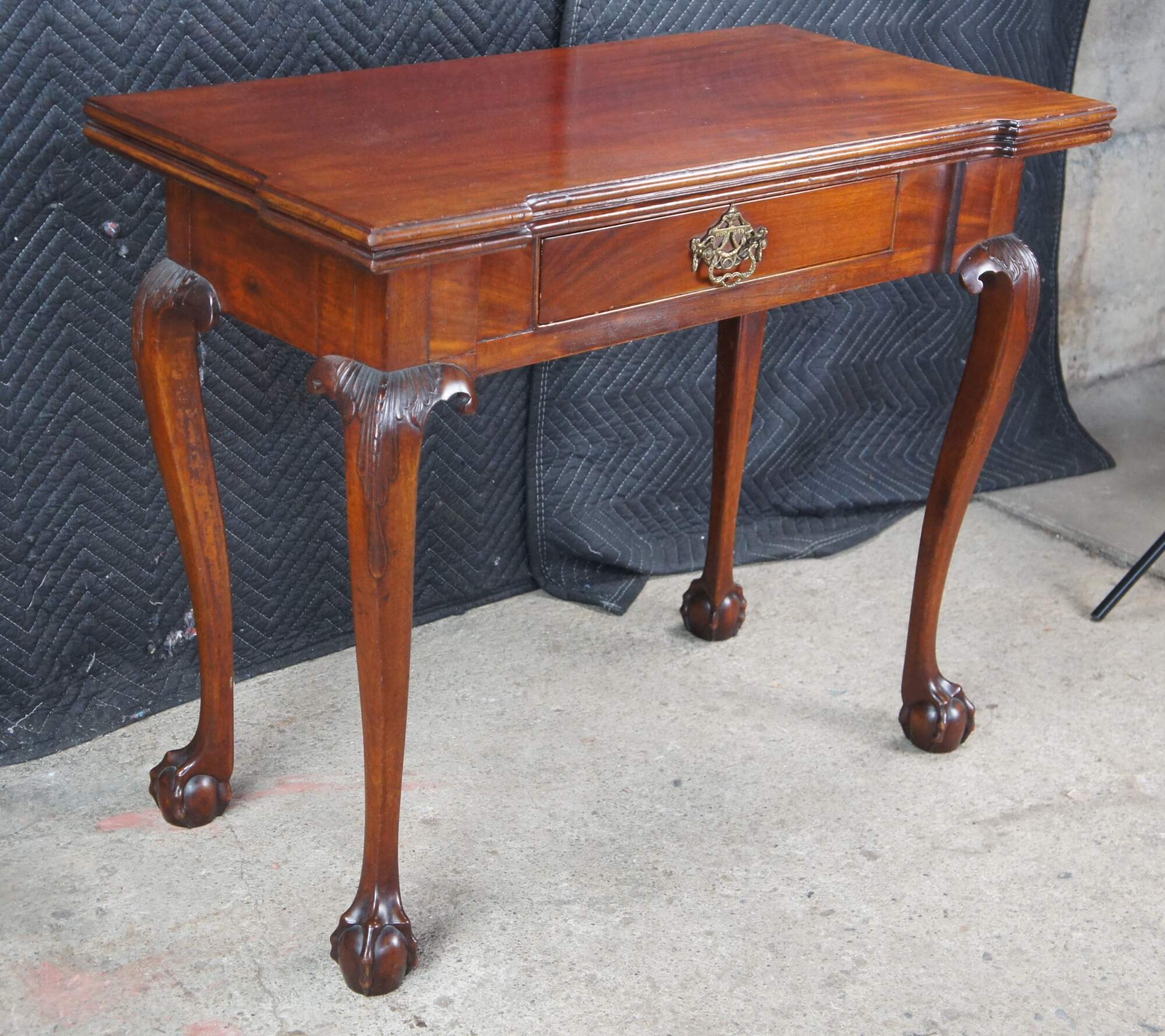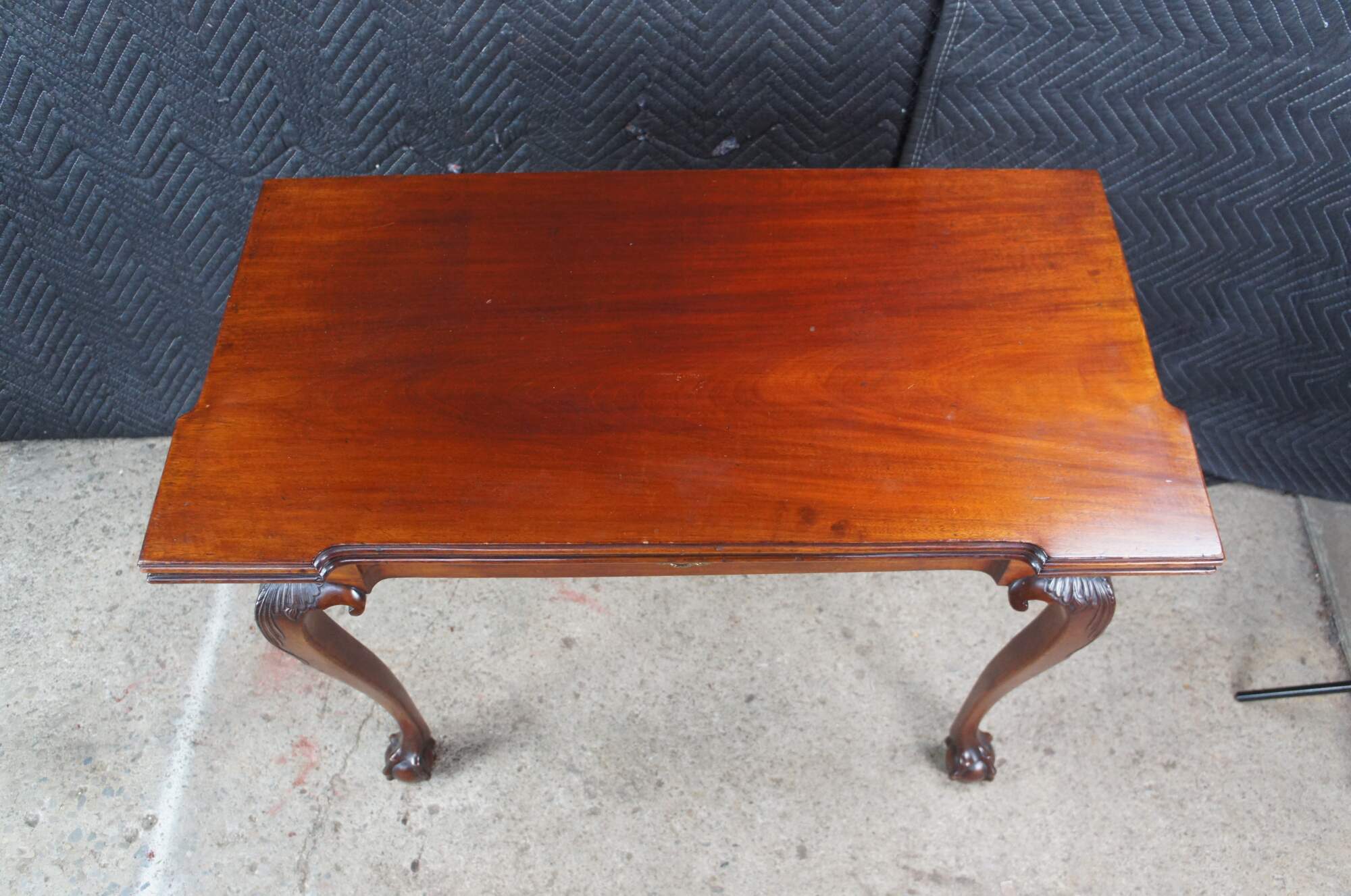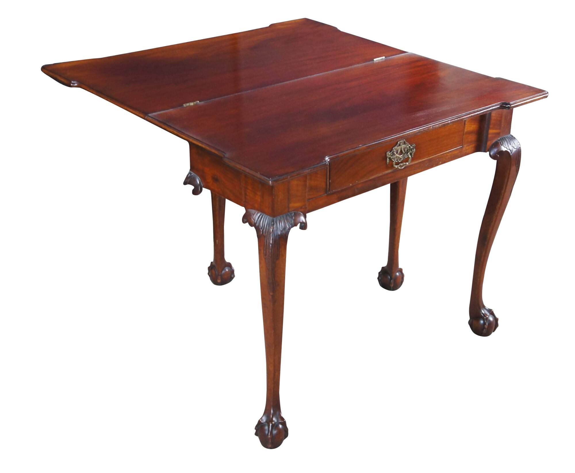 Mid 19th Century English George II Style Card / Game Table. Features a retangular form with recessed centers over a hand dovetailed frieze drawer with ornate scaled brass bale pull. The table is supported by long cabriole legs with carved knees terminating into ball and claw feet. The left rear legs swivels back to support the table when in the extended position. Perfect for use in an entry or library setting.